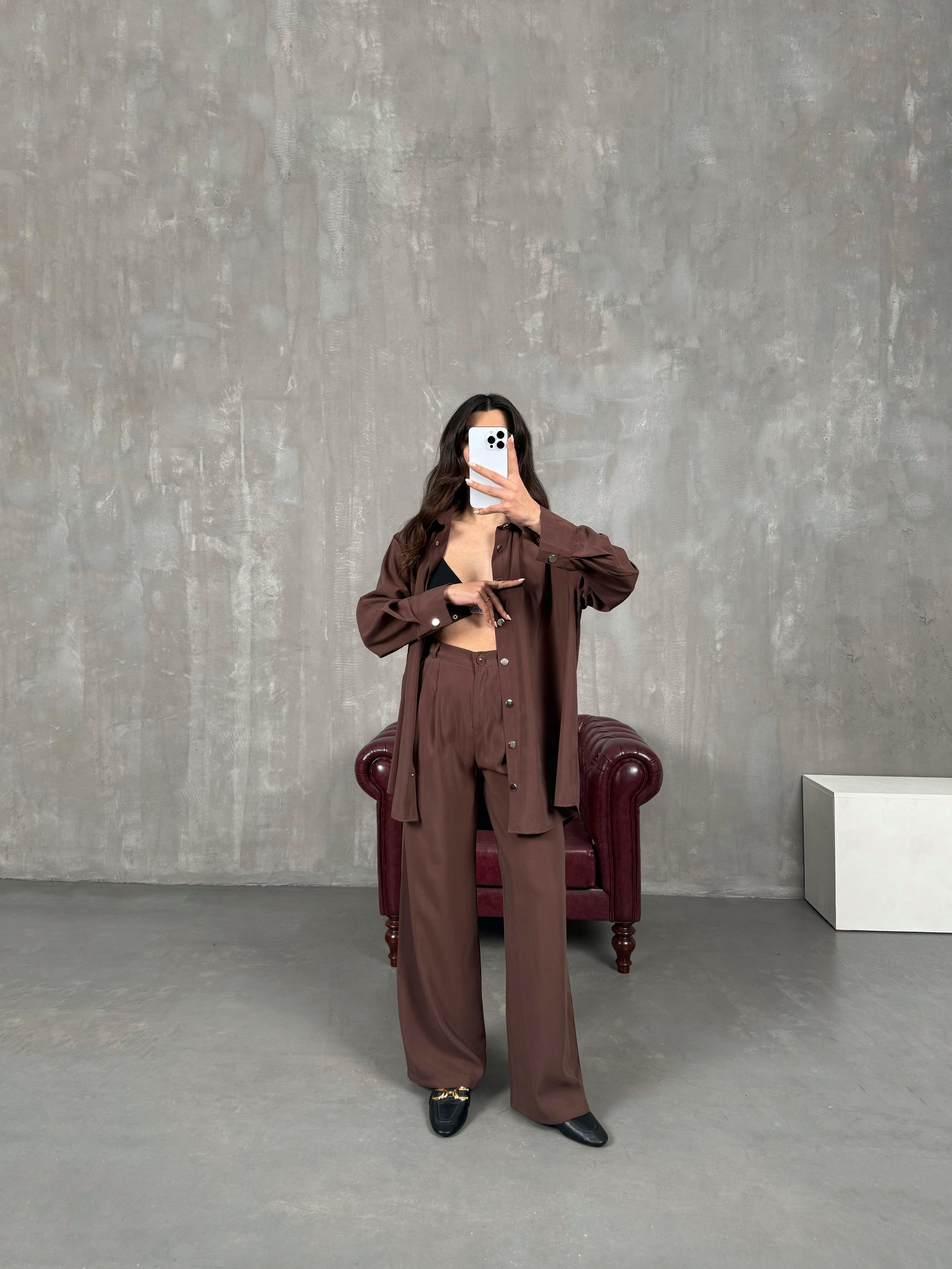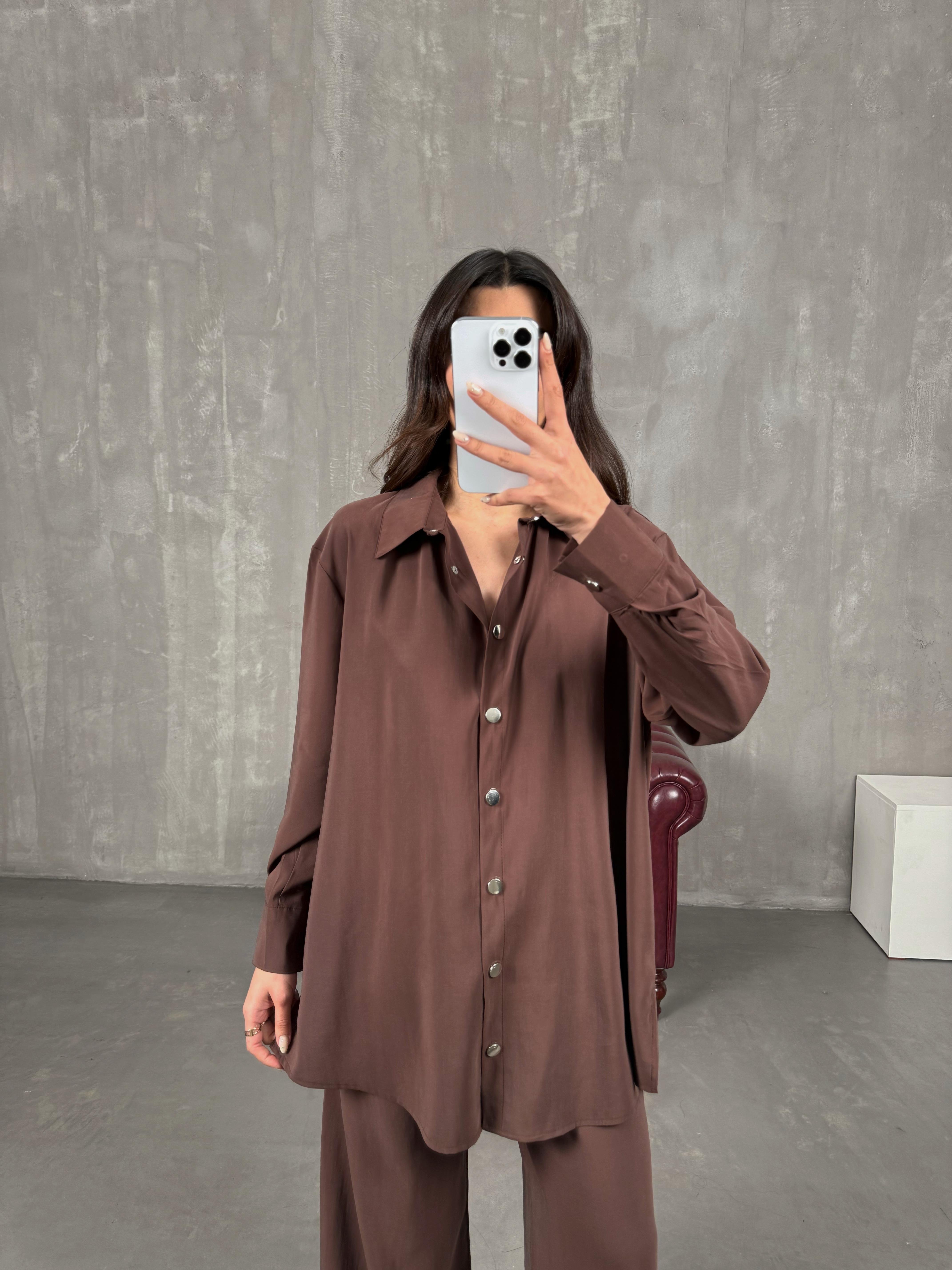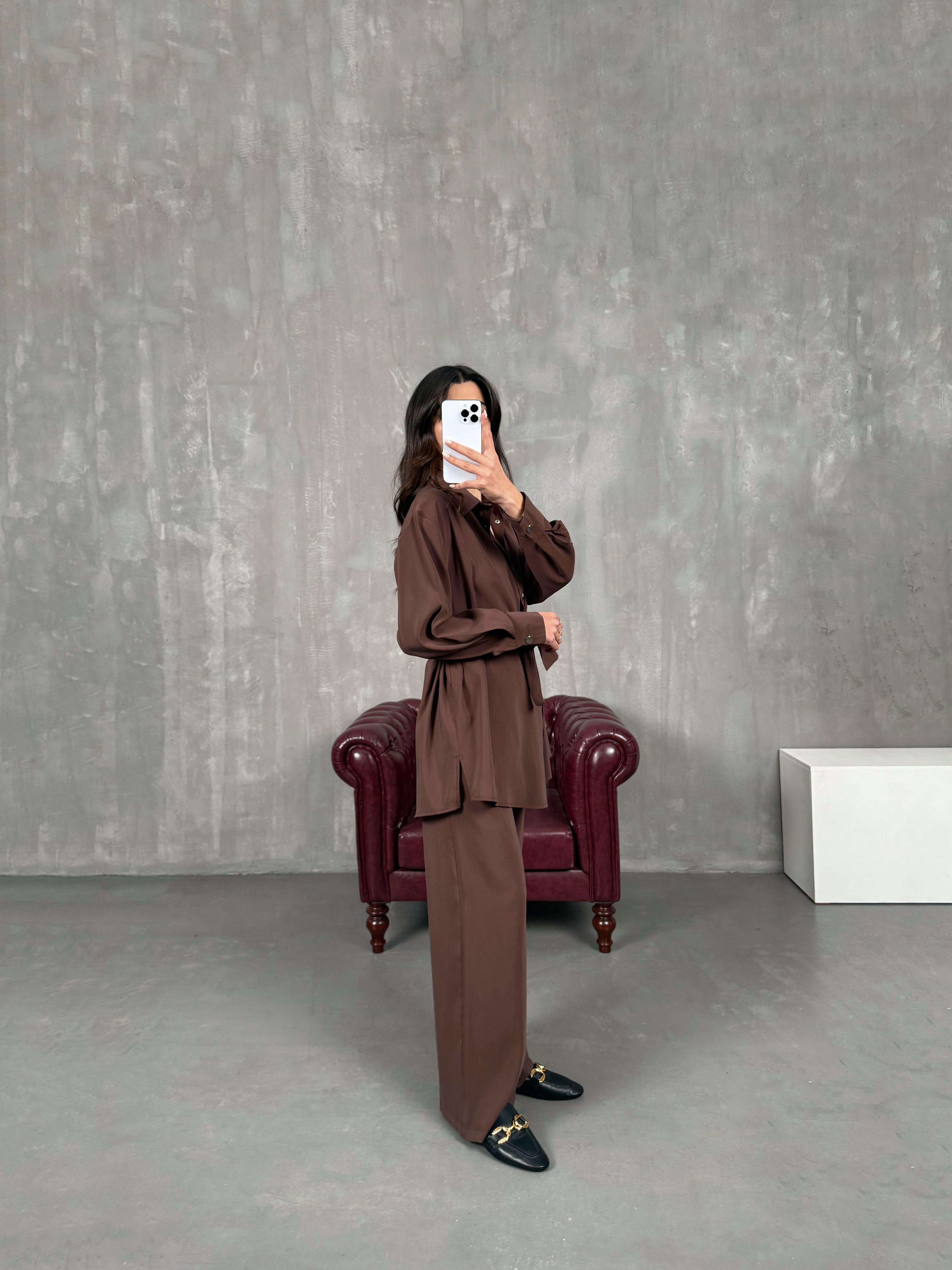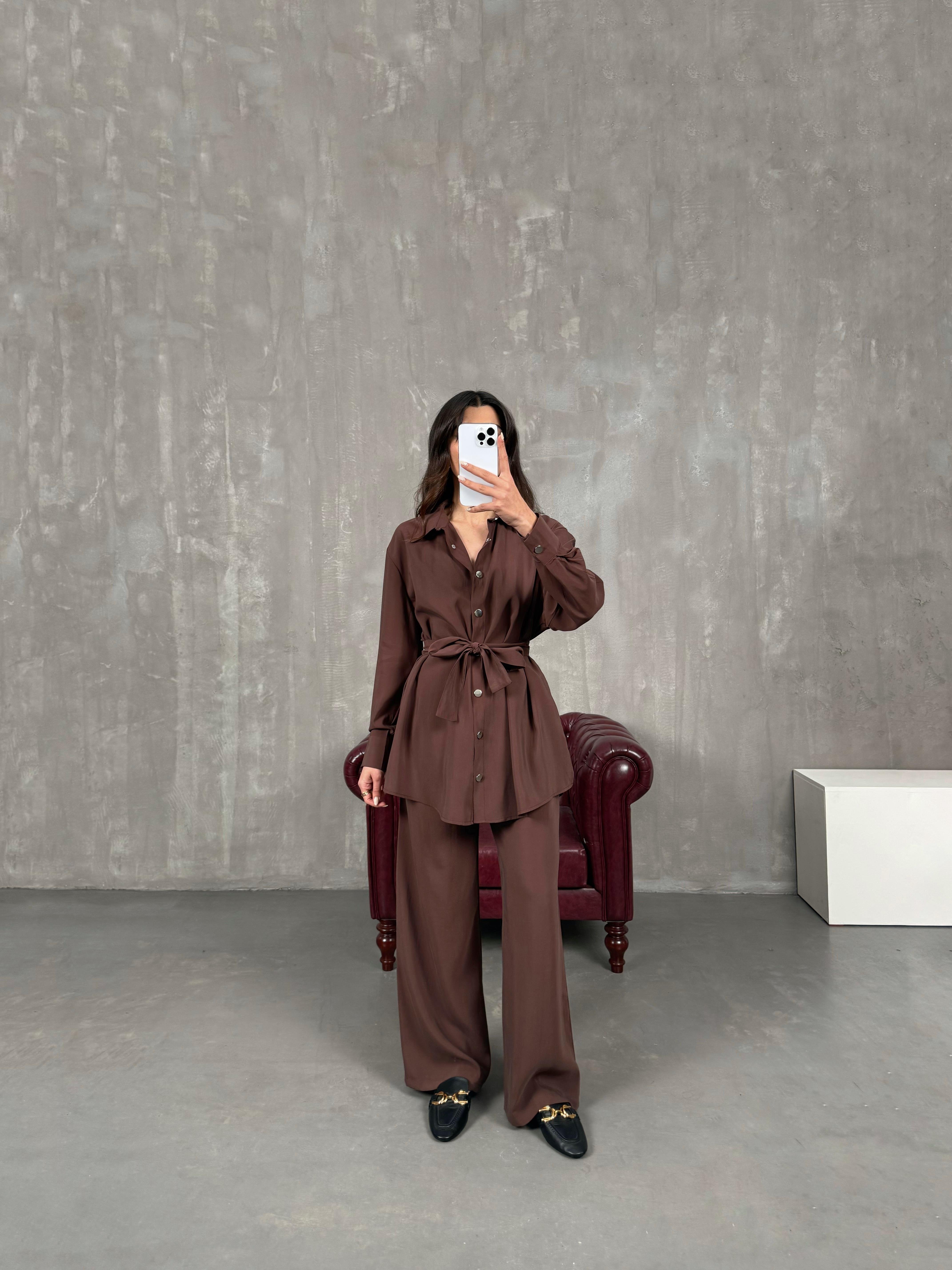 سونيا طقم بني داكن قماش تينسيل بأزرار كبس مع زنّار