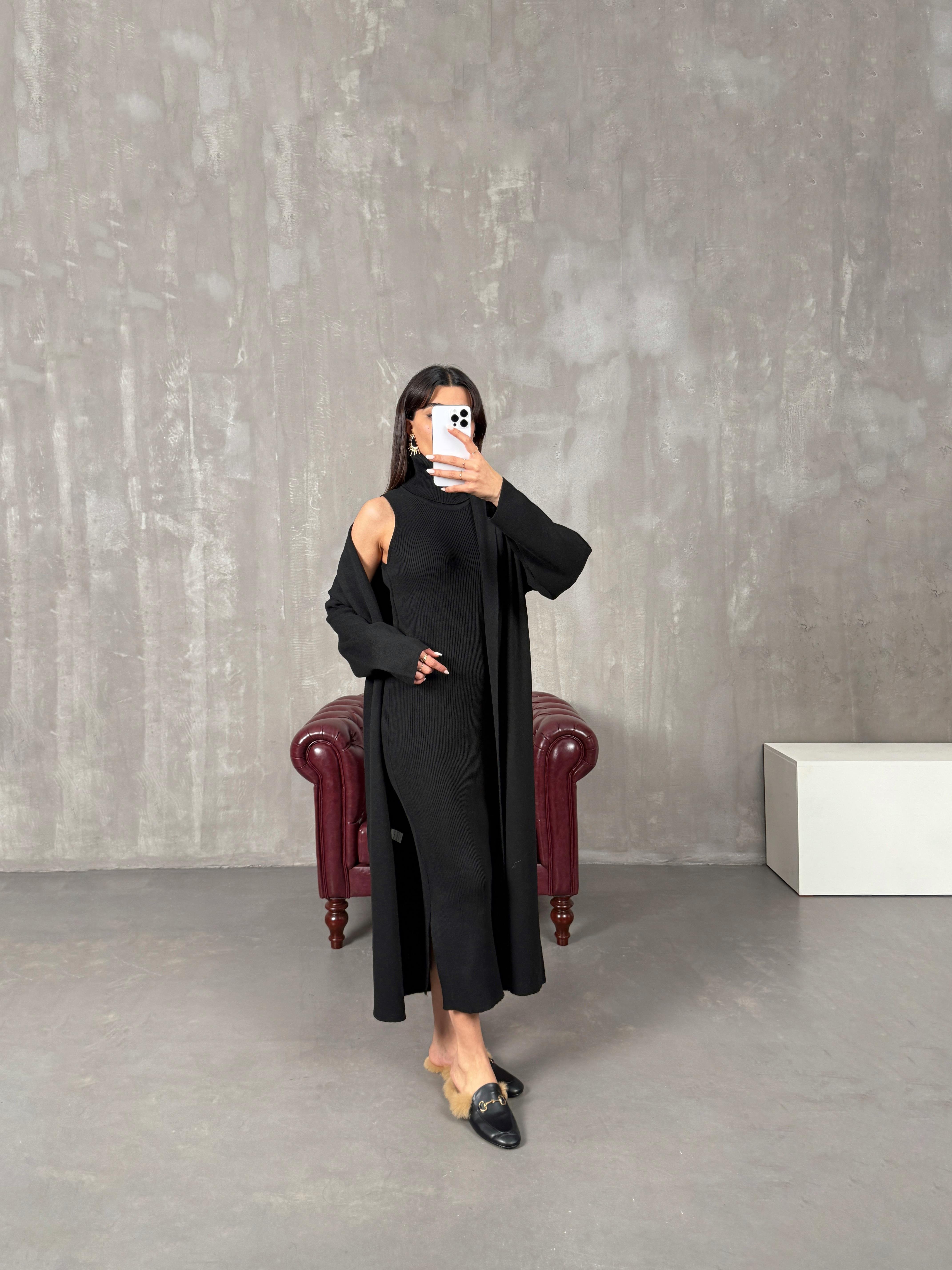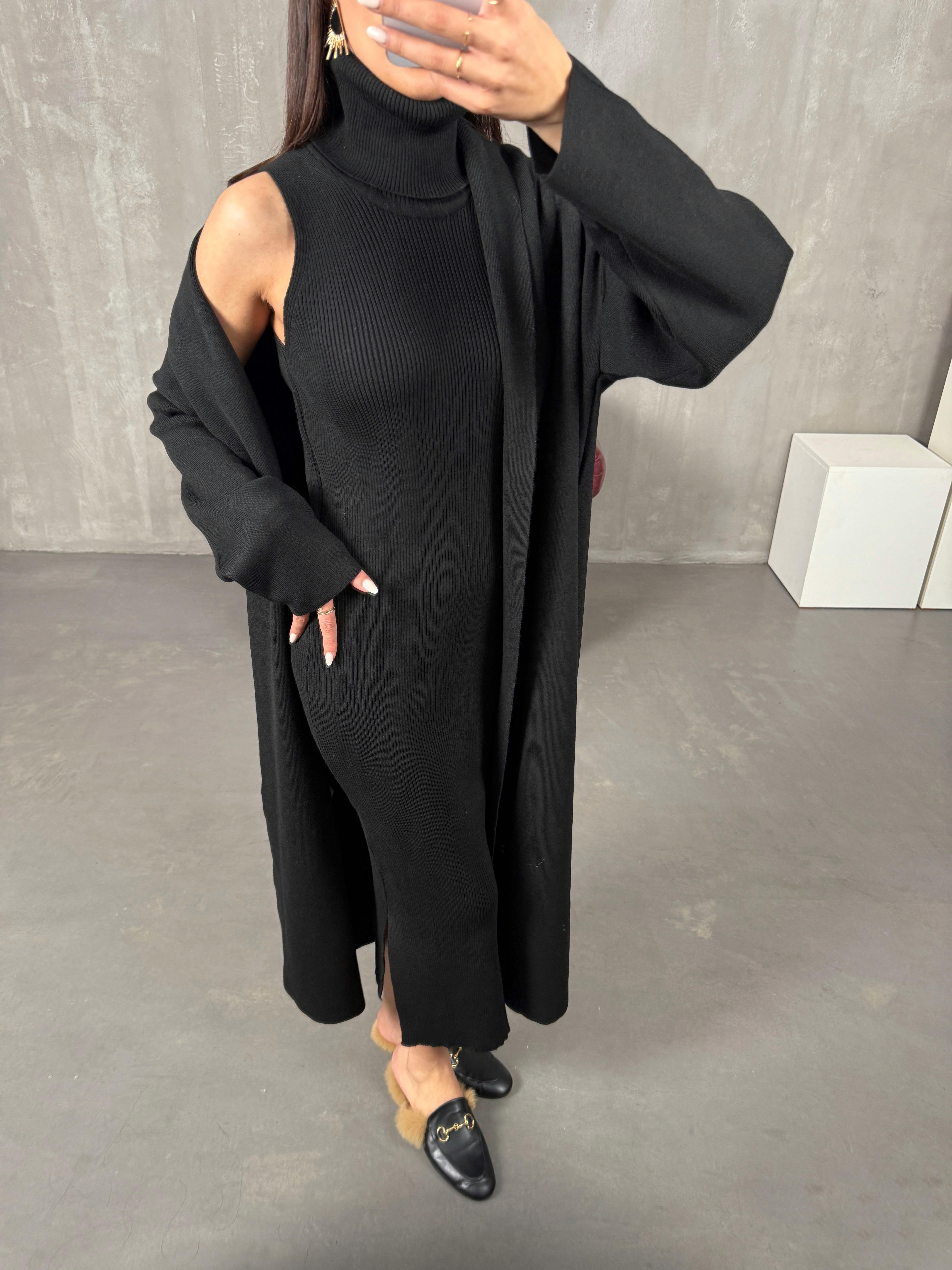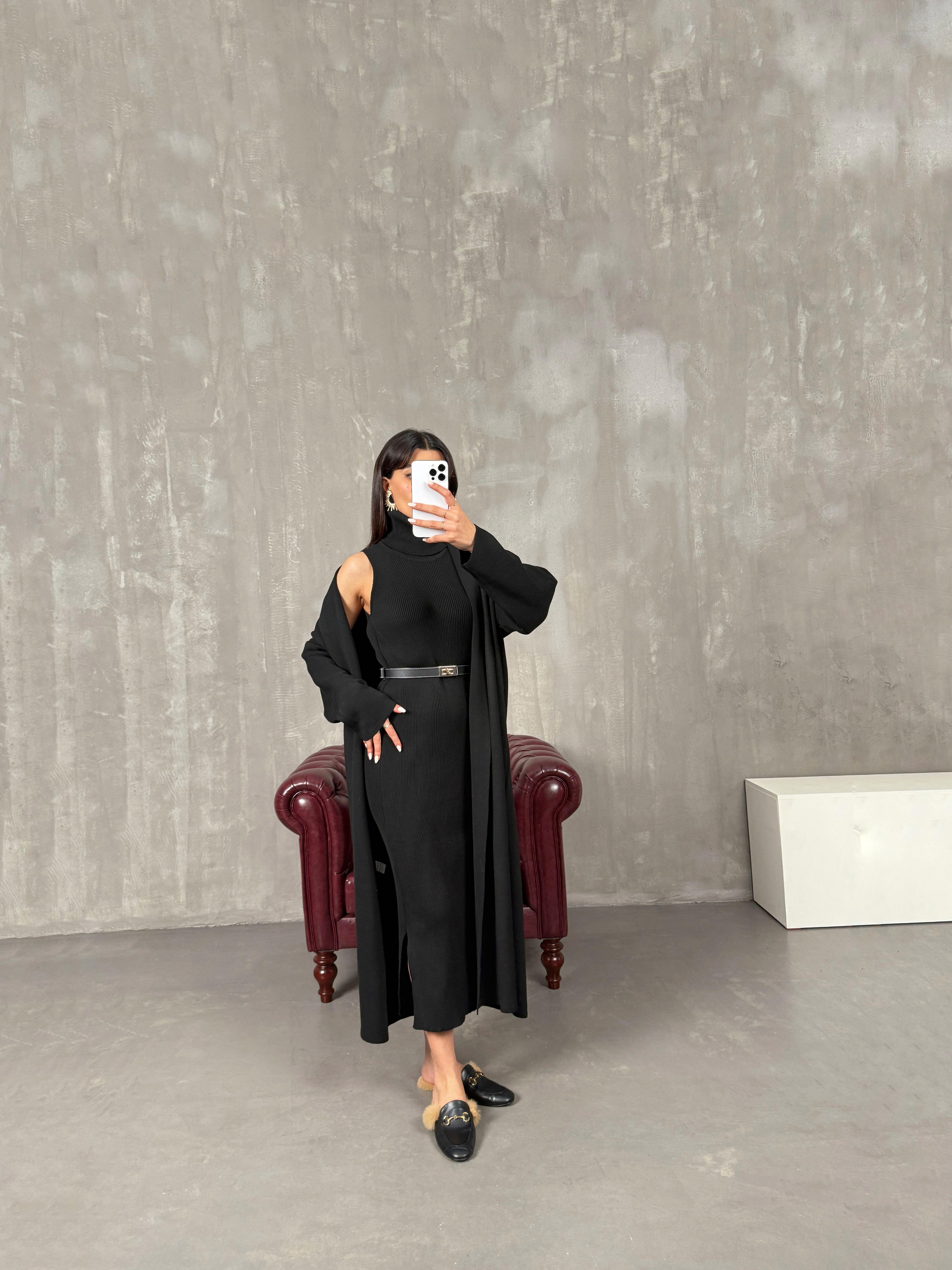 Sores Siyah Balıkçı Yaka Yandan Yırtmaçlı Elbise Triko Hırka İkili Takım
