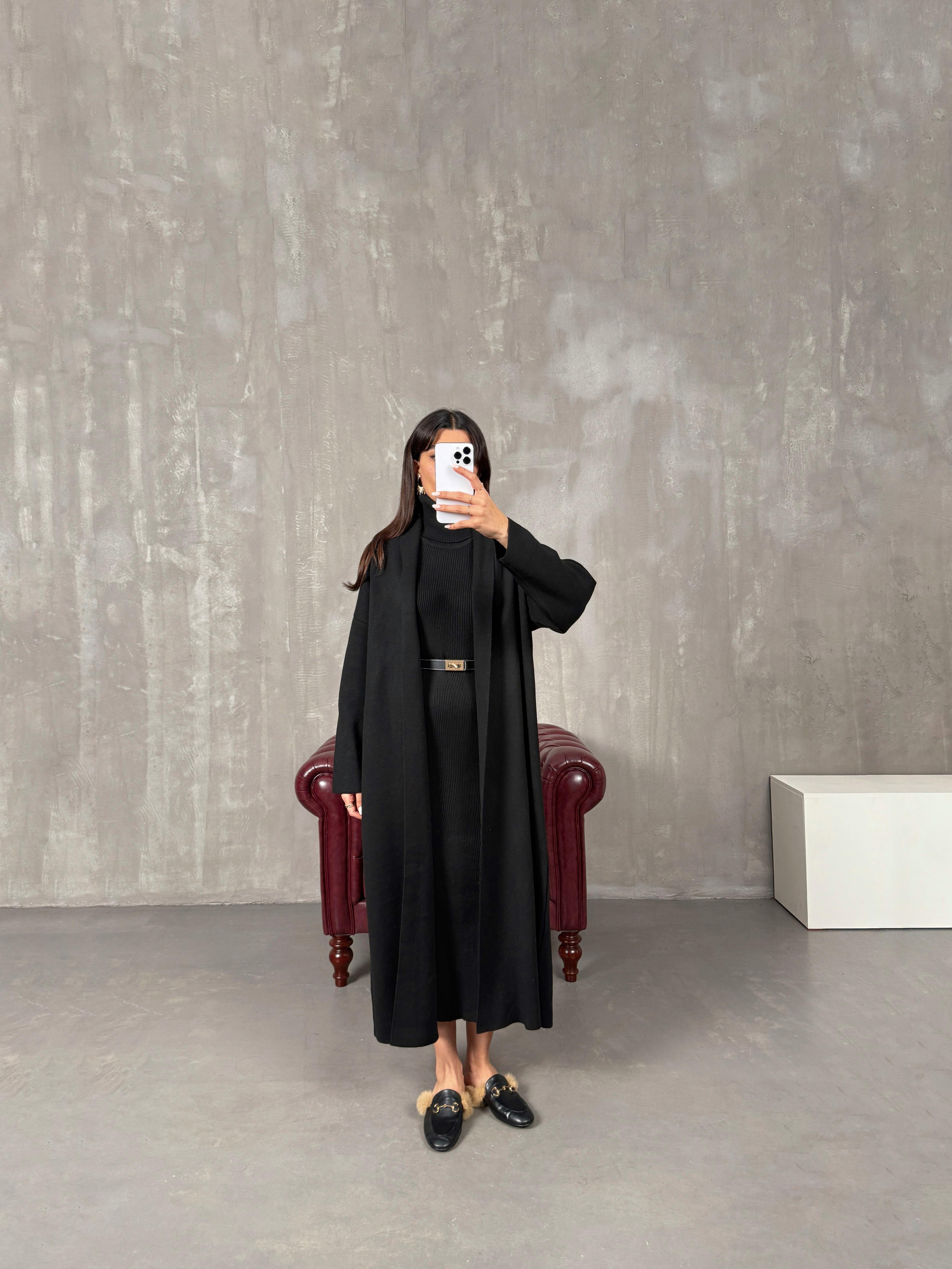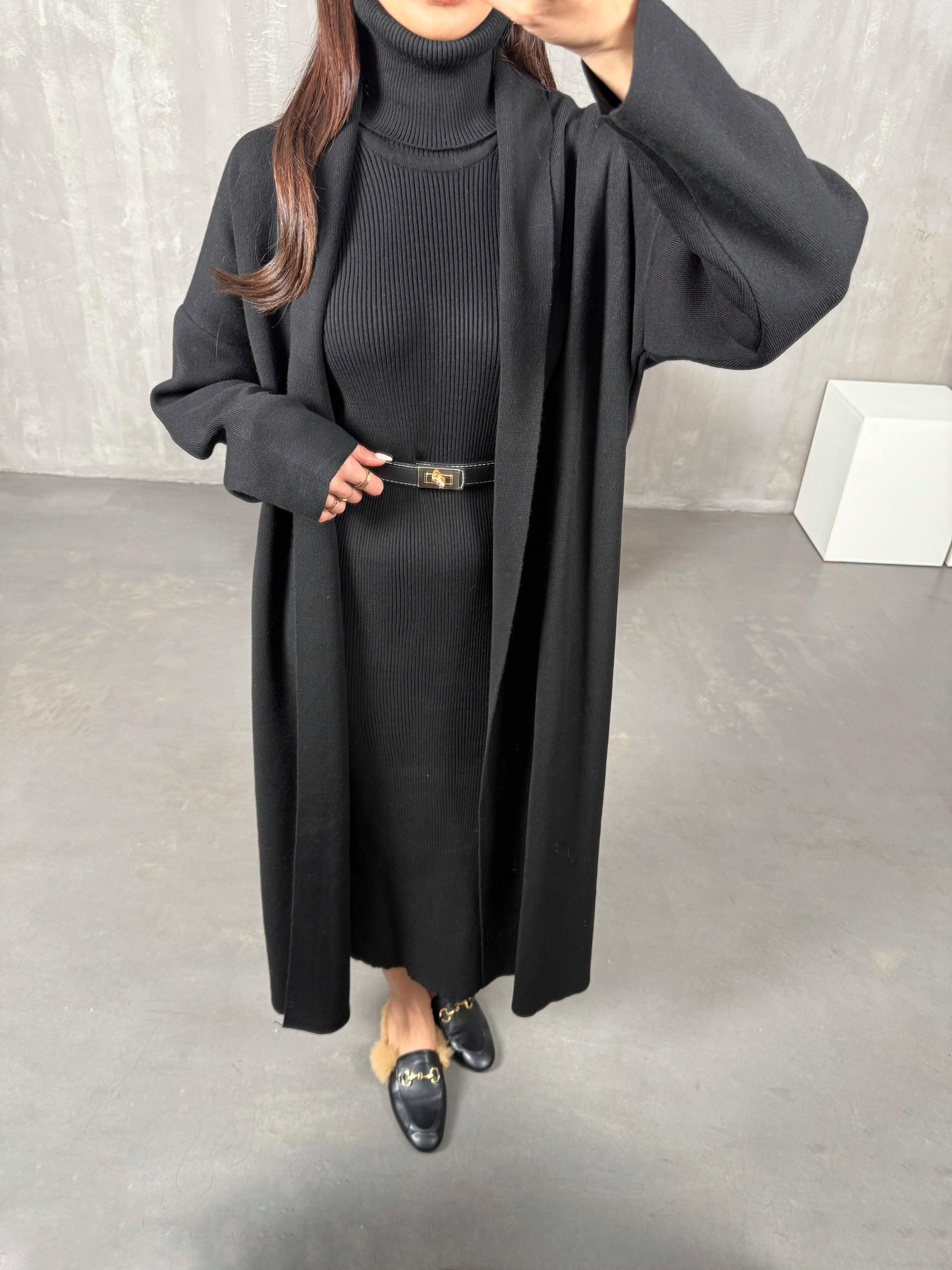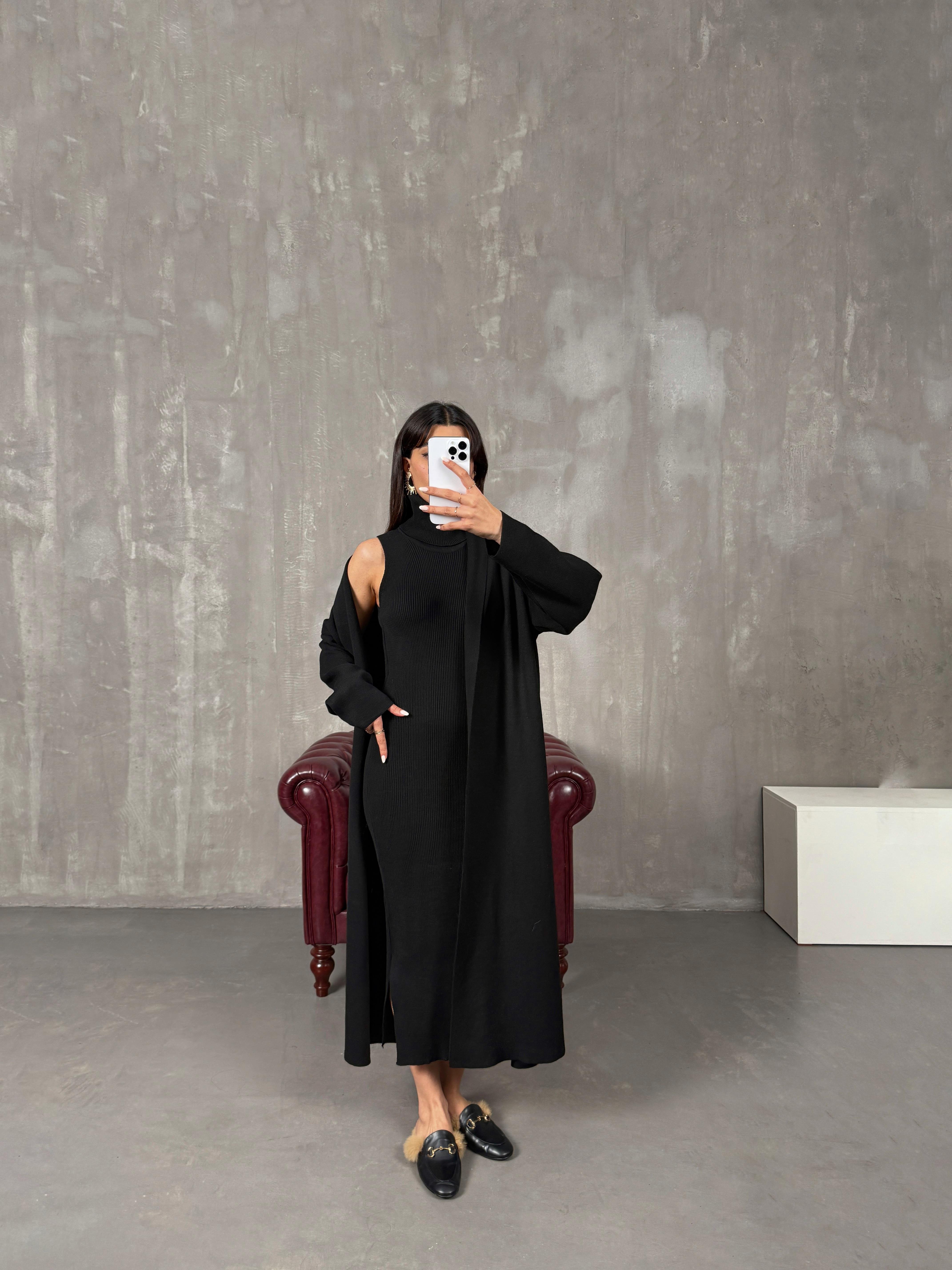 Sores Siyah Balıkçı Yaka Yandan Yırtmaçlı Elbise Triko Hırka İkili Takım