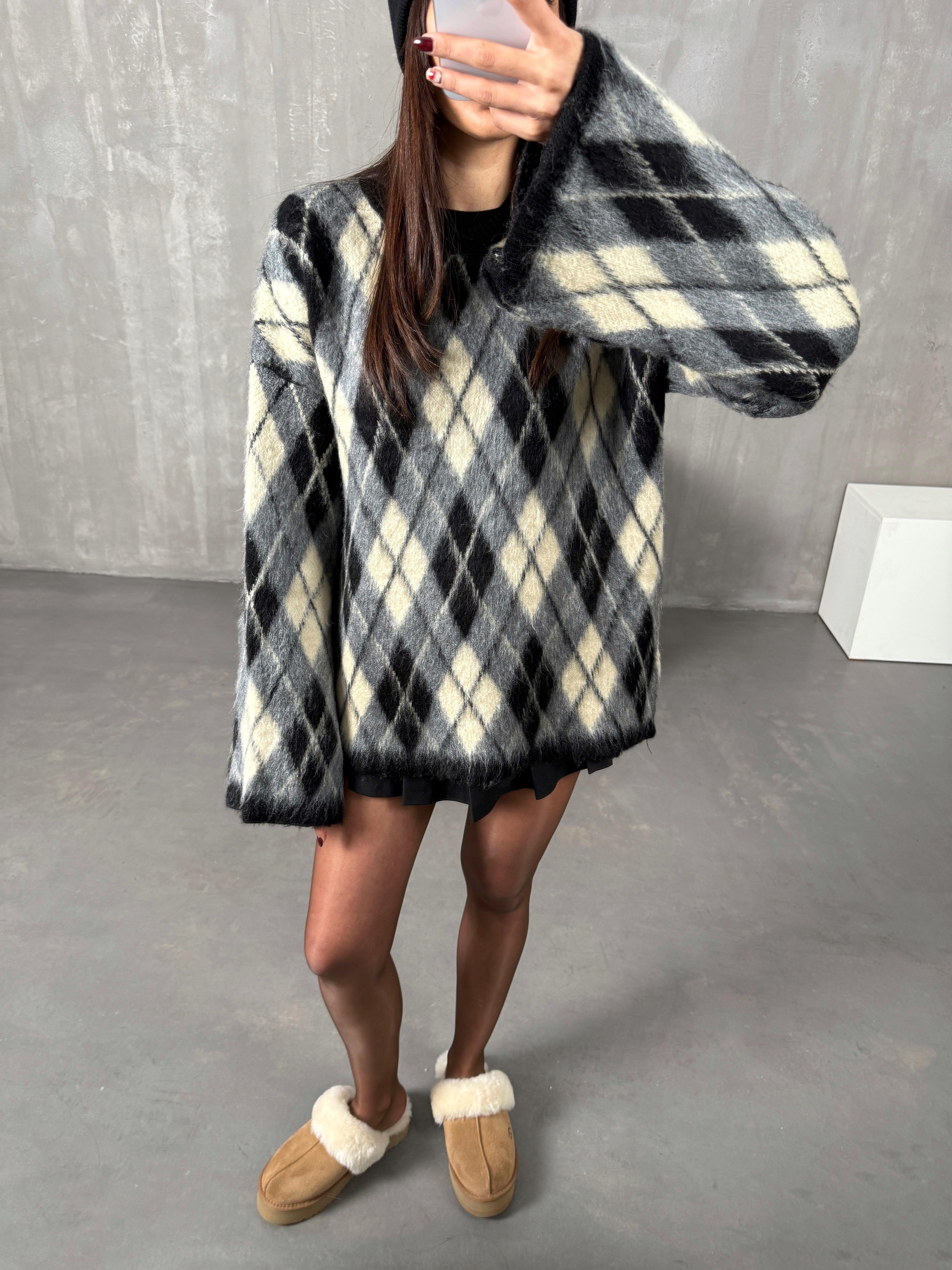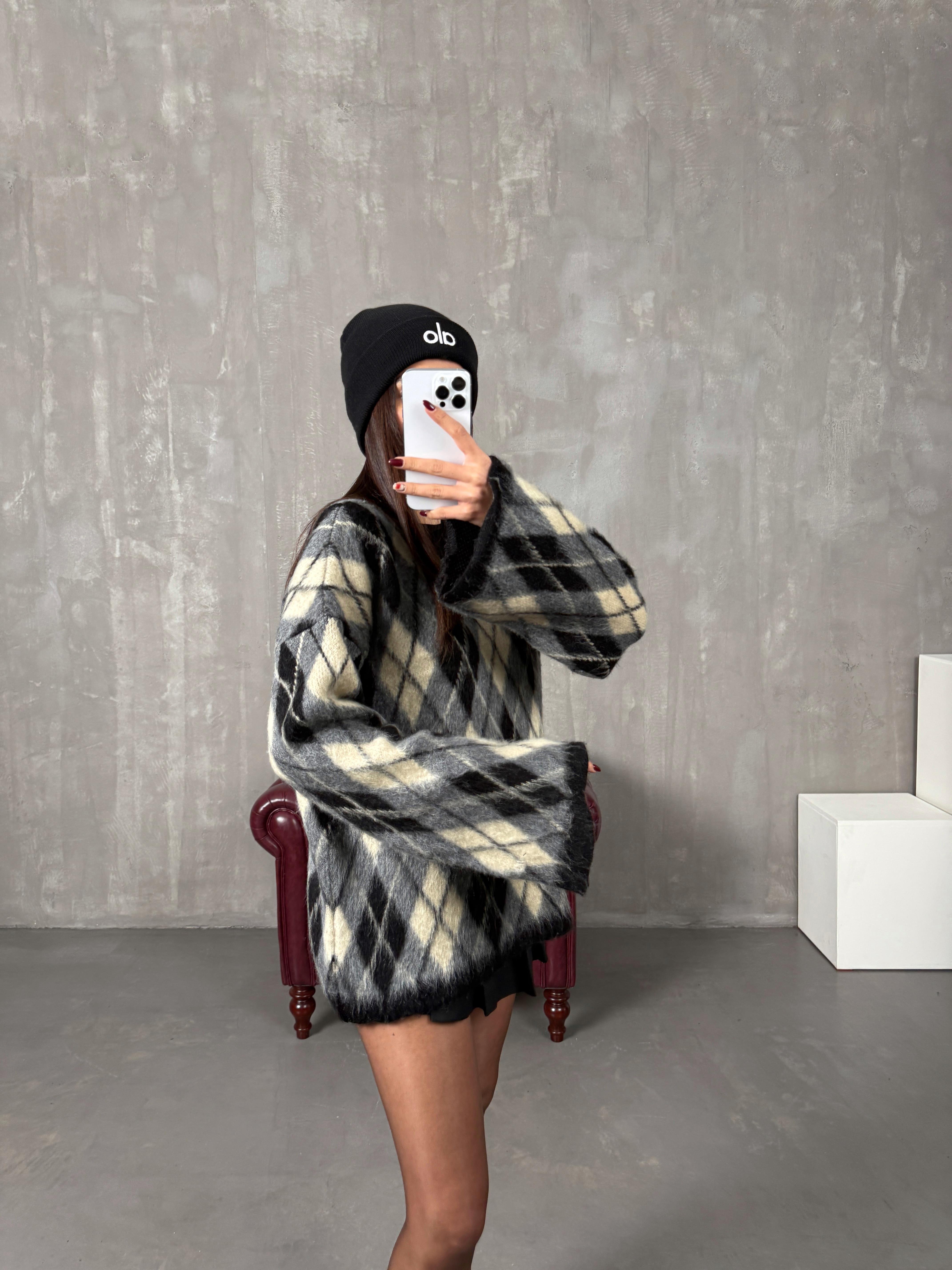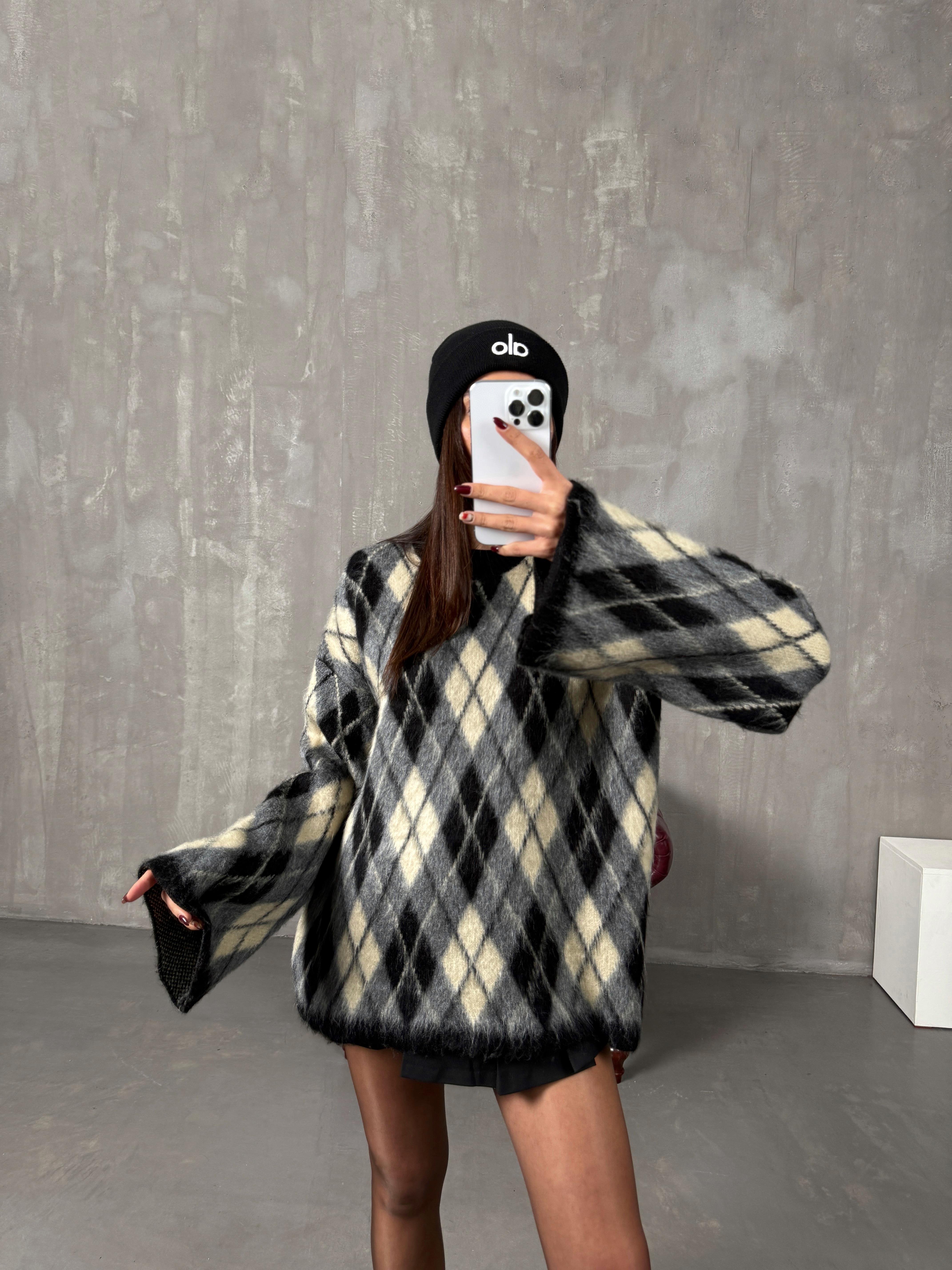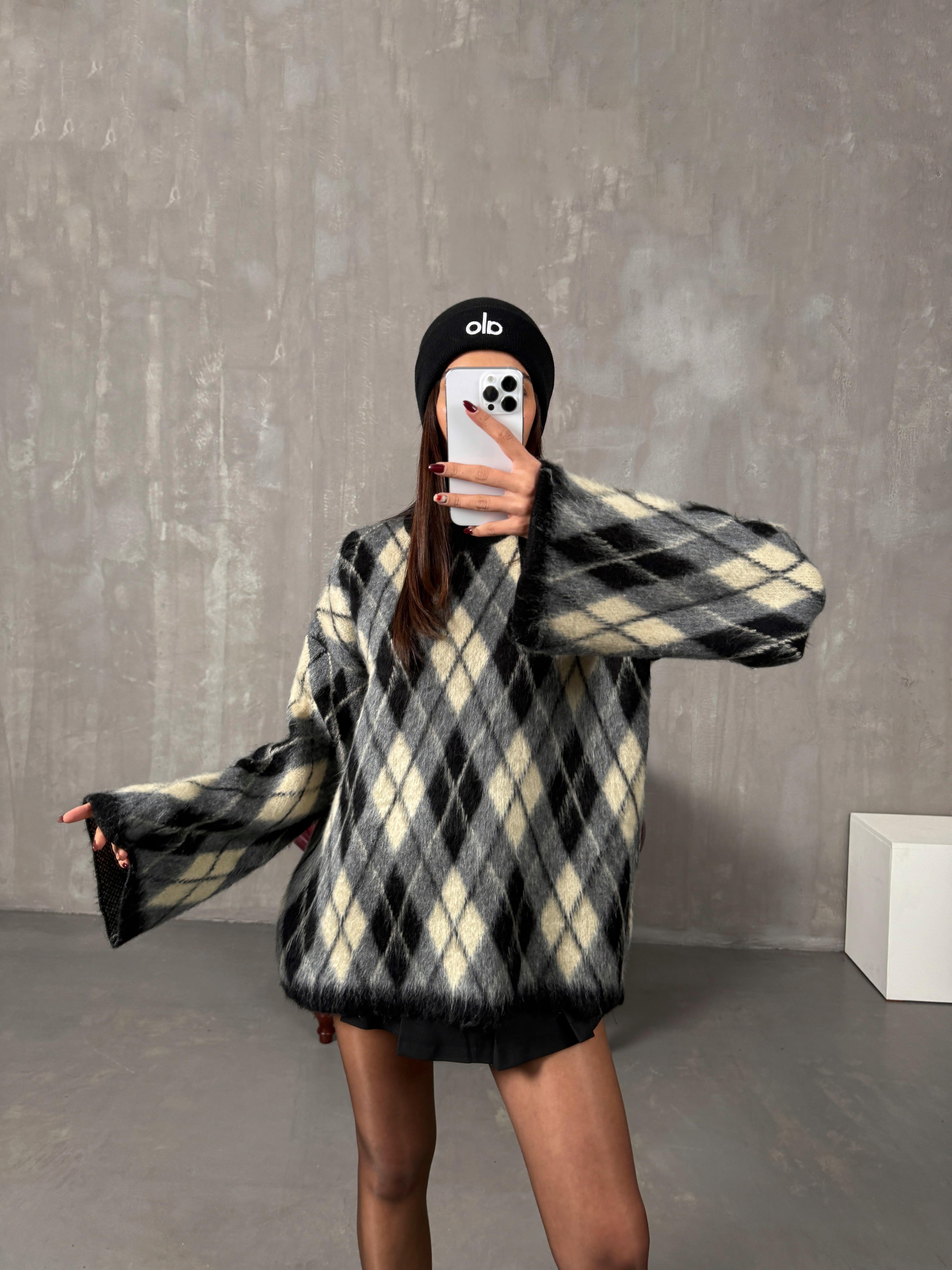 Sorte Gri Bej Karışım Baklava Desenli ZR Model Bisiklet Yaka Kazak