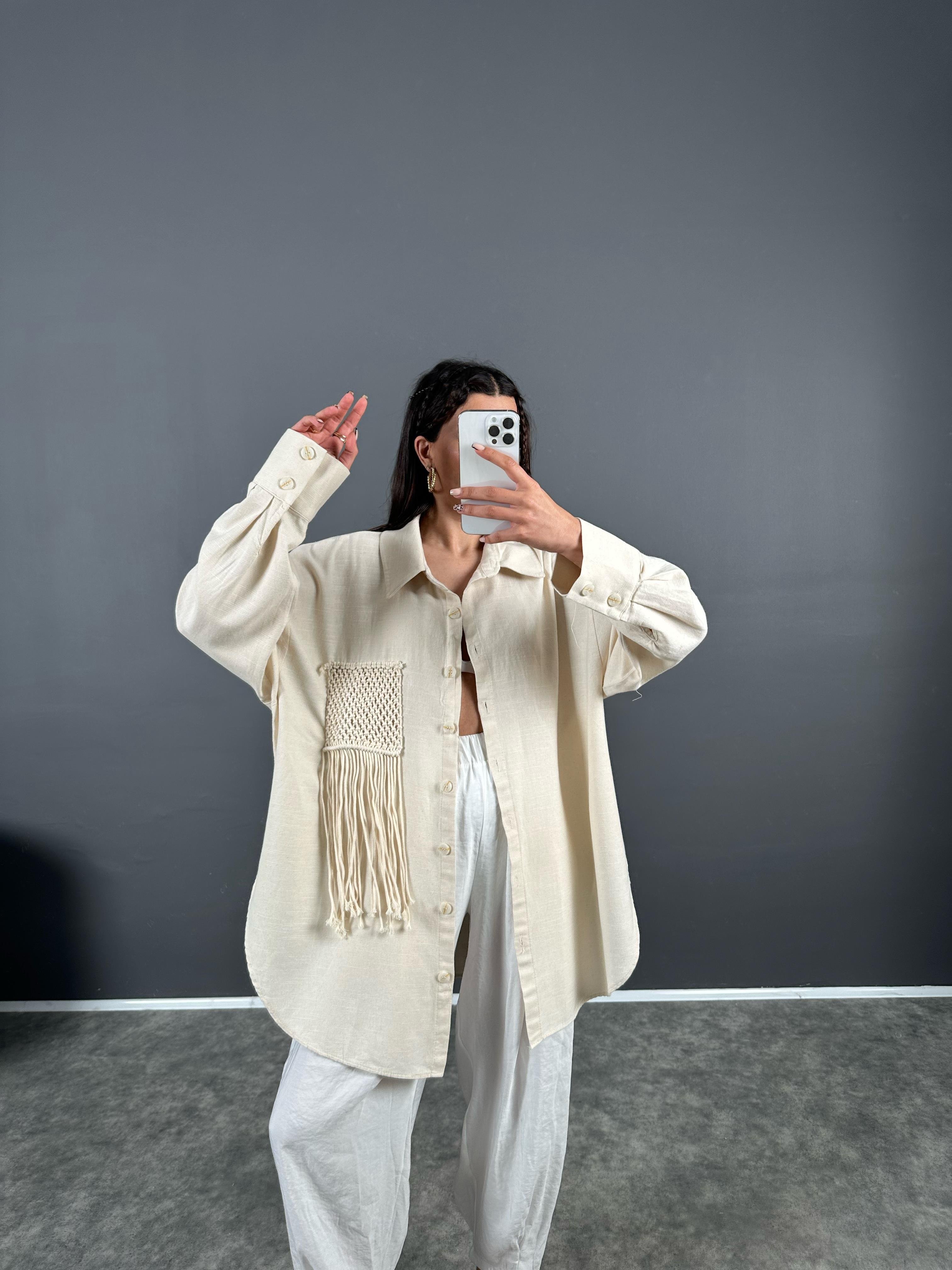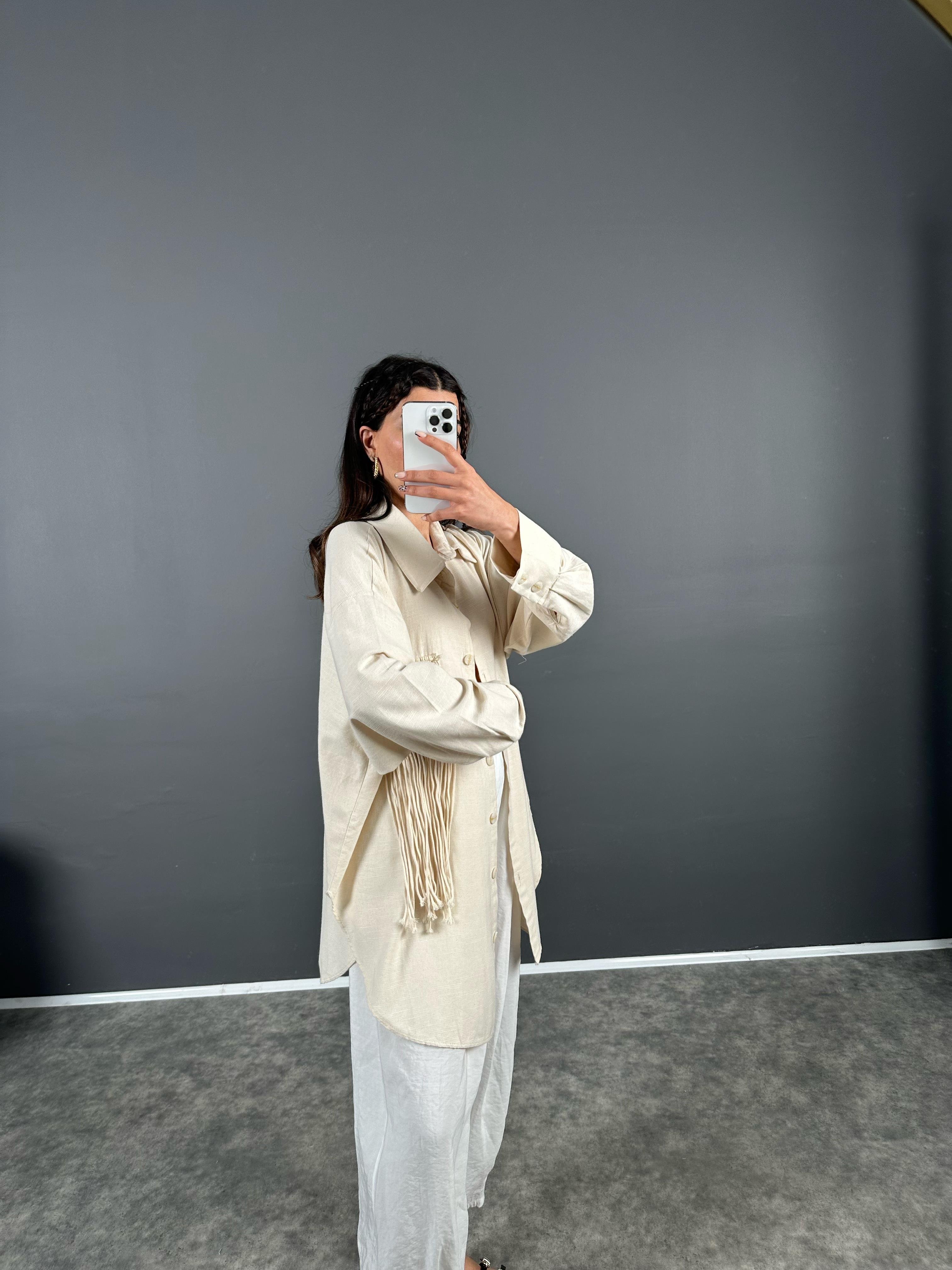 Taş Püsküllü Premium Oversize Keten Gömlek