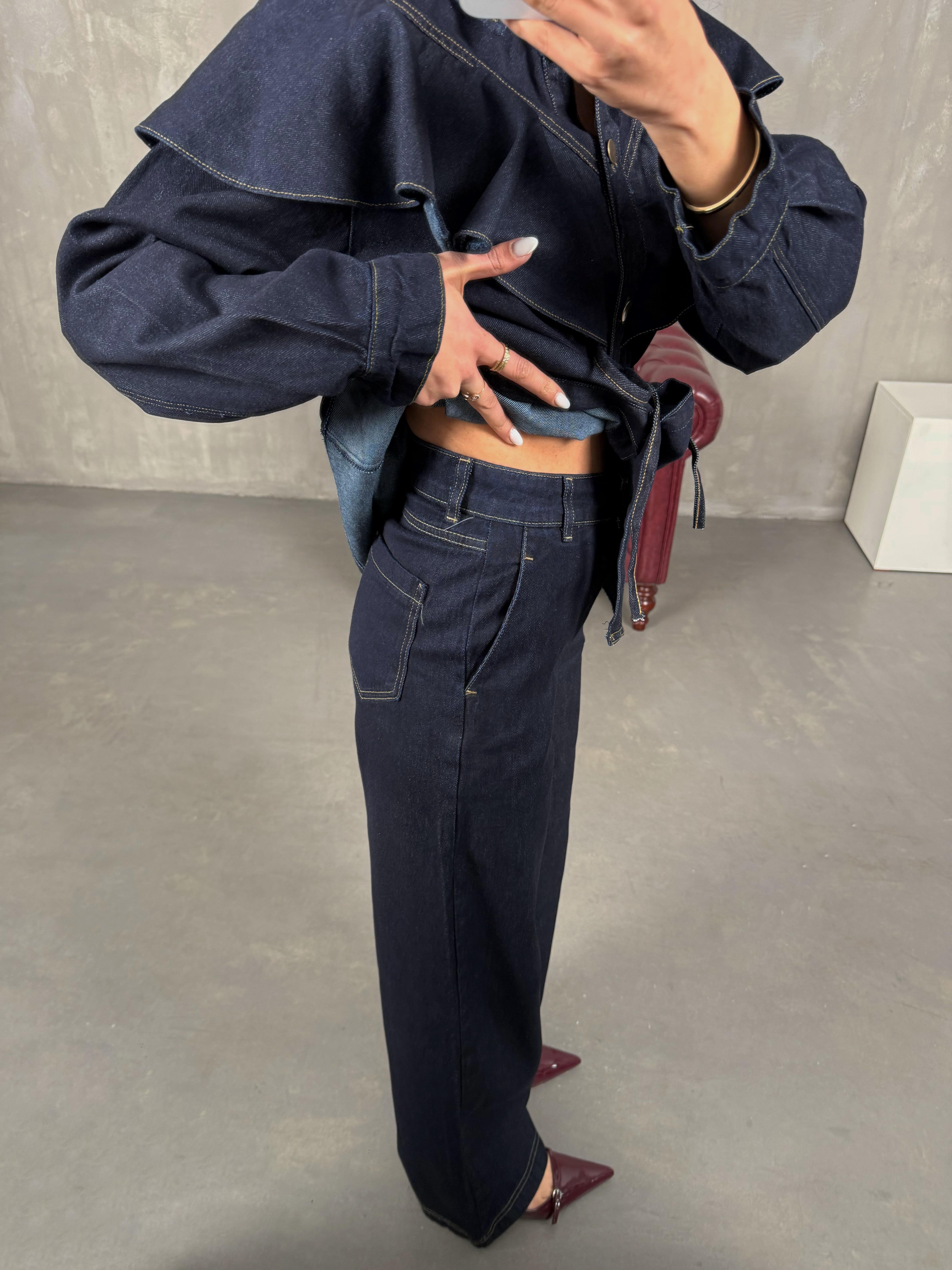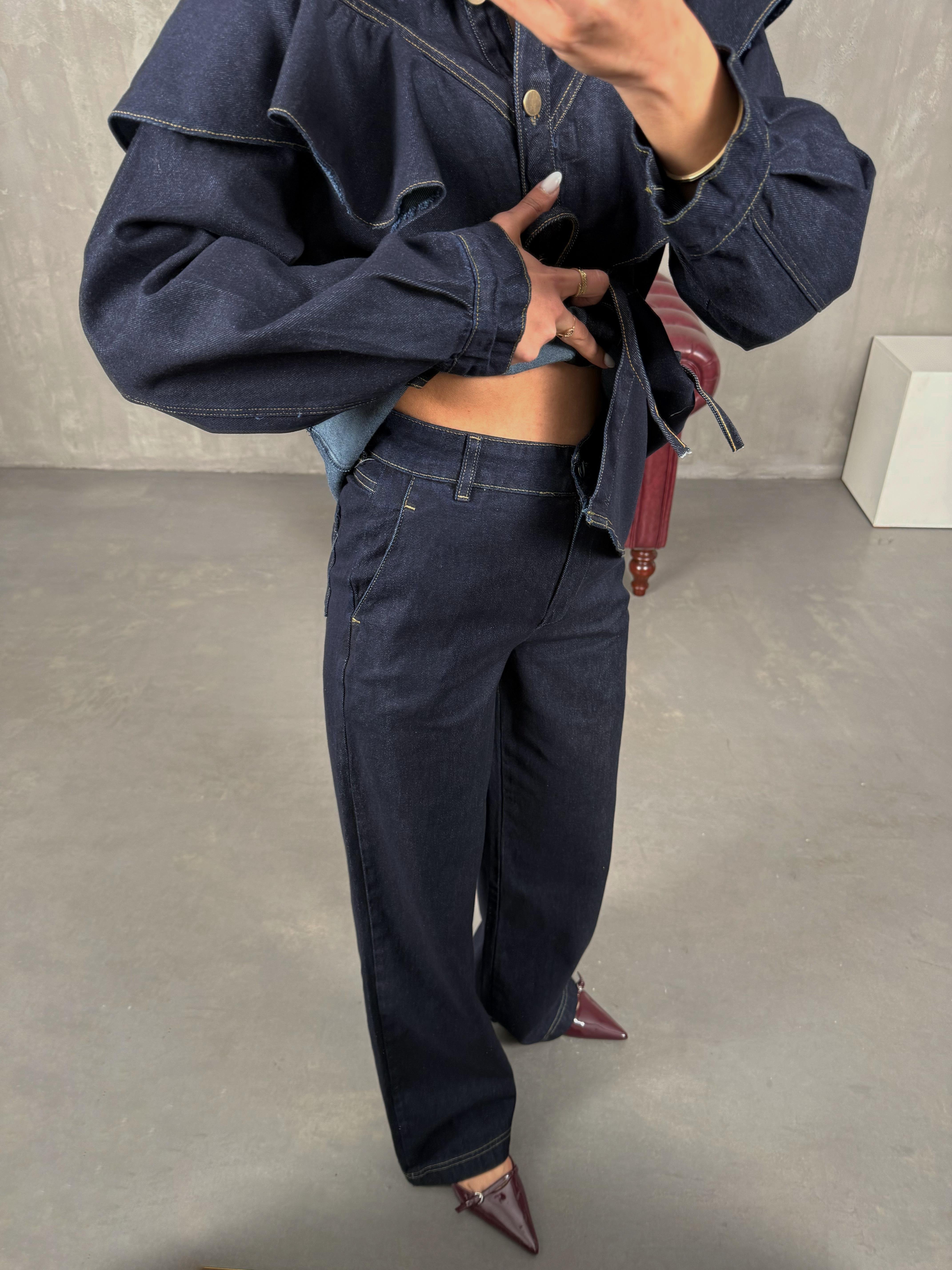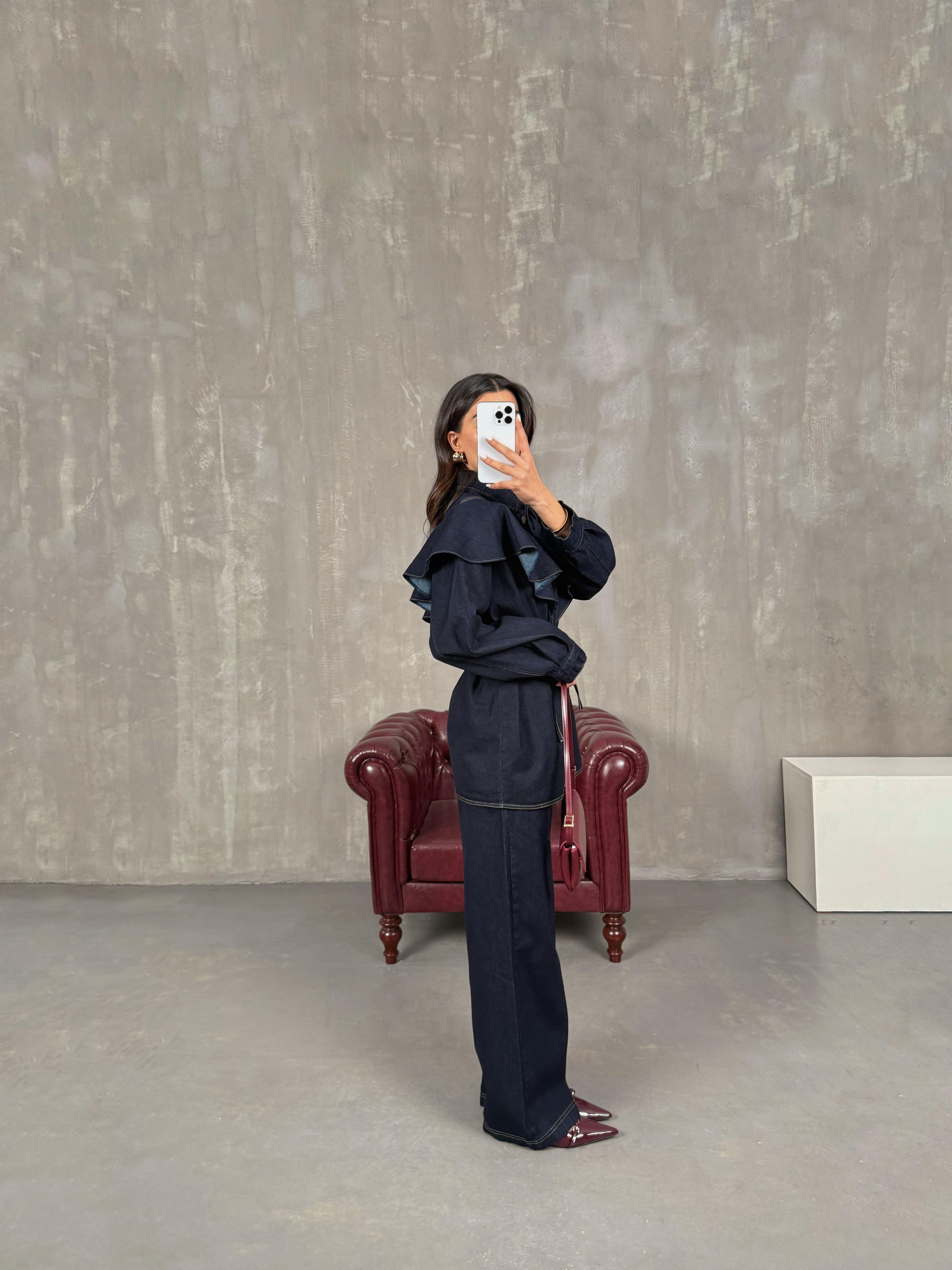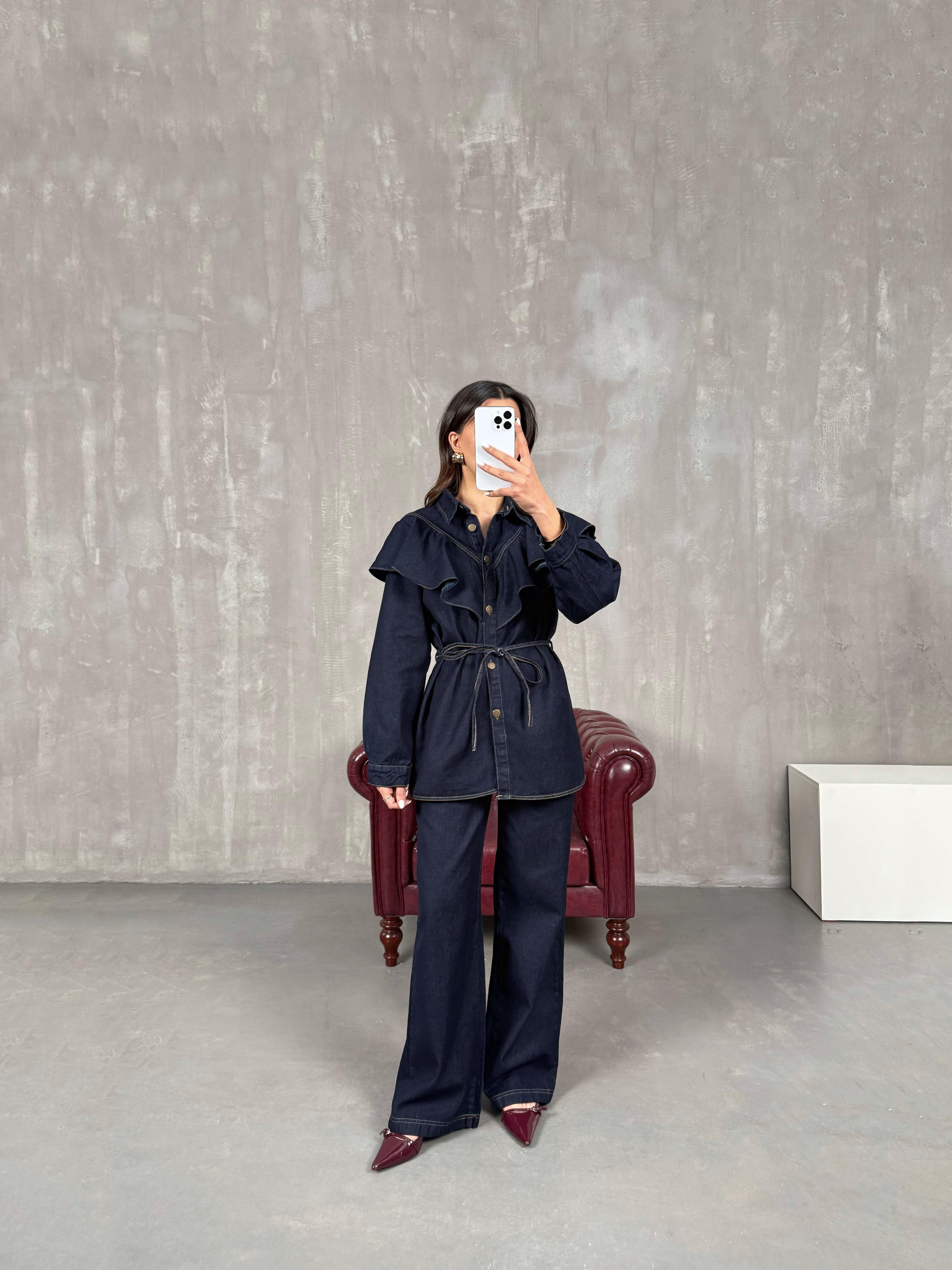 تاسيرا طقم دينيم كحلي بنطال قميص بزنّار وتفصيل ياقة مكشكشة