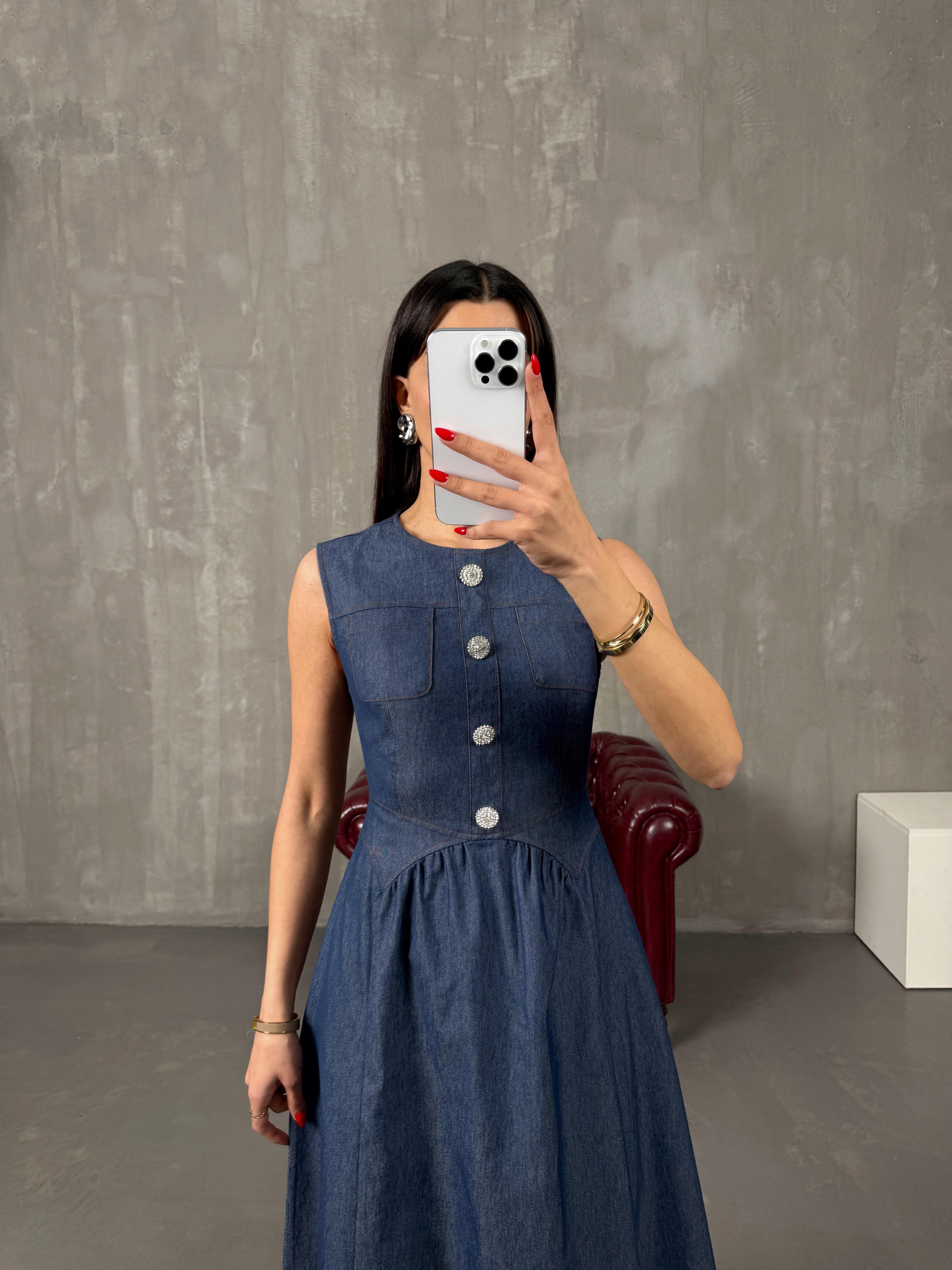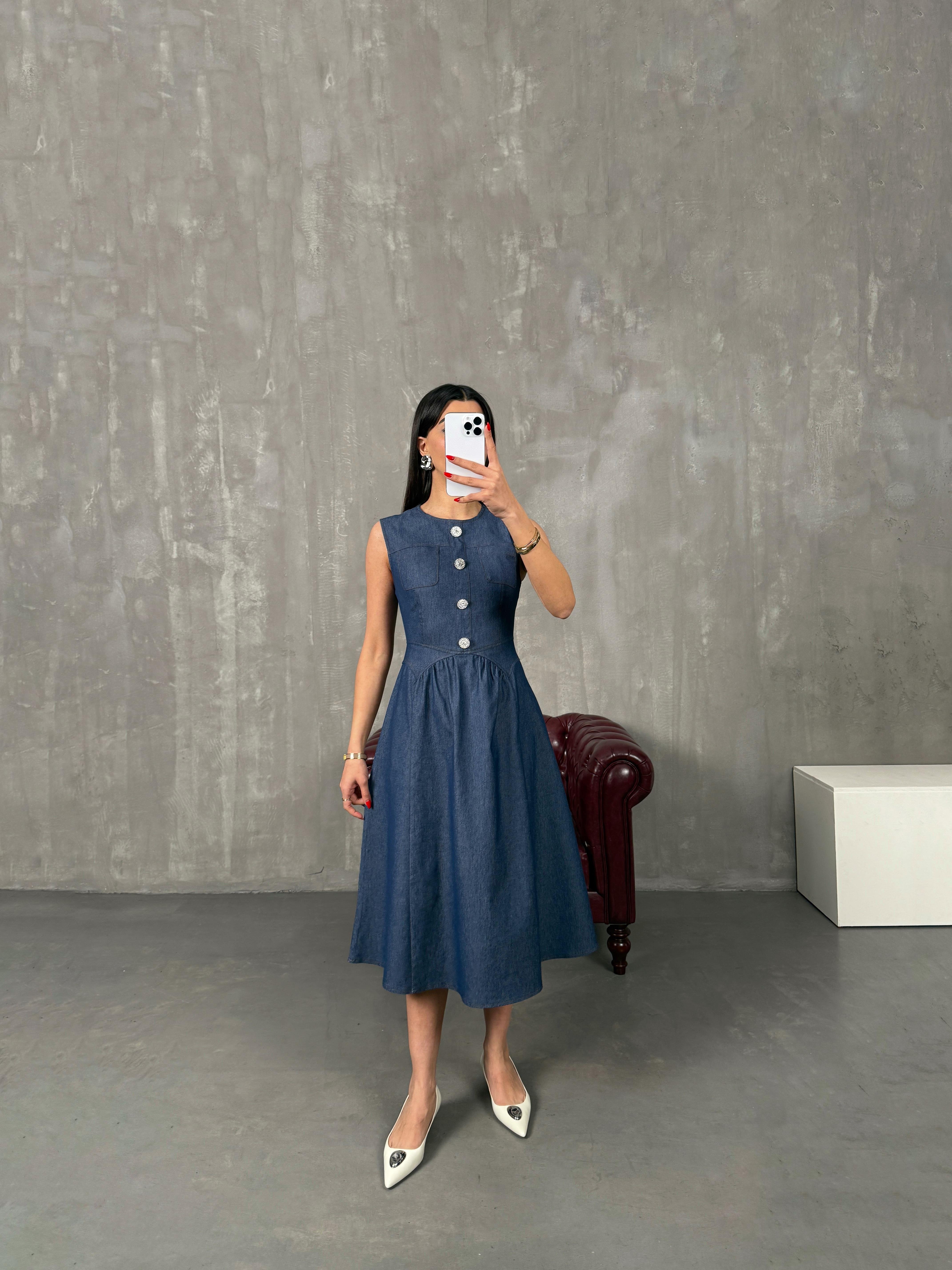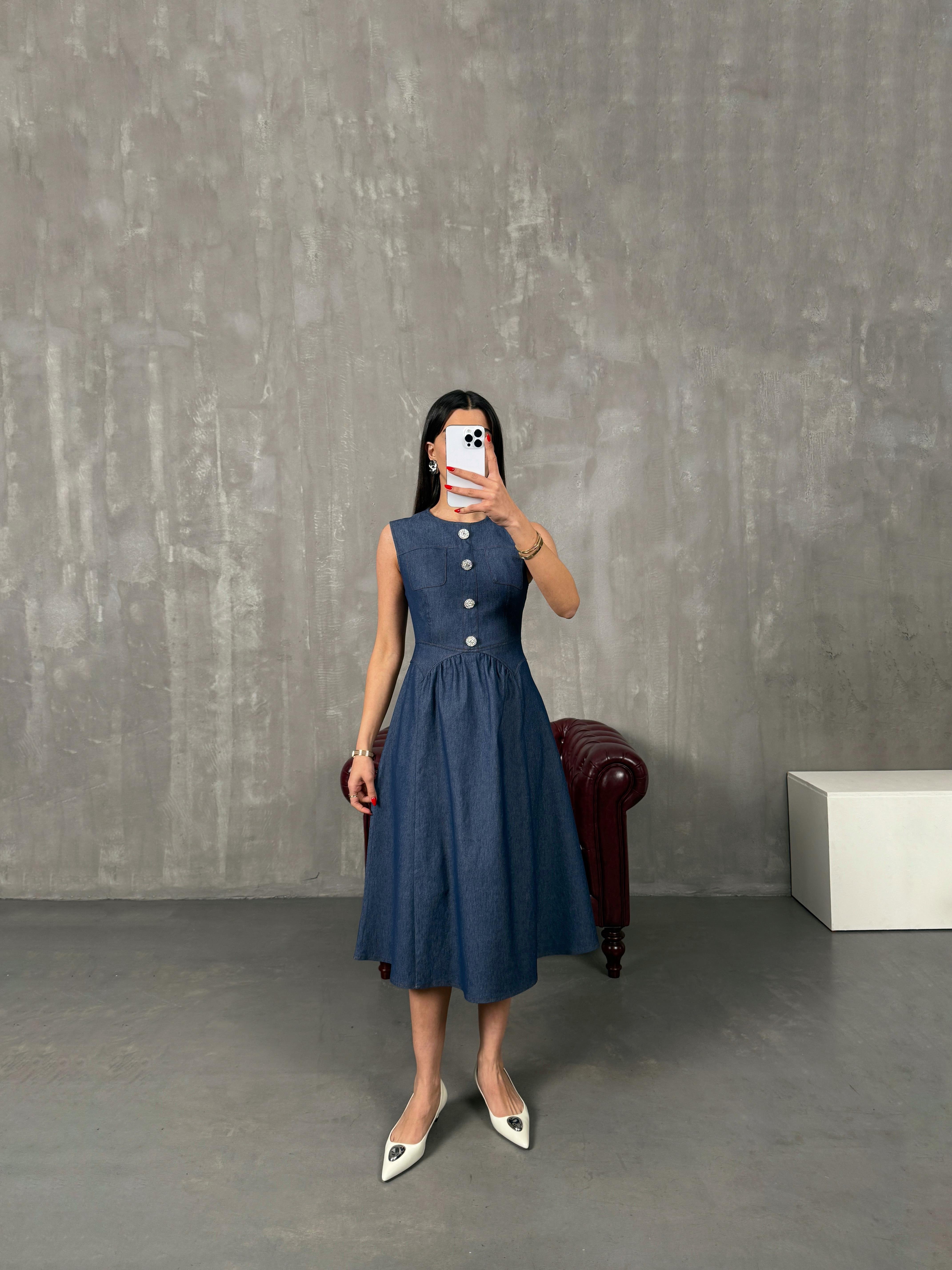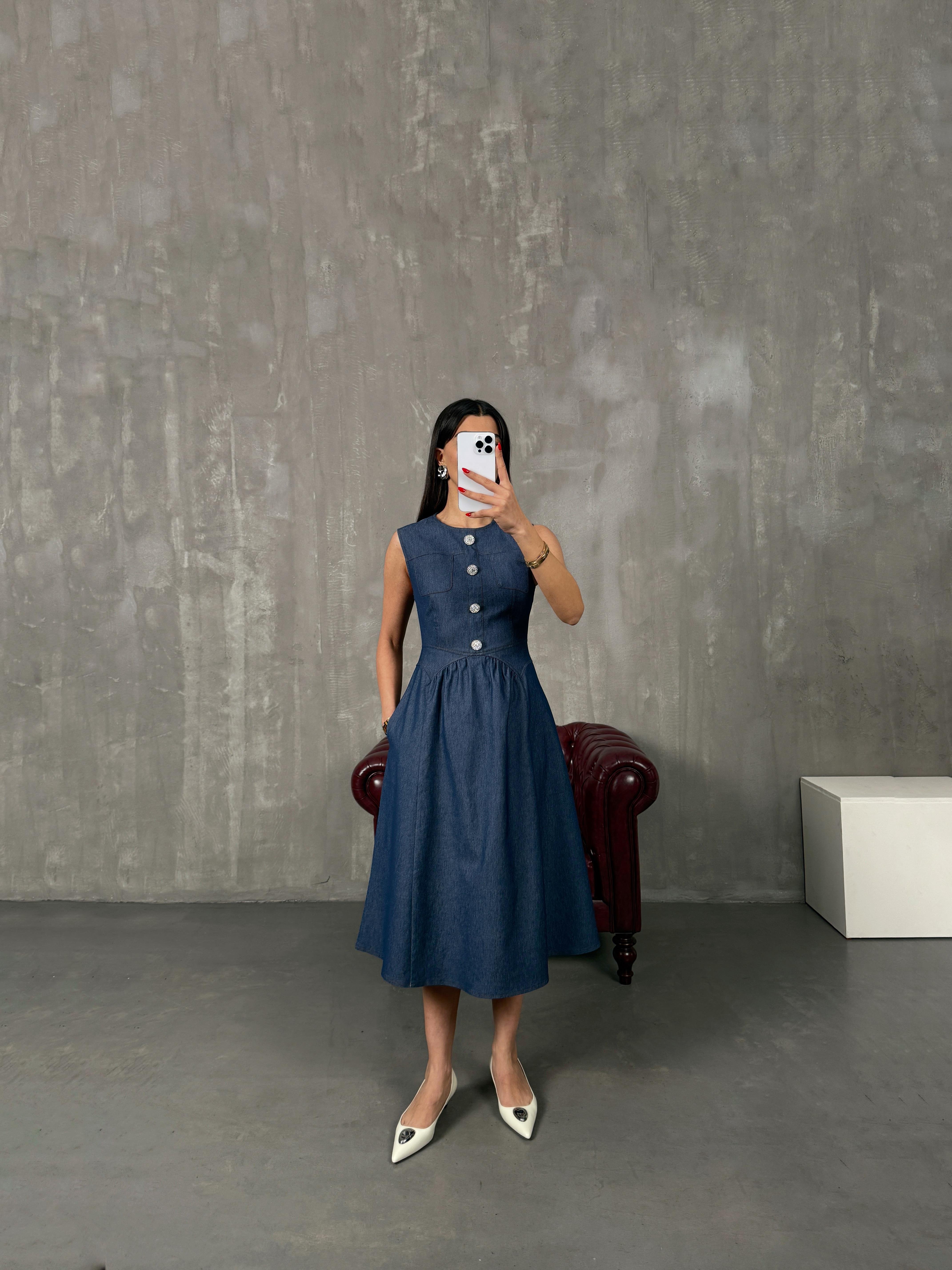 Tetra Mavi Düğme Detaylı Sıfır Kol Fermuarlı Cepli Tensel Denim Elbise