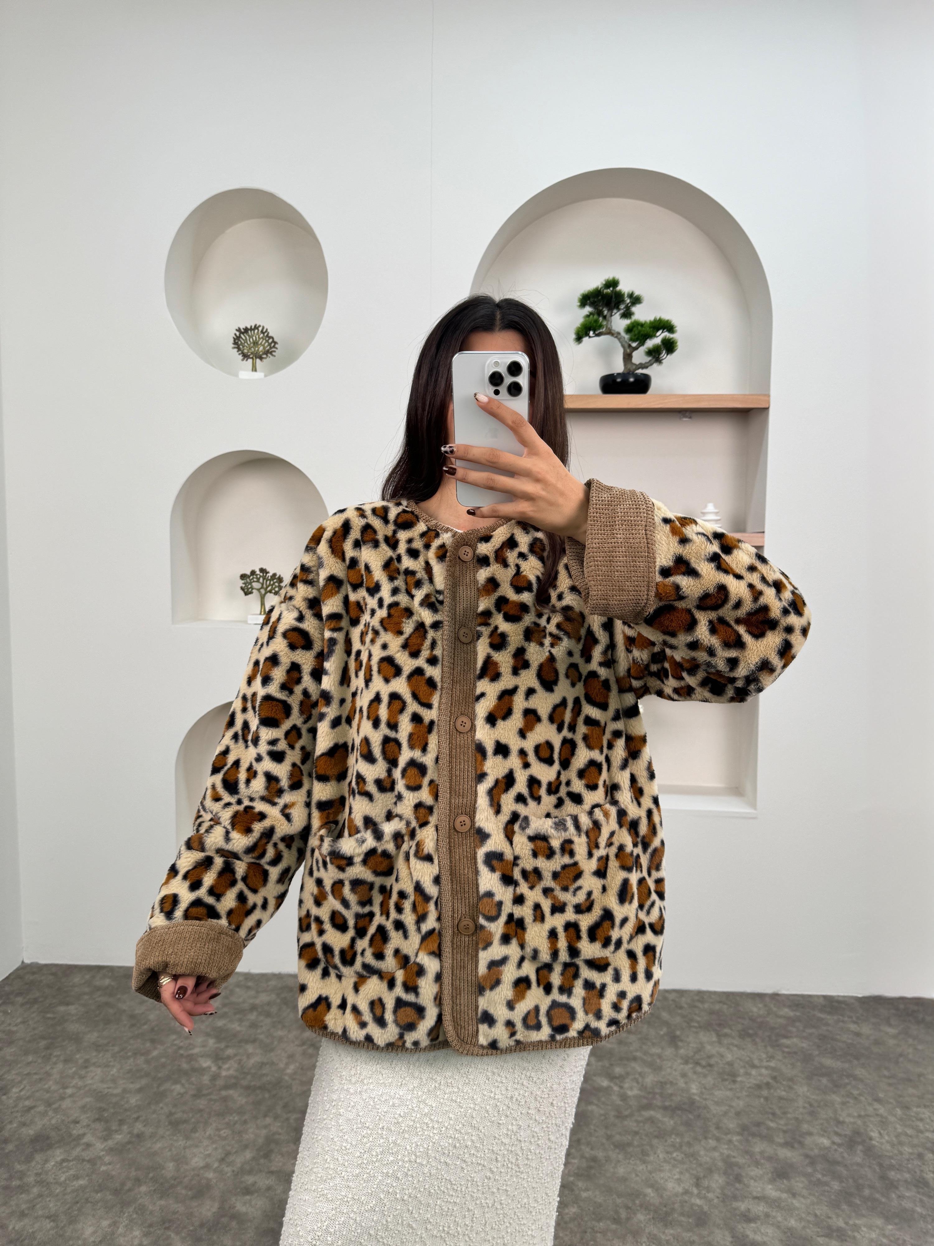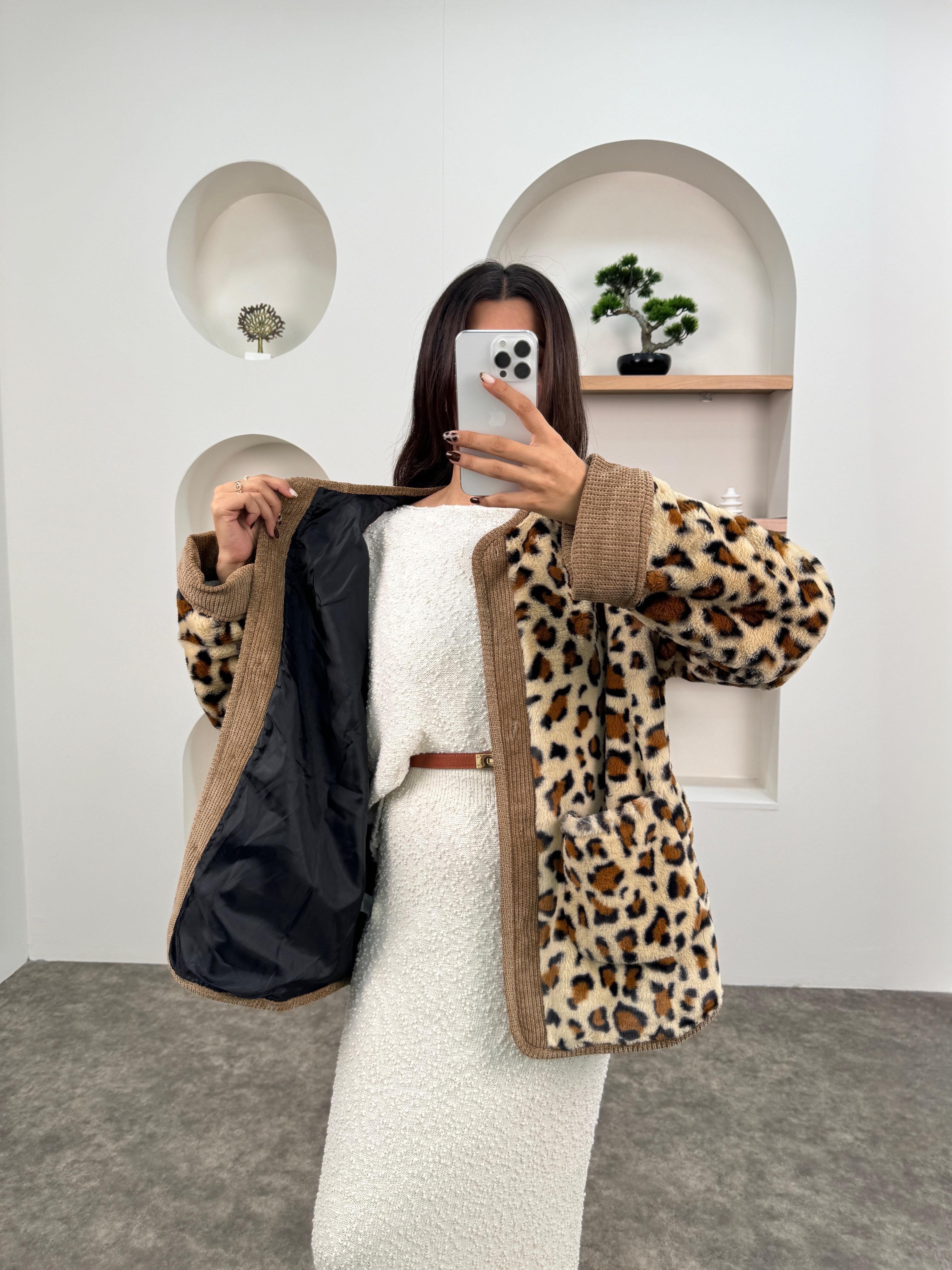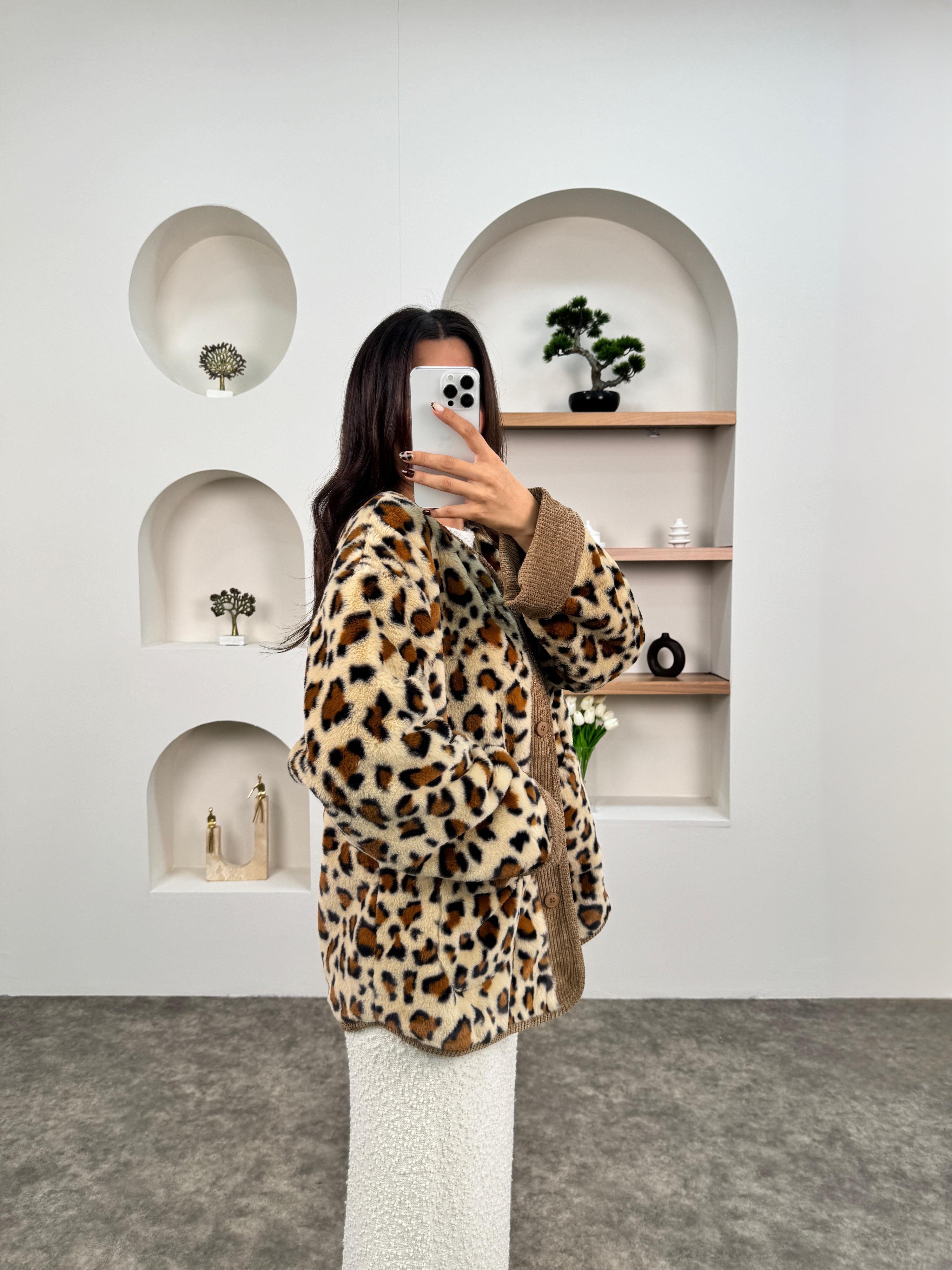 Tirel Camel Leopar Desenli Peluş Tasarım Ceket