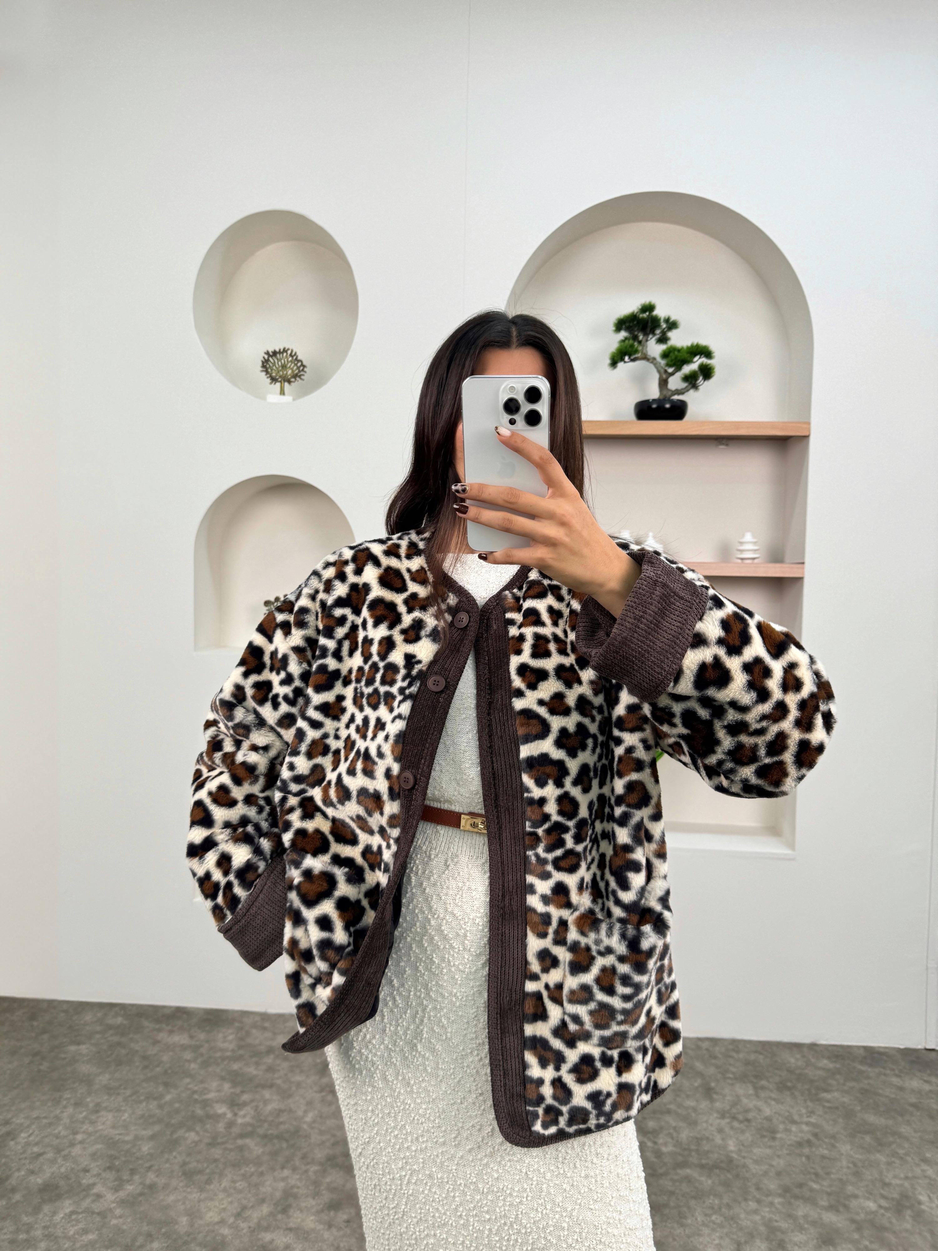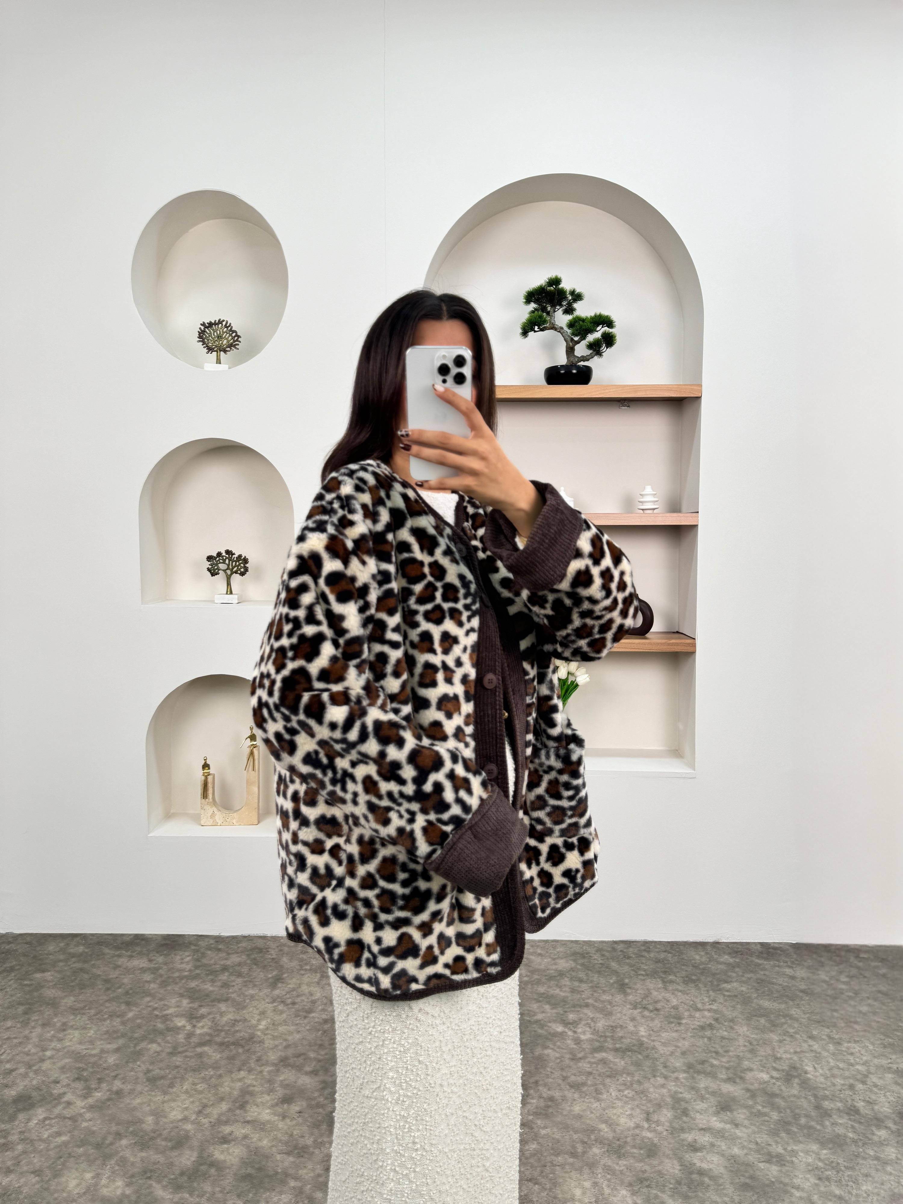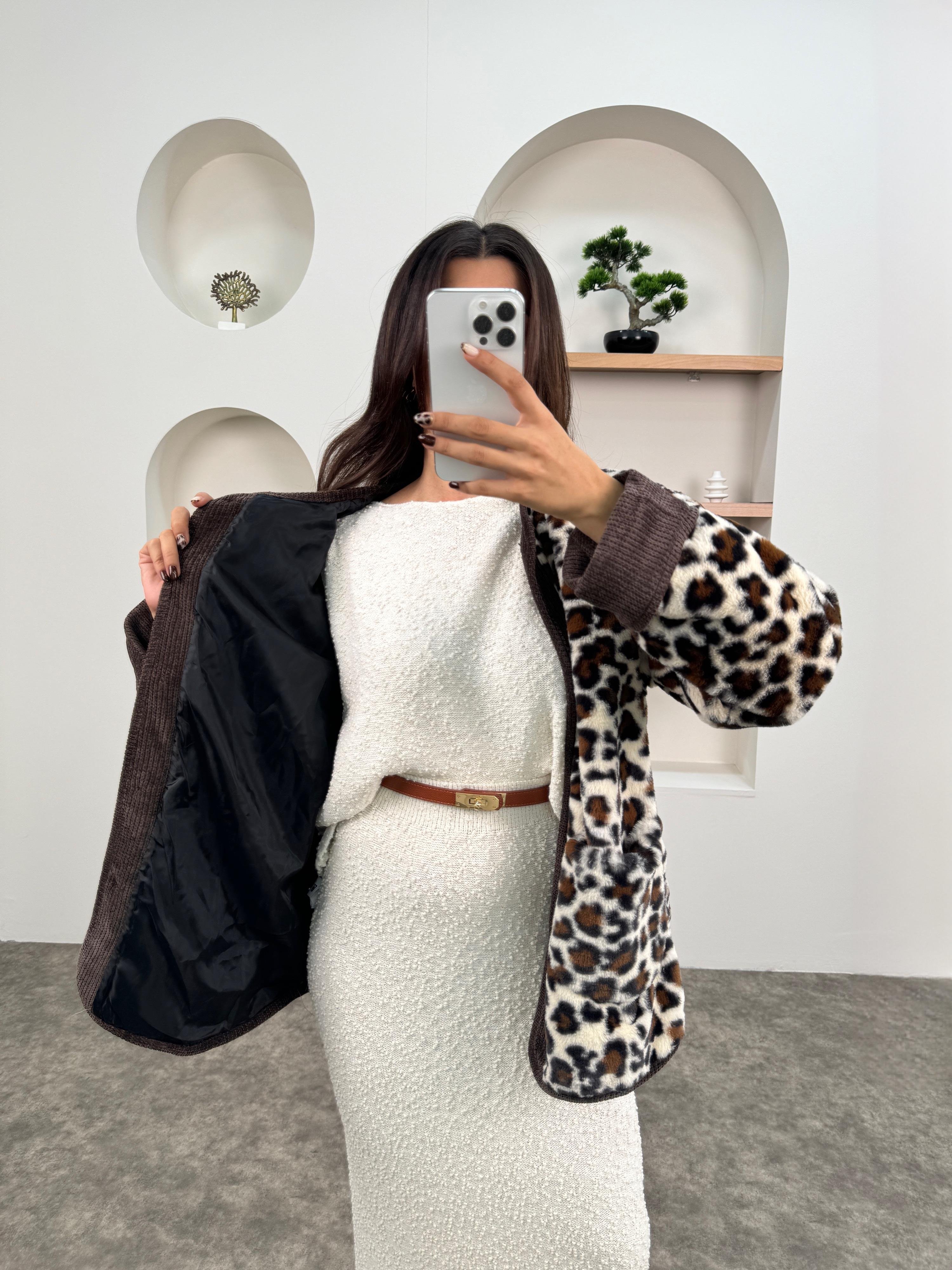Tirel Kahve Leopar Desenli Peluş Tasarım Ceket