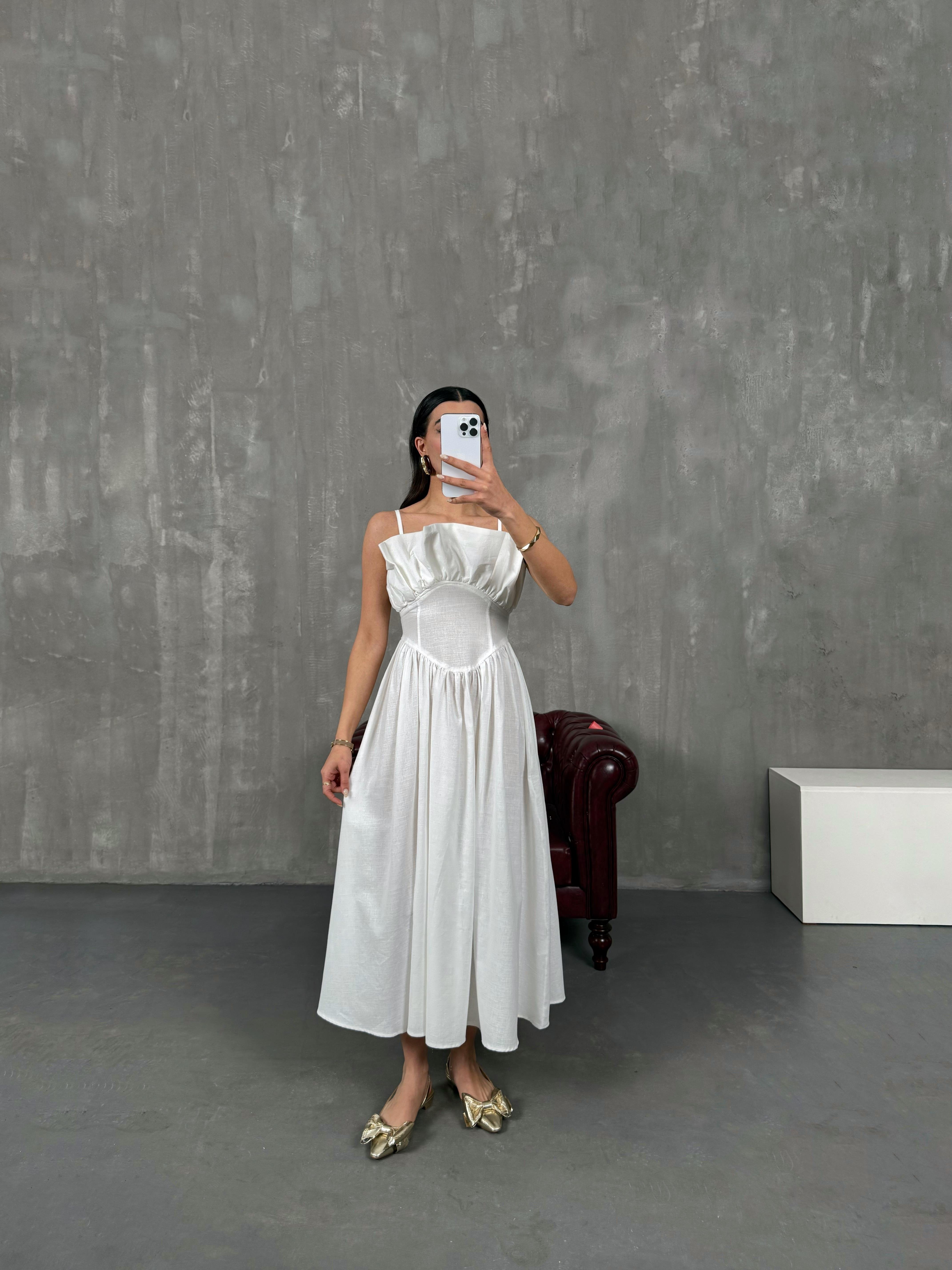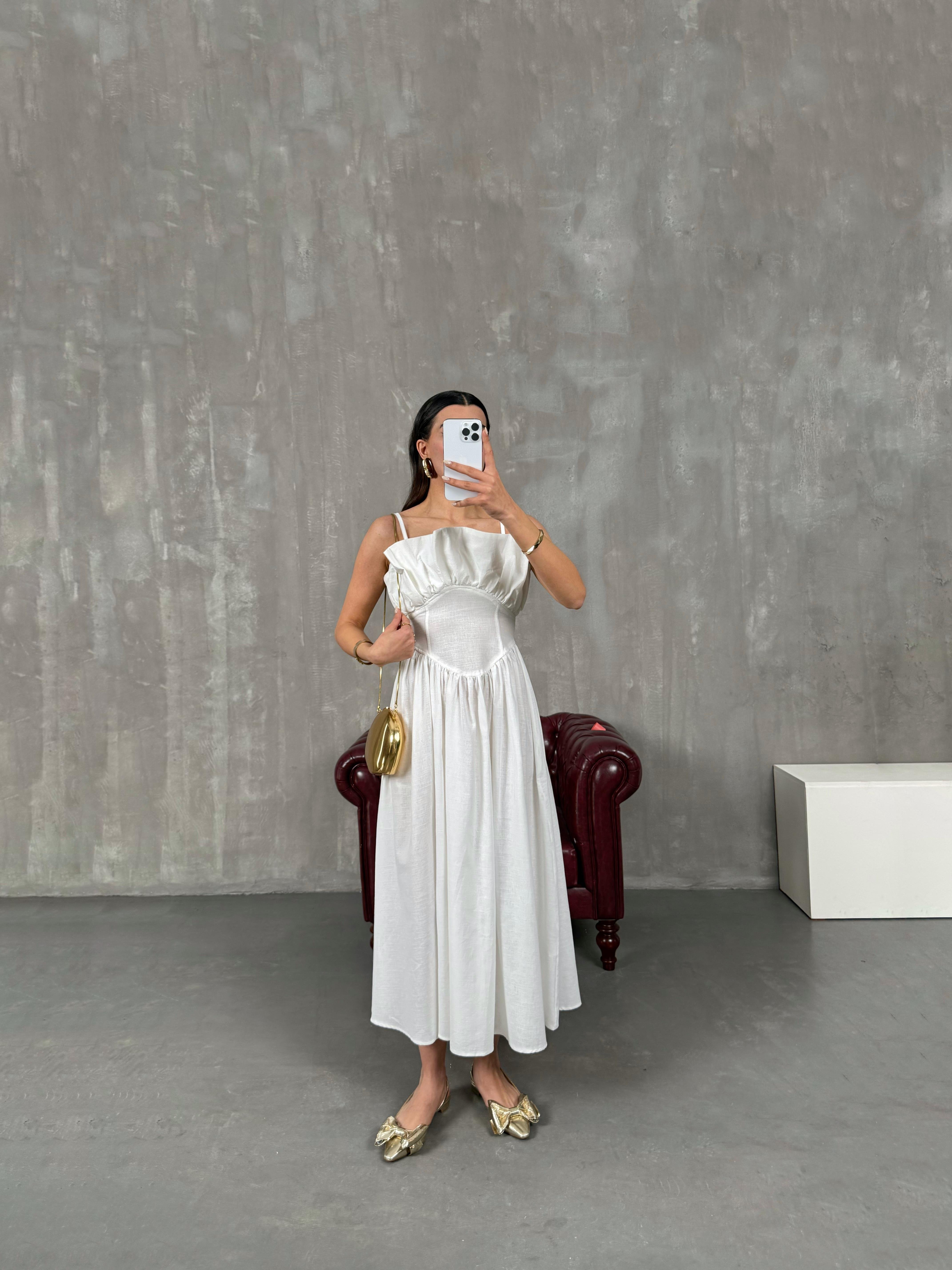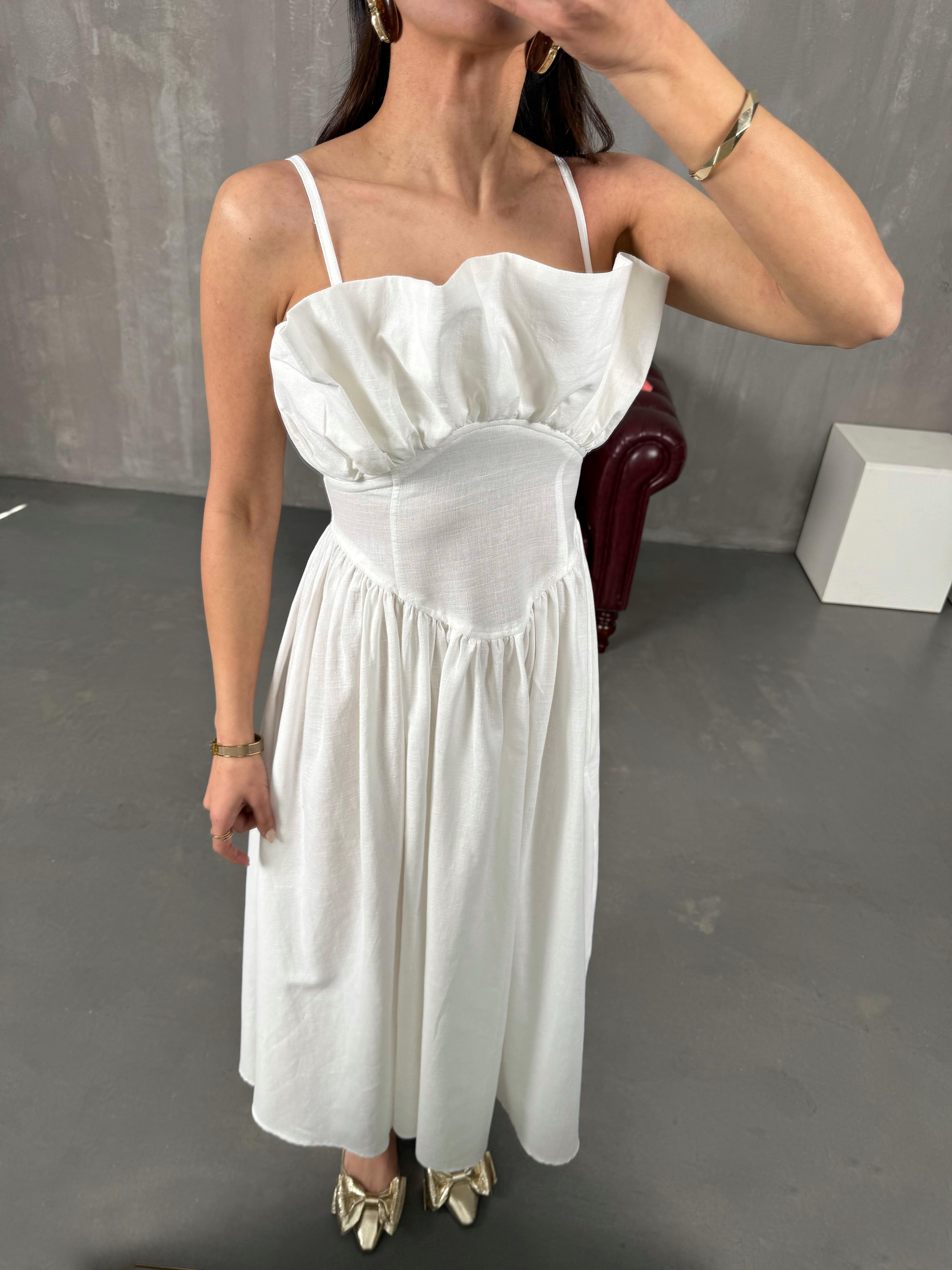 فاندا فستان أبيض بمظهر الكتان بياقة مكشكشة