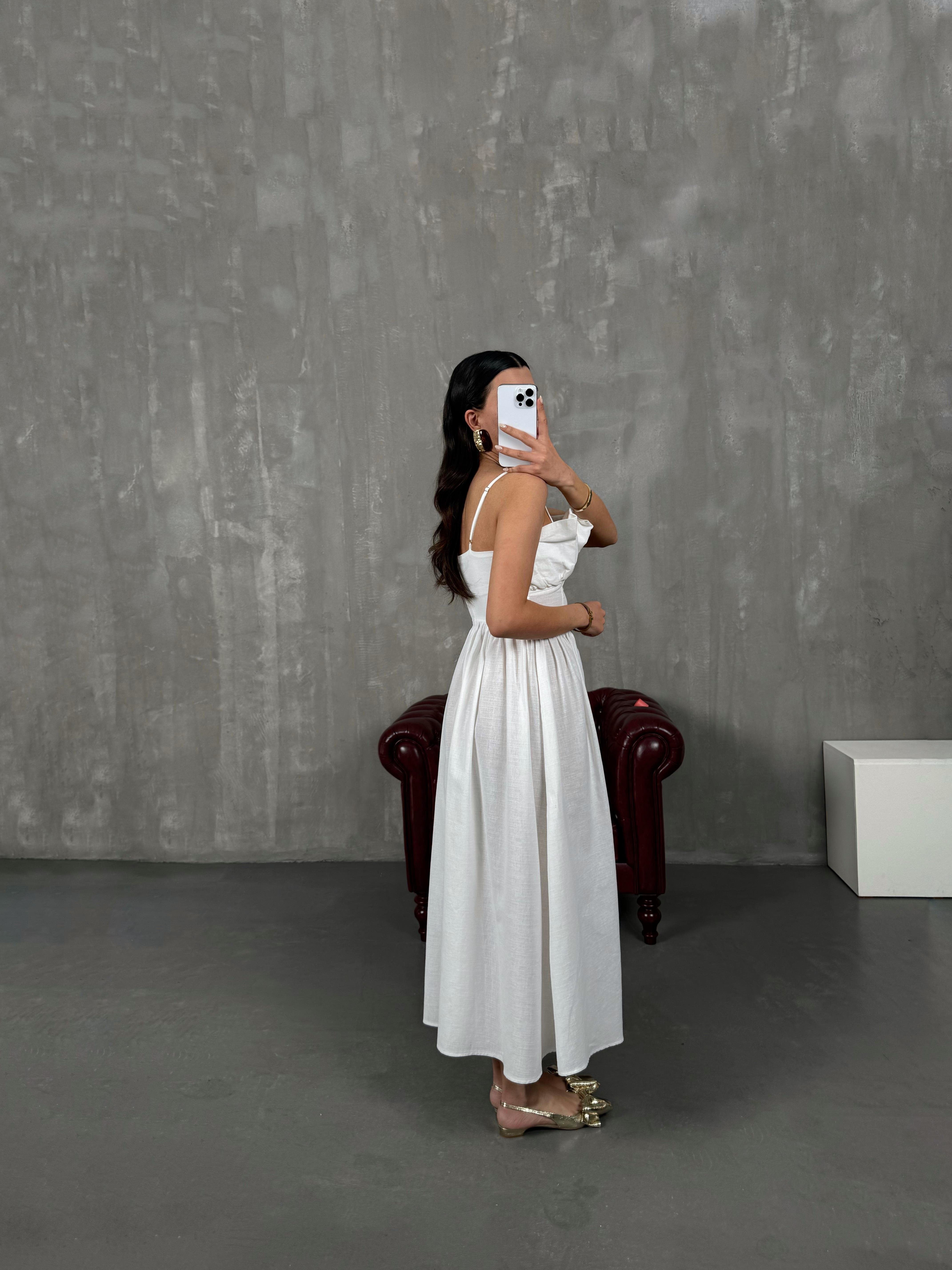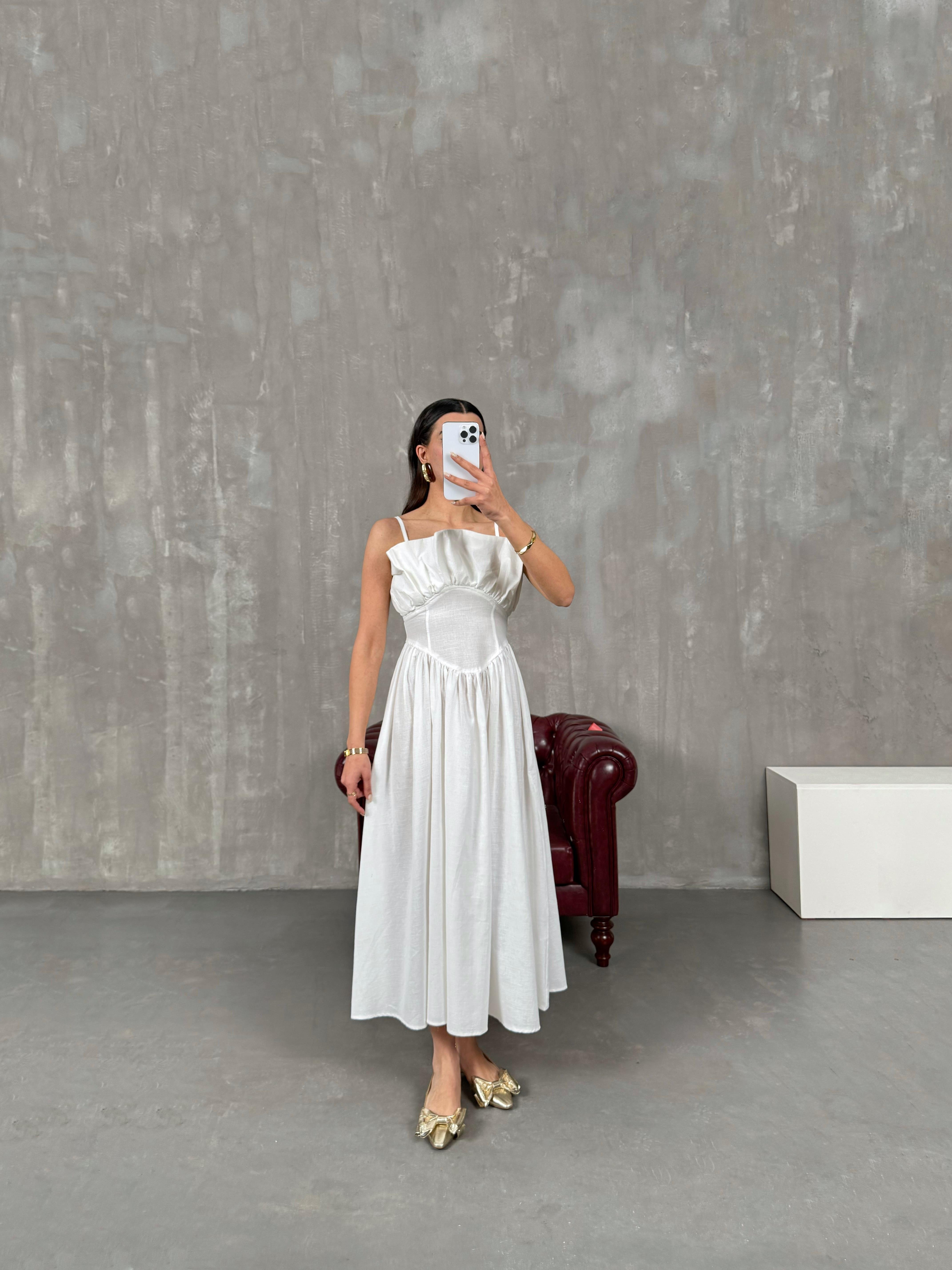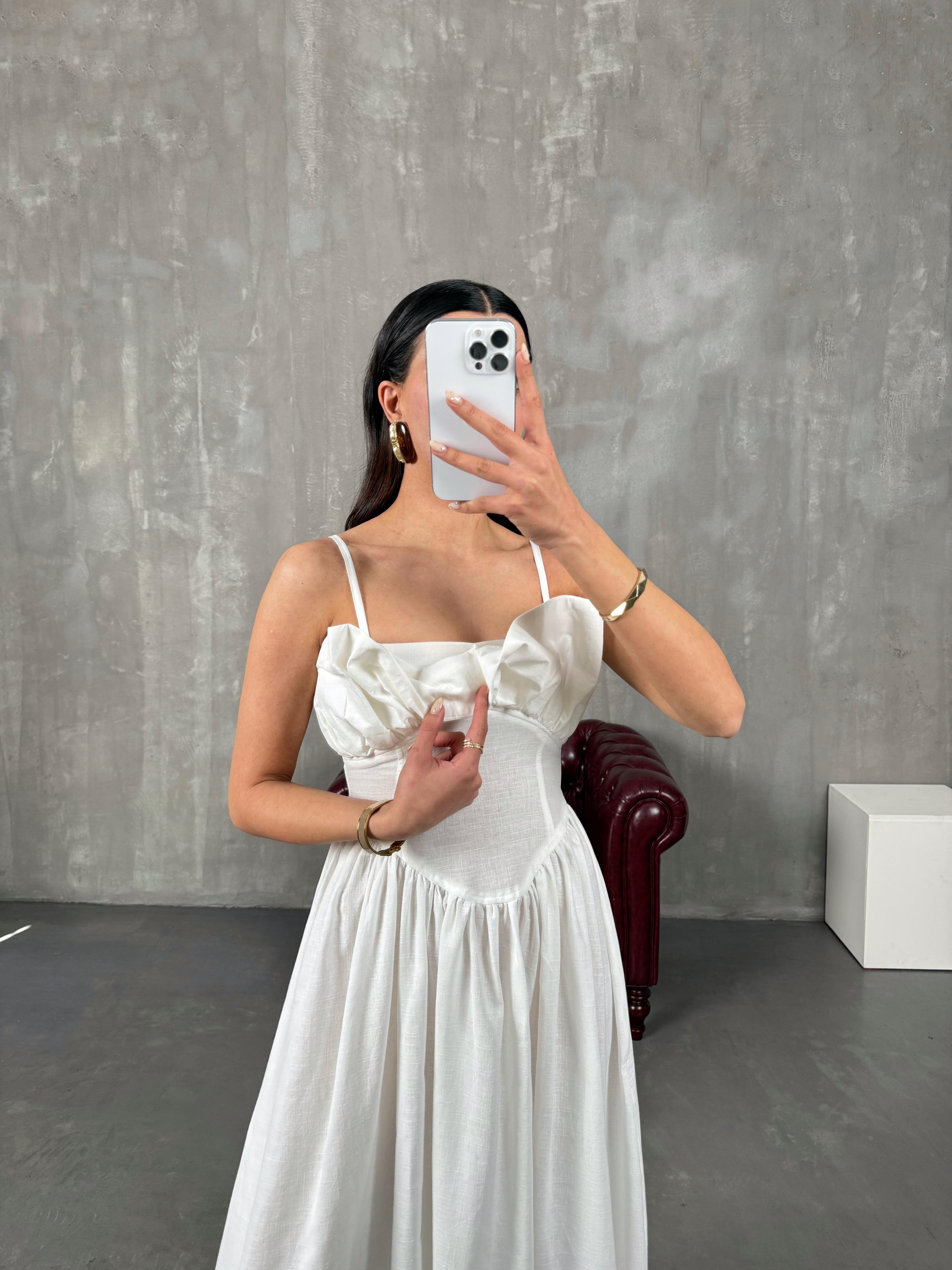 فاندا فستان أبيض بمظهر الكتان بياقة مكشكشة