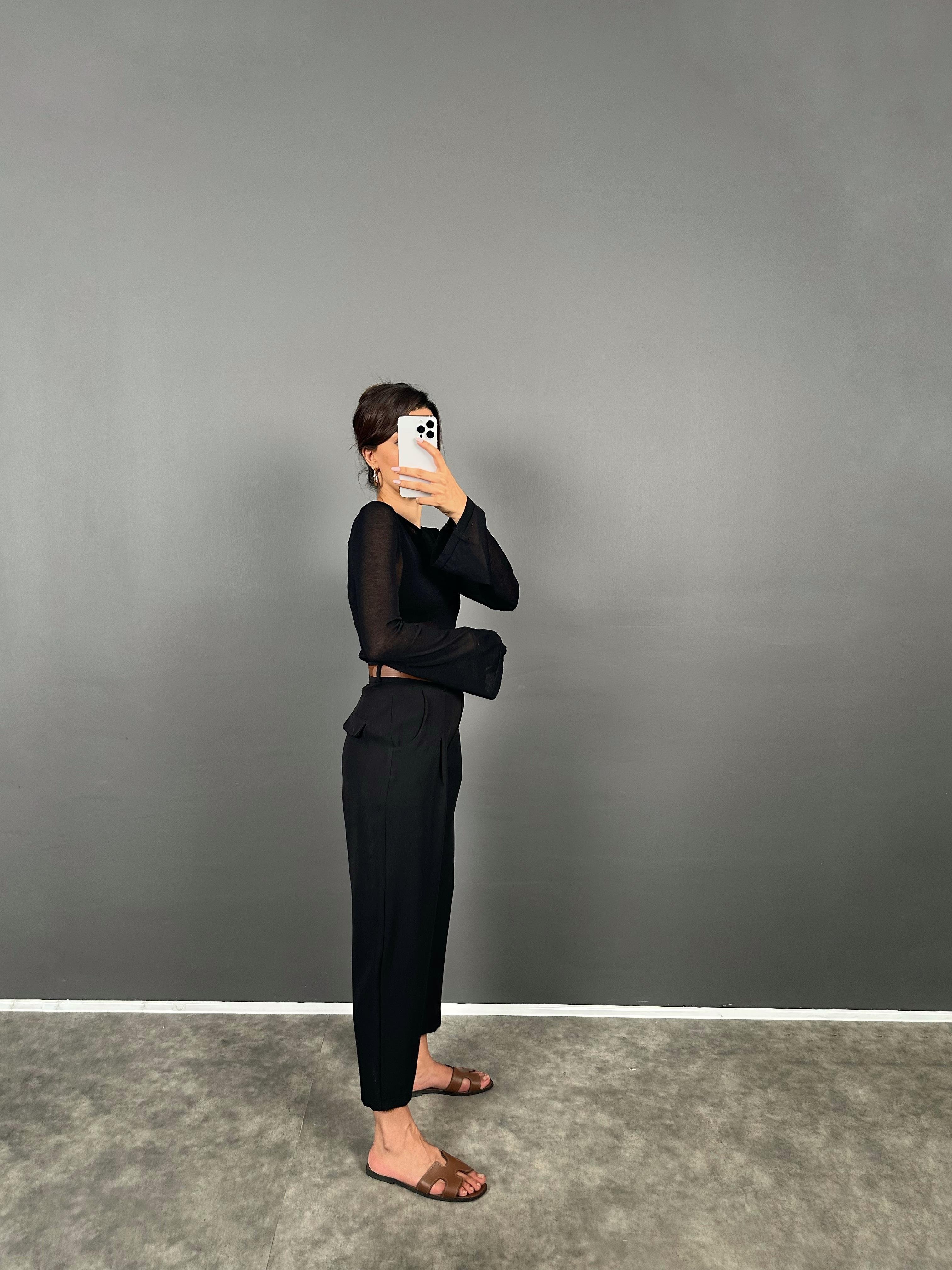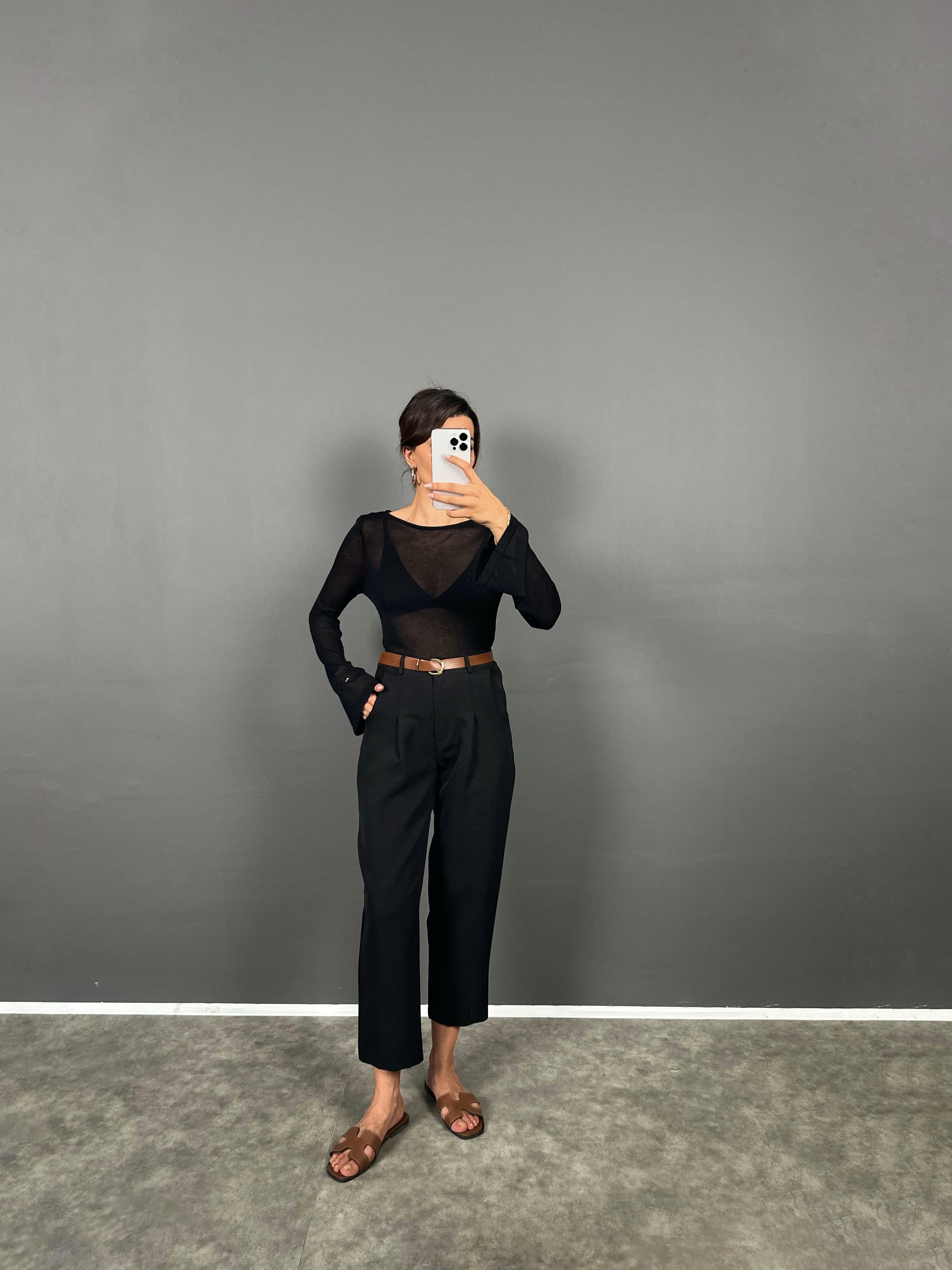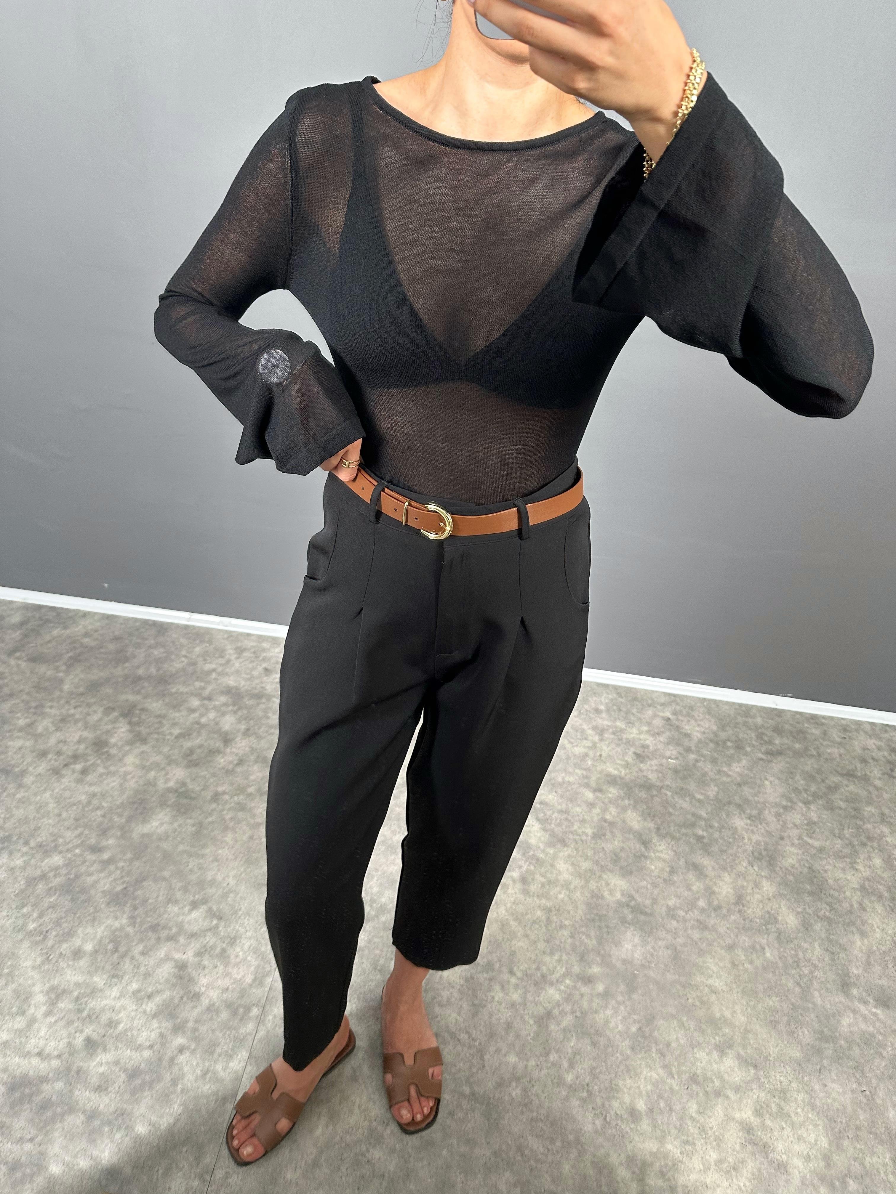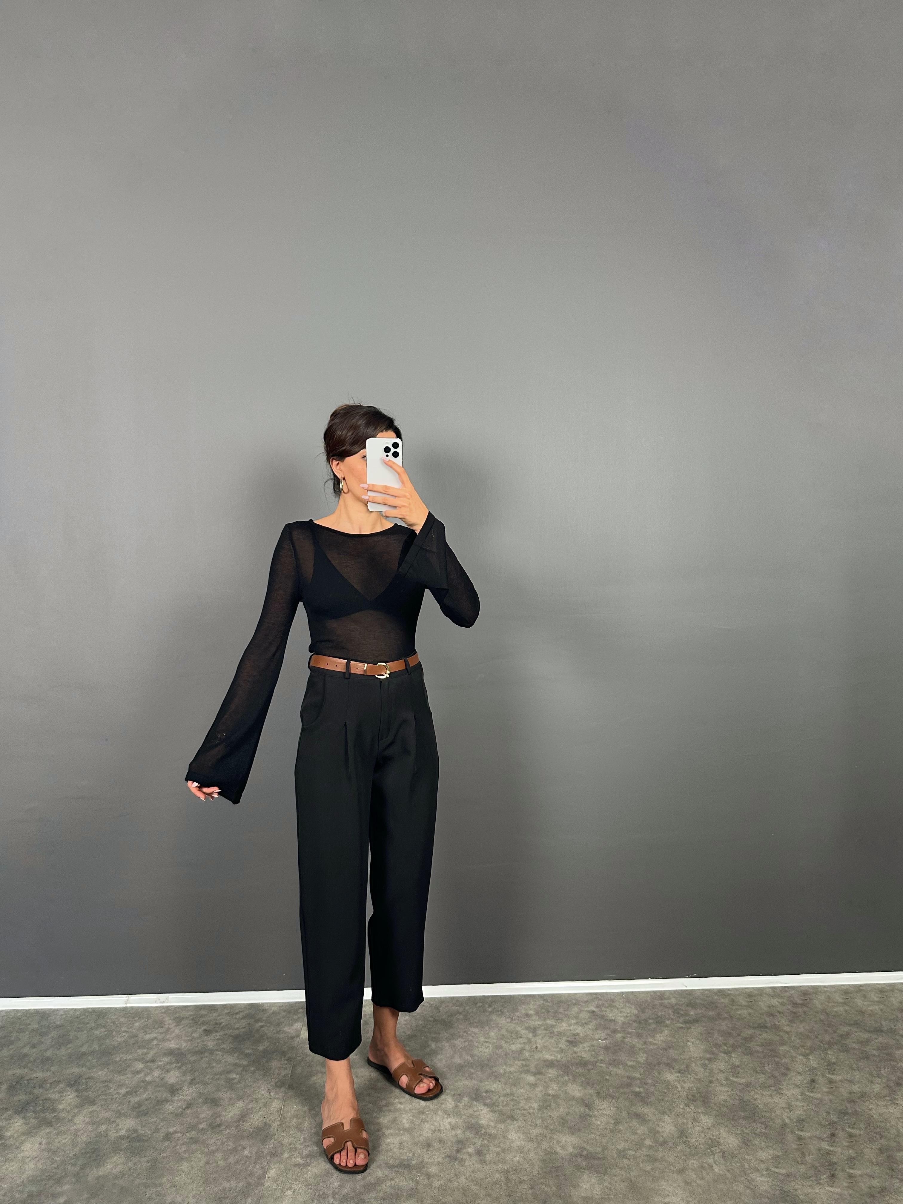 Vion Siyah Krep Kumaş Kemerli Havuç ZR Model Pantolon