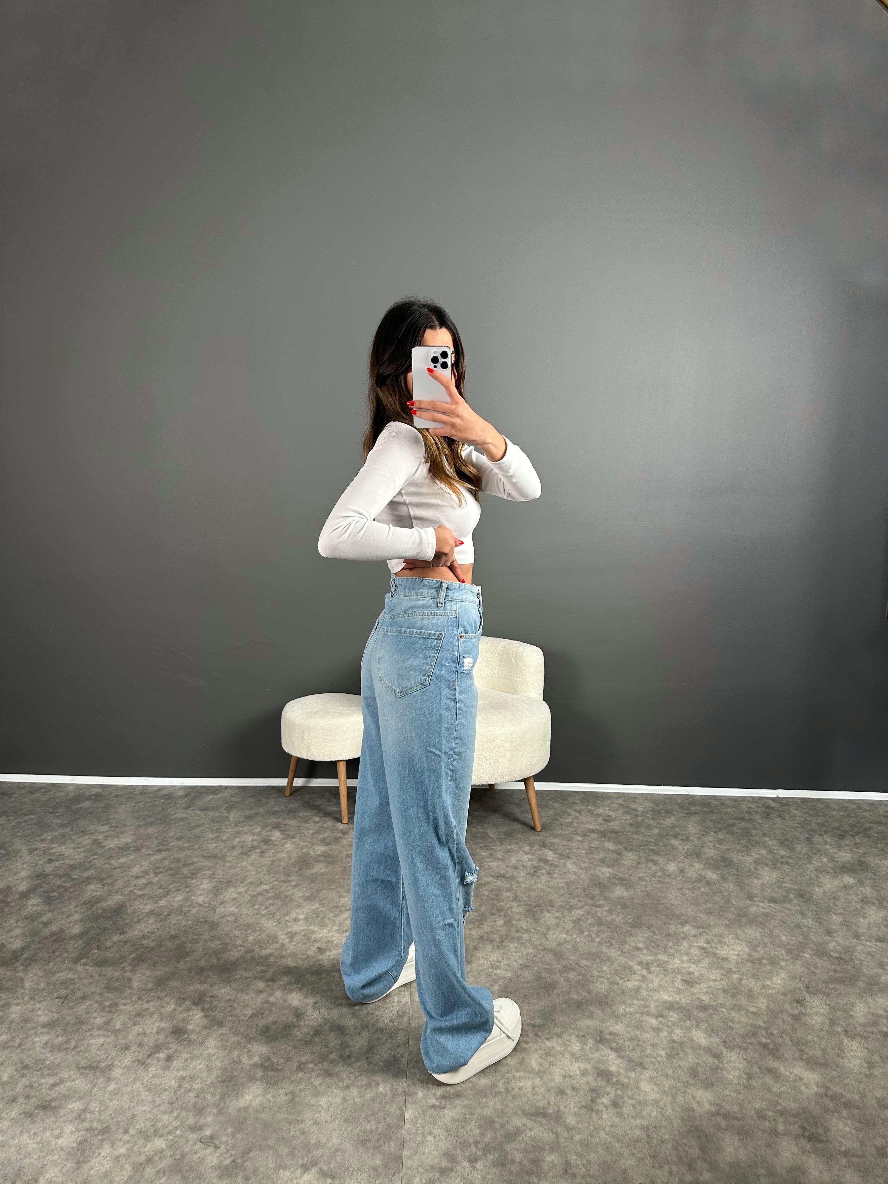 Wina Mavi Yırtık Yüksek Bel Straight Jean