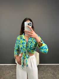 Yeşil İthal Yumuşak Saten Bağlamalı Bluz