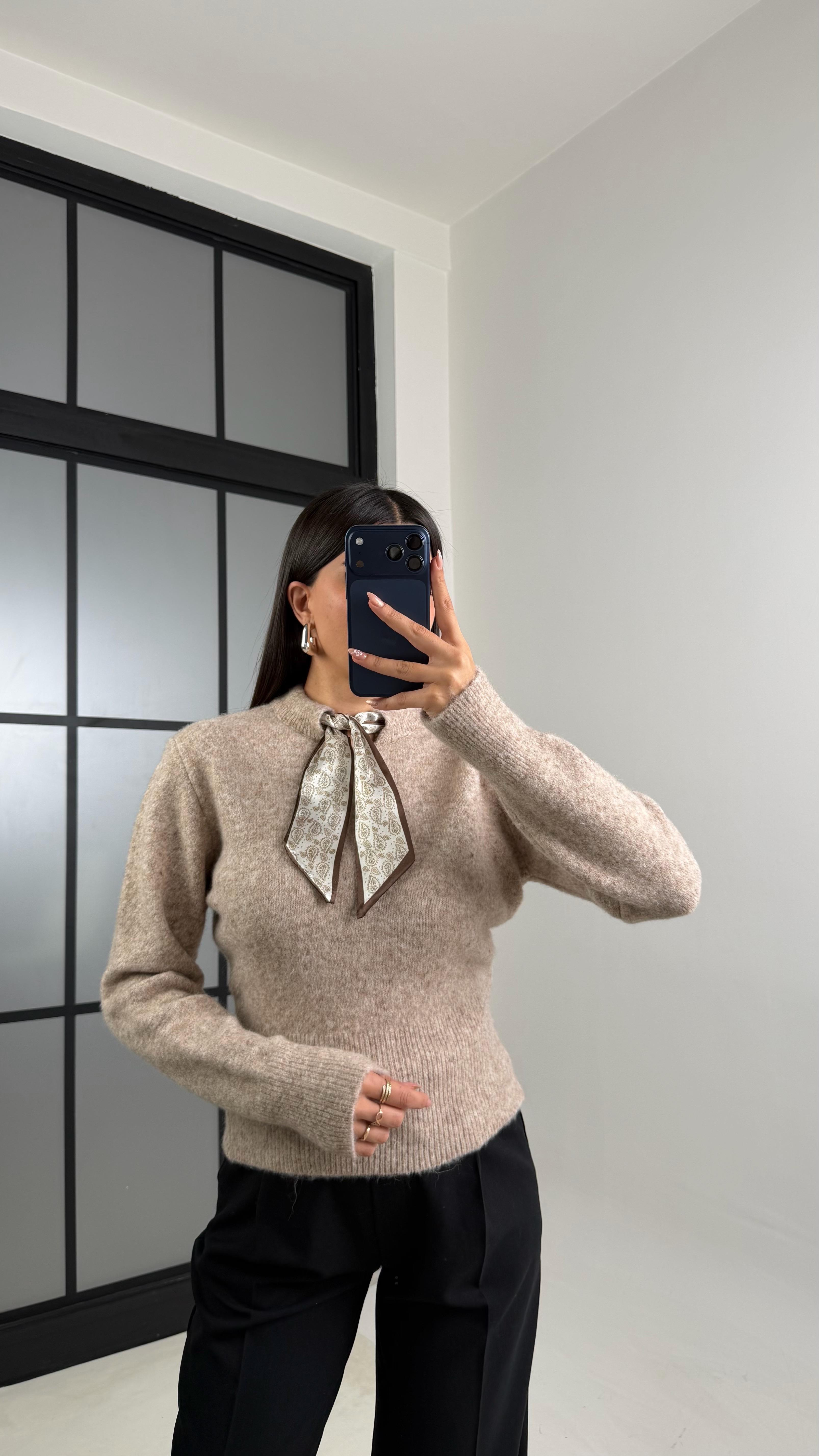 Bej Fular Detaylı Triko Kazak GAUS-00830