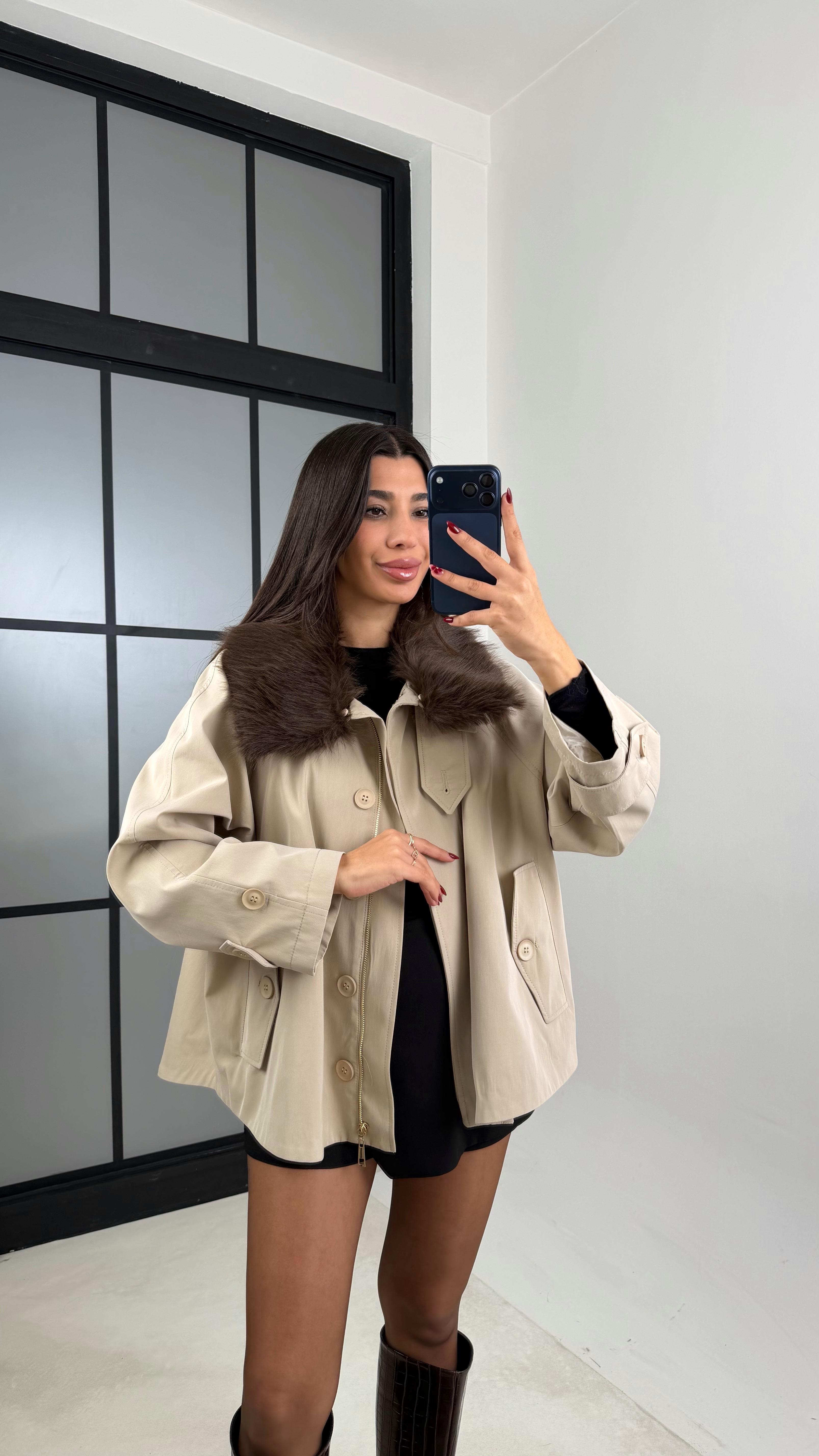Bej Yaka Kürk Detaylı Astarlı Trençkot GAUS-00660