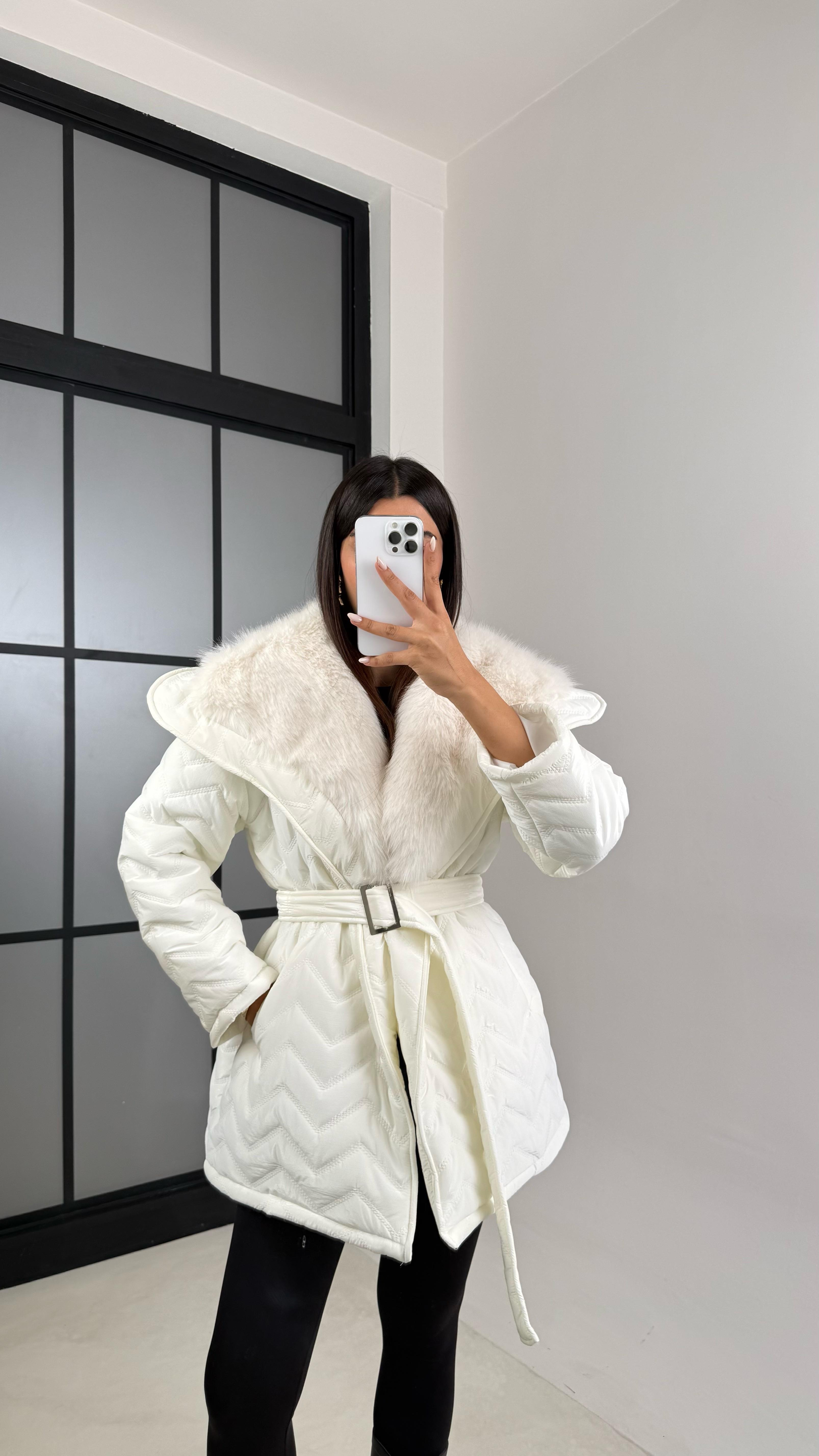 Beyaz Yaka Kürk Detaylı Kuşaklı Parlak Şişme Mont GAUS-00458