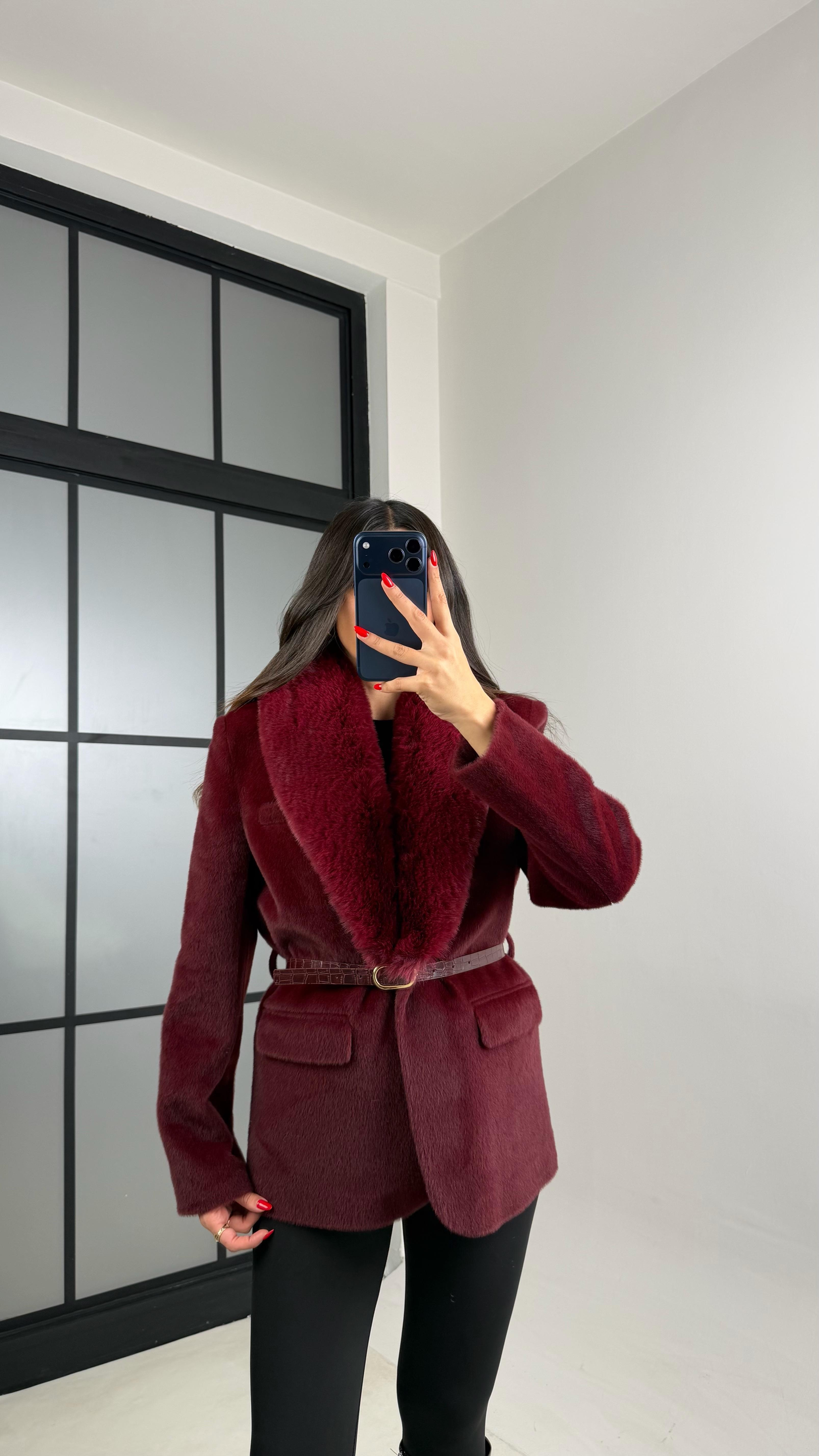 Bordo Astarlı Kemerli Premium Kürk Ceket GAUS-00936