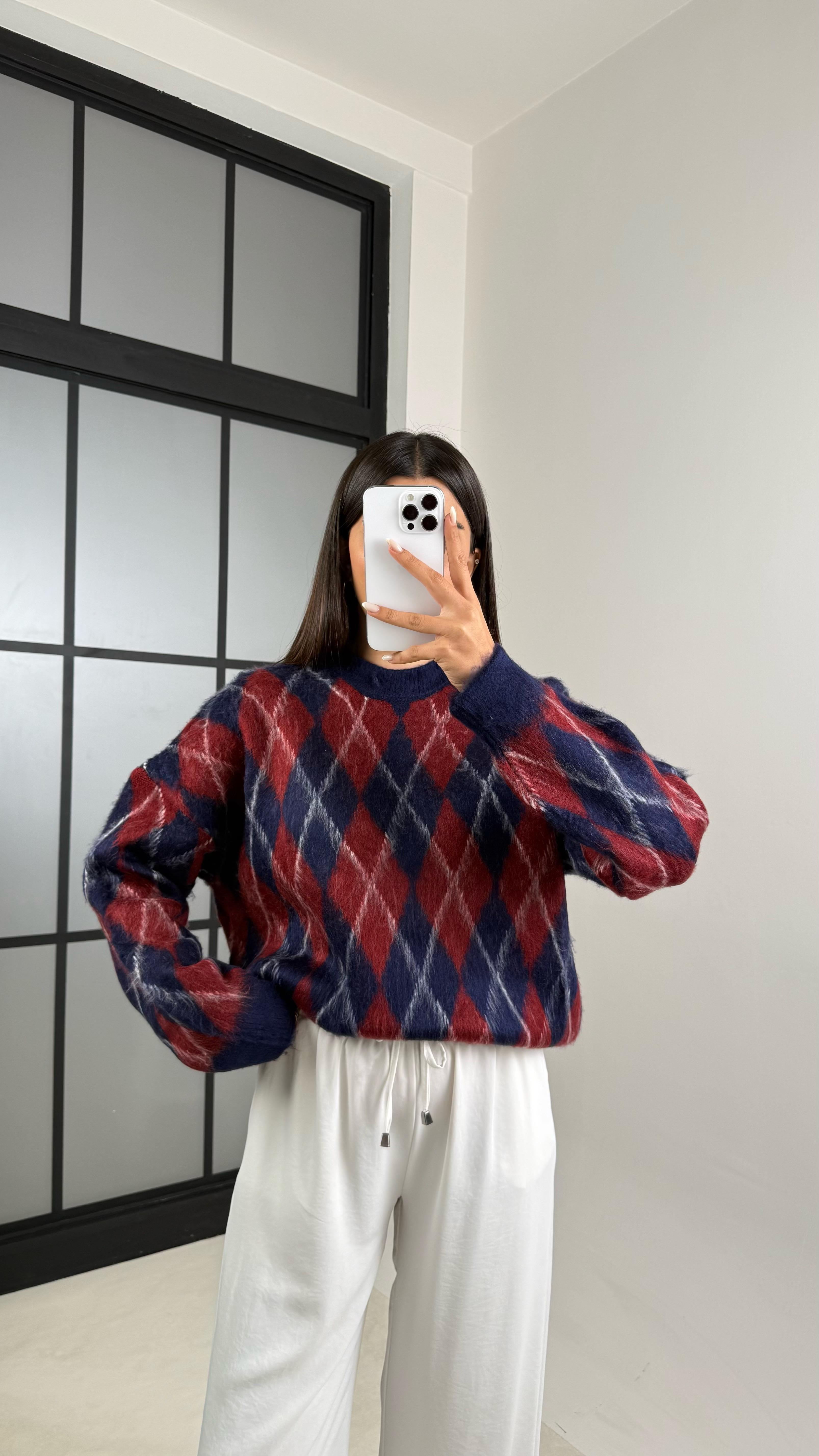 Bordo Baklava Desenli Yumuşak Dokulu Vintage Kazak GAUS-00558