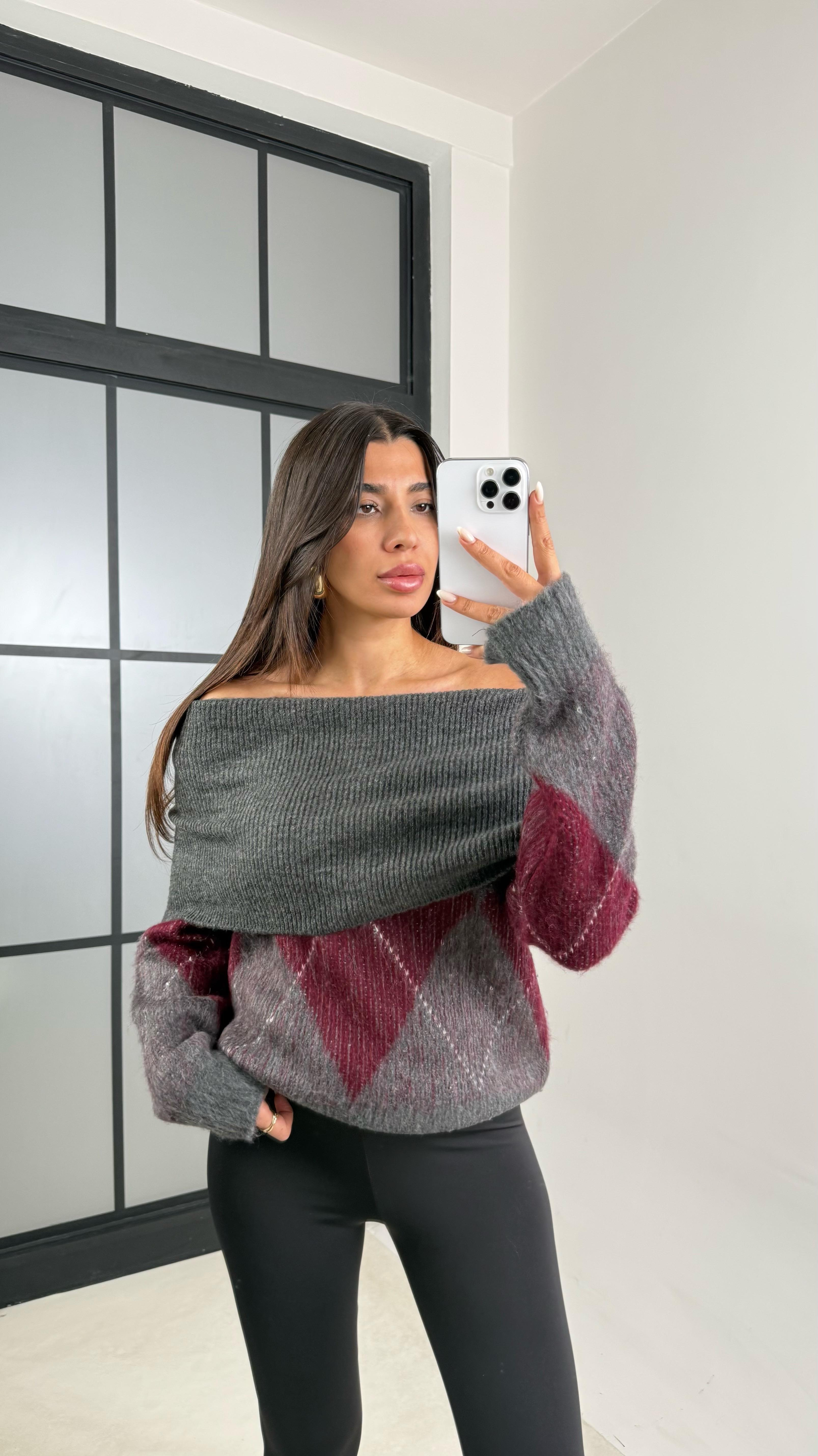 Bordo Madonna Yaka Baklava Desenli Kazak GAUS-00537