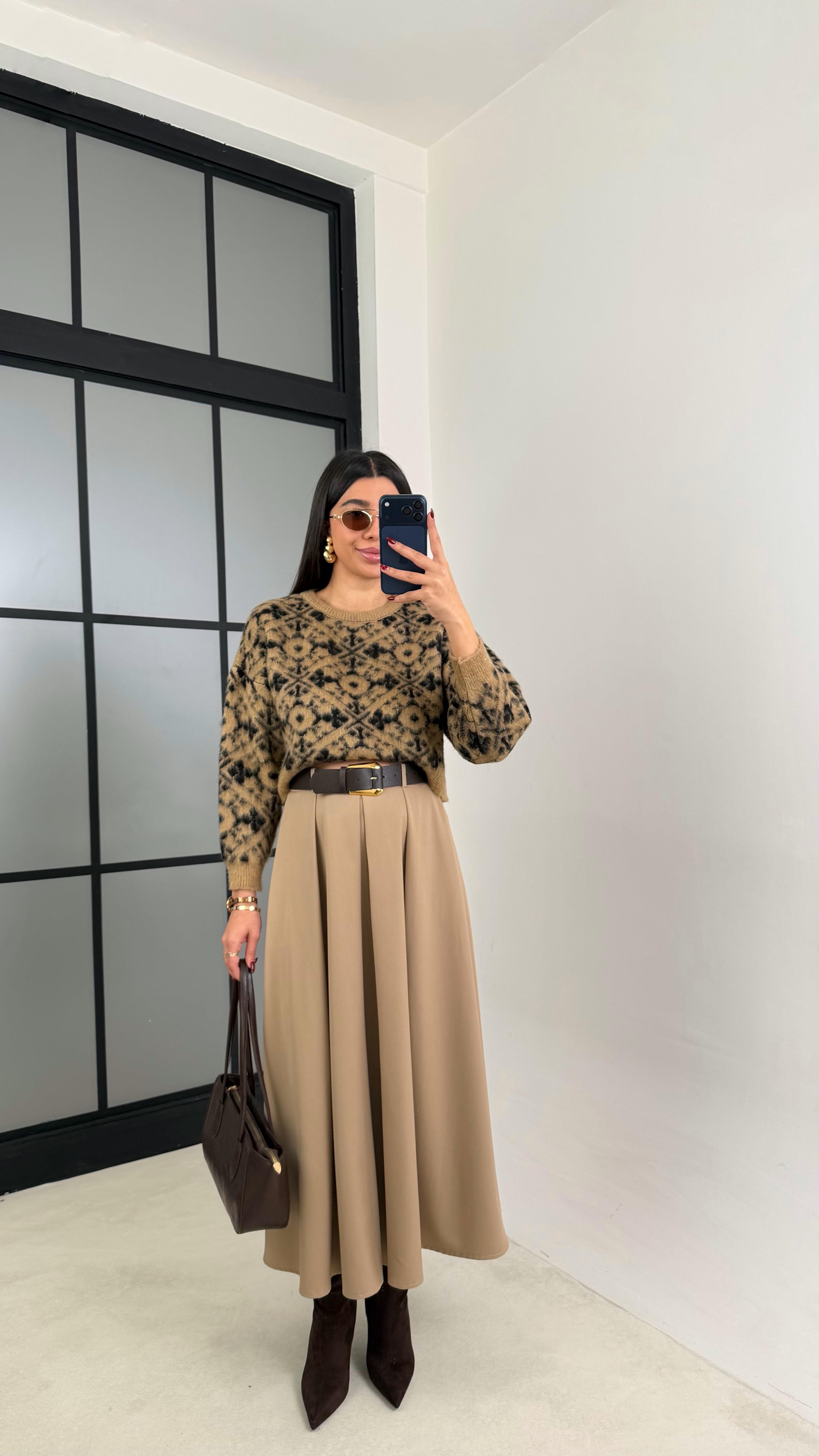 Camel Kemerli Pile Detaylı Kumaş Etek GAUS-00701