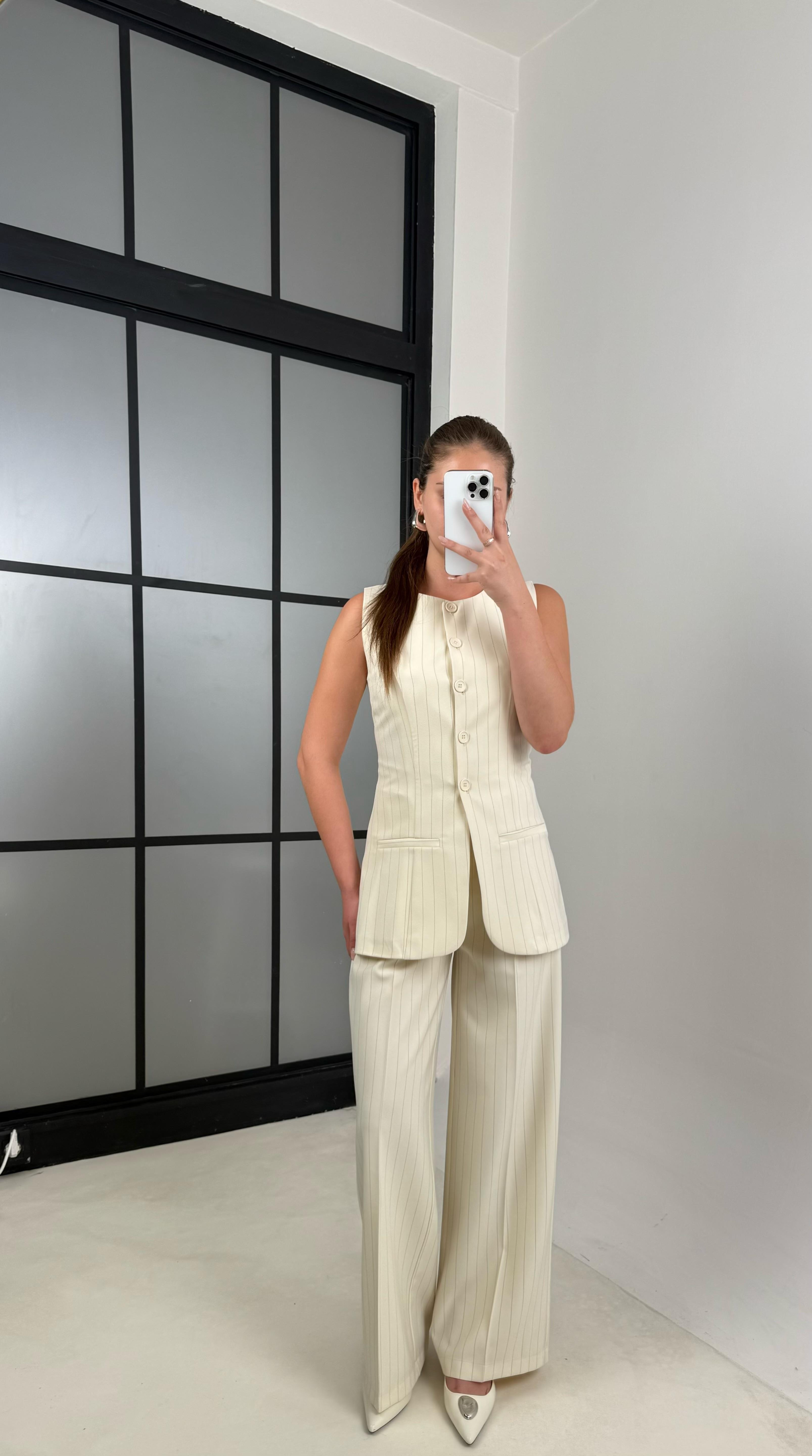 Ekru Çizgili Yelek Pantolon Kumaş Takım GAUS-00495