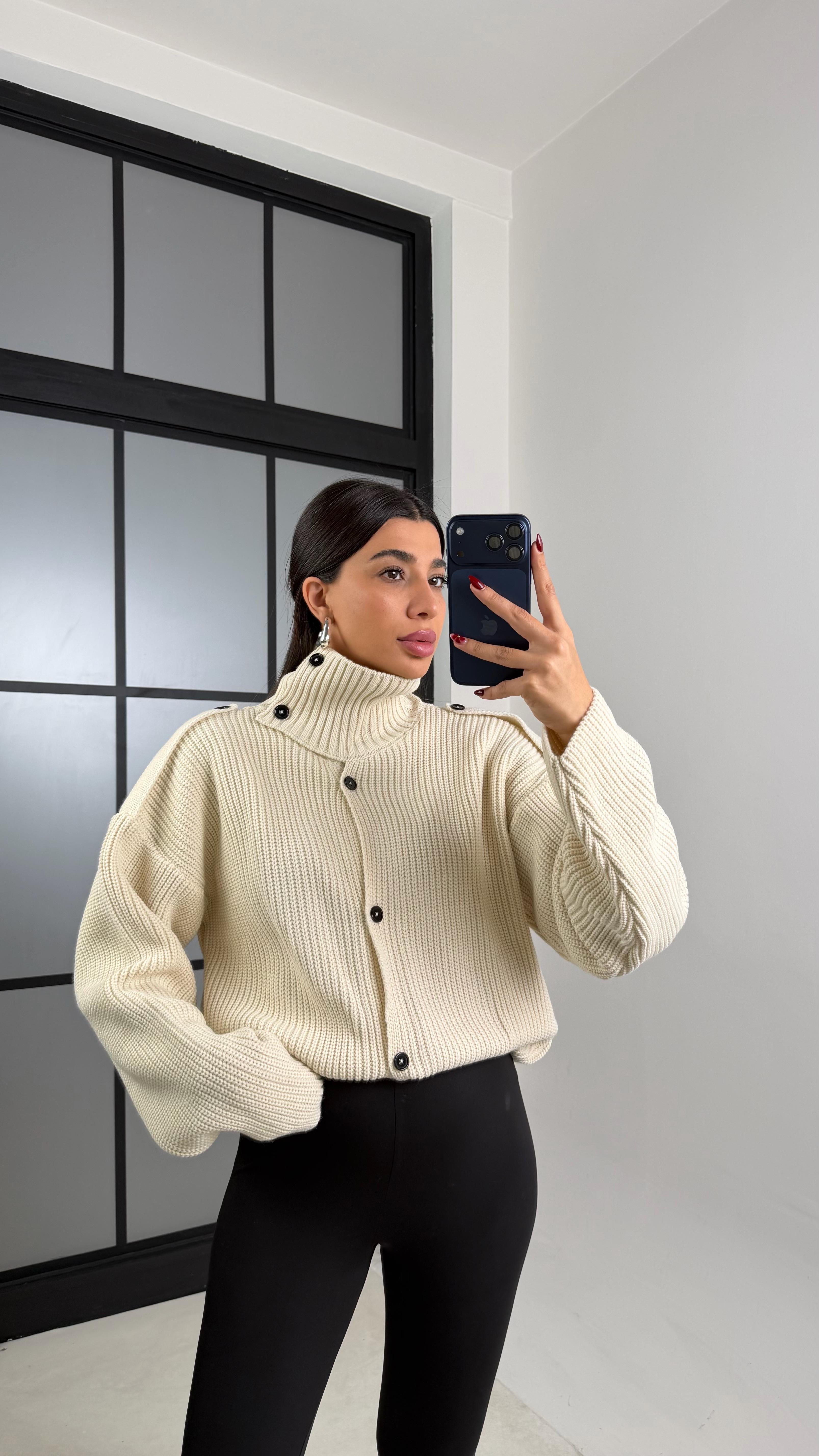 Ekru Dik Yaka Düğmeli Triko Hırka GAUS-00731