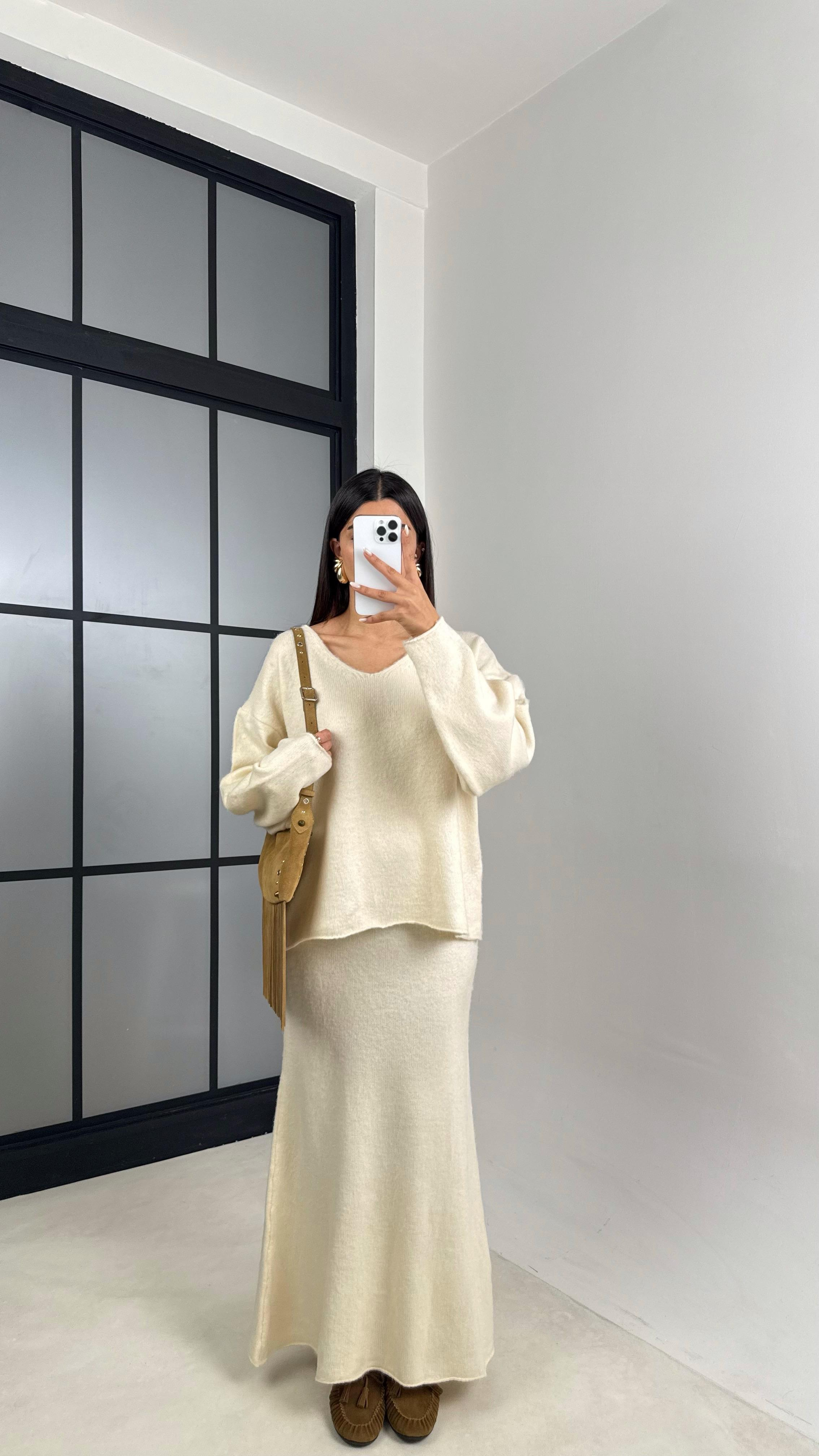 Ekru V Yaka Kazak Beli Lastikli Etek İkili Triko Takım GAUS-00528GAUSTAKIMGAUS-00528