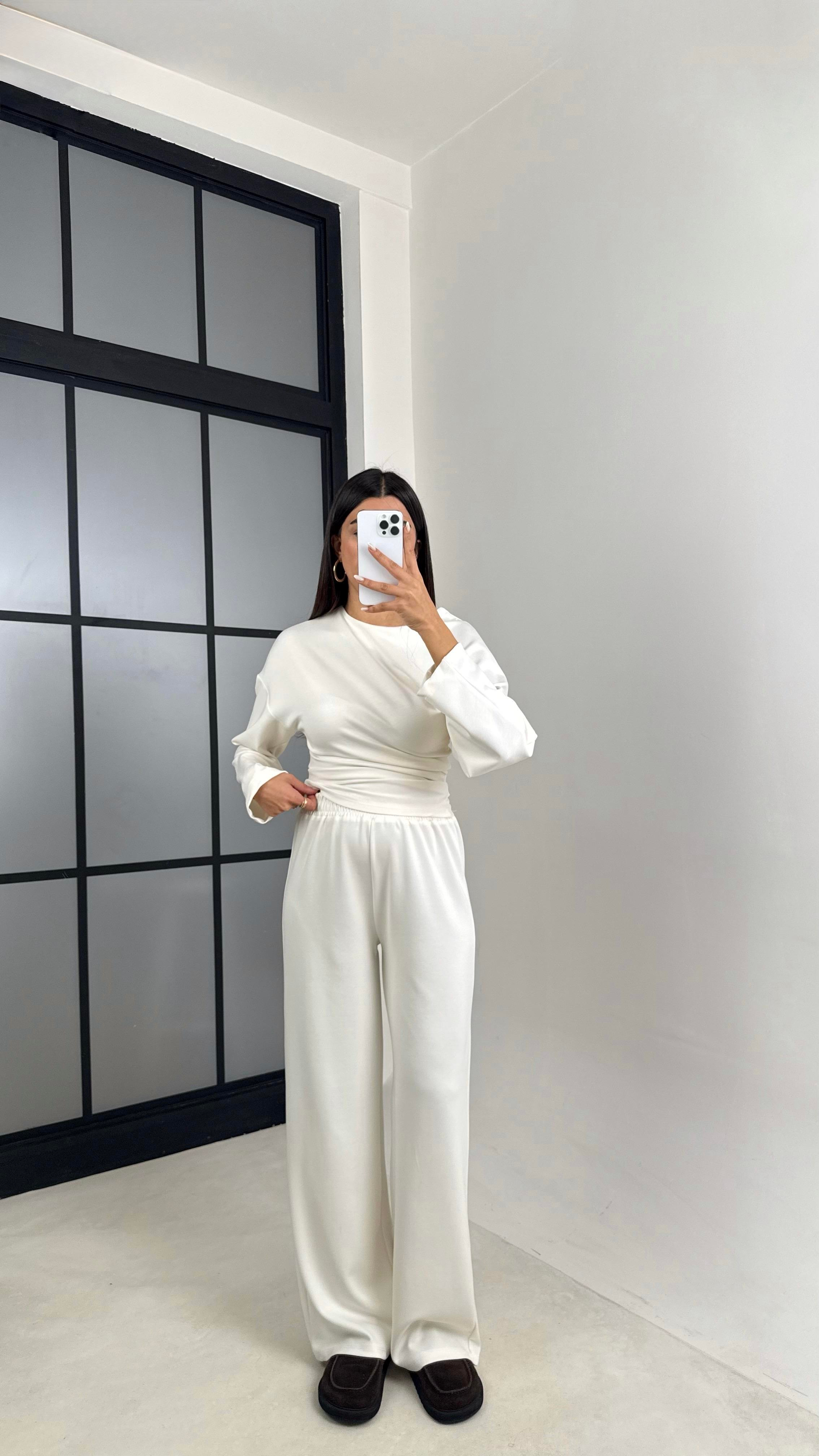 Ekru Yarasa Kol Bluz Beli Lastikli Pantolon Tasarım Modal Takım GAUS-00572