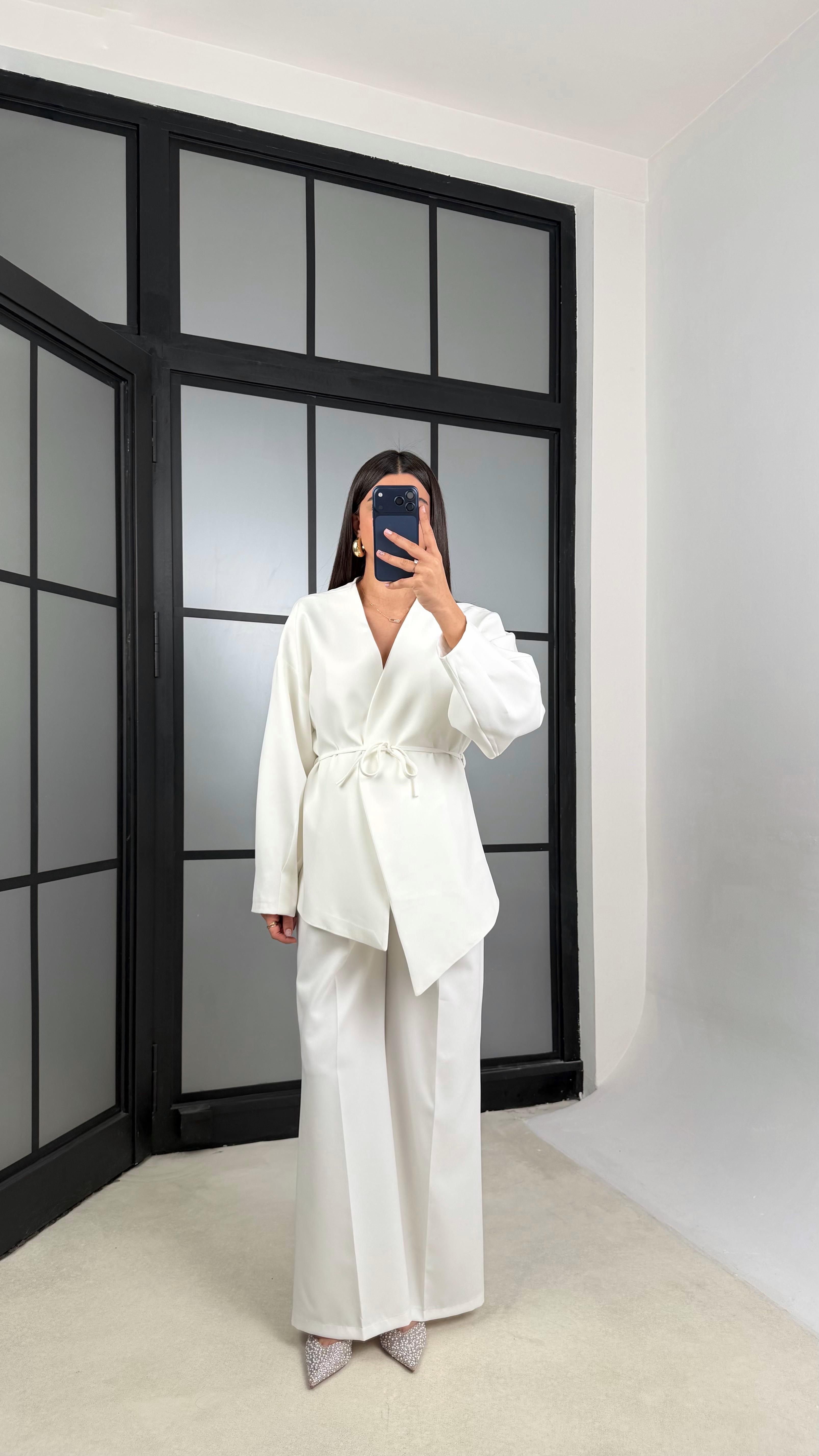 Beyaz Belden Kuşaklı Ceket Beli Lastikli Pantolon İkili Takım GAUS-01206GAUSSuitsGAUS-01206