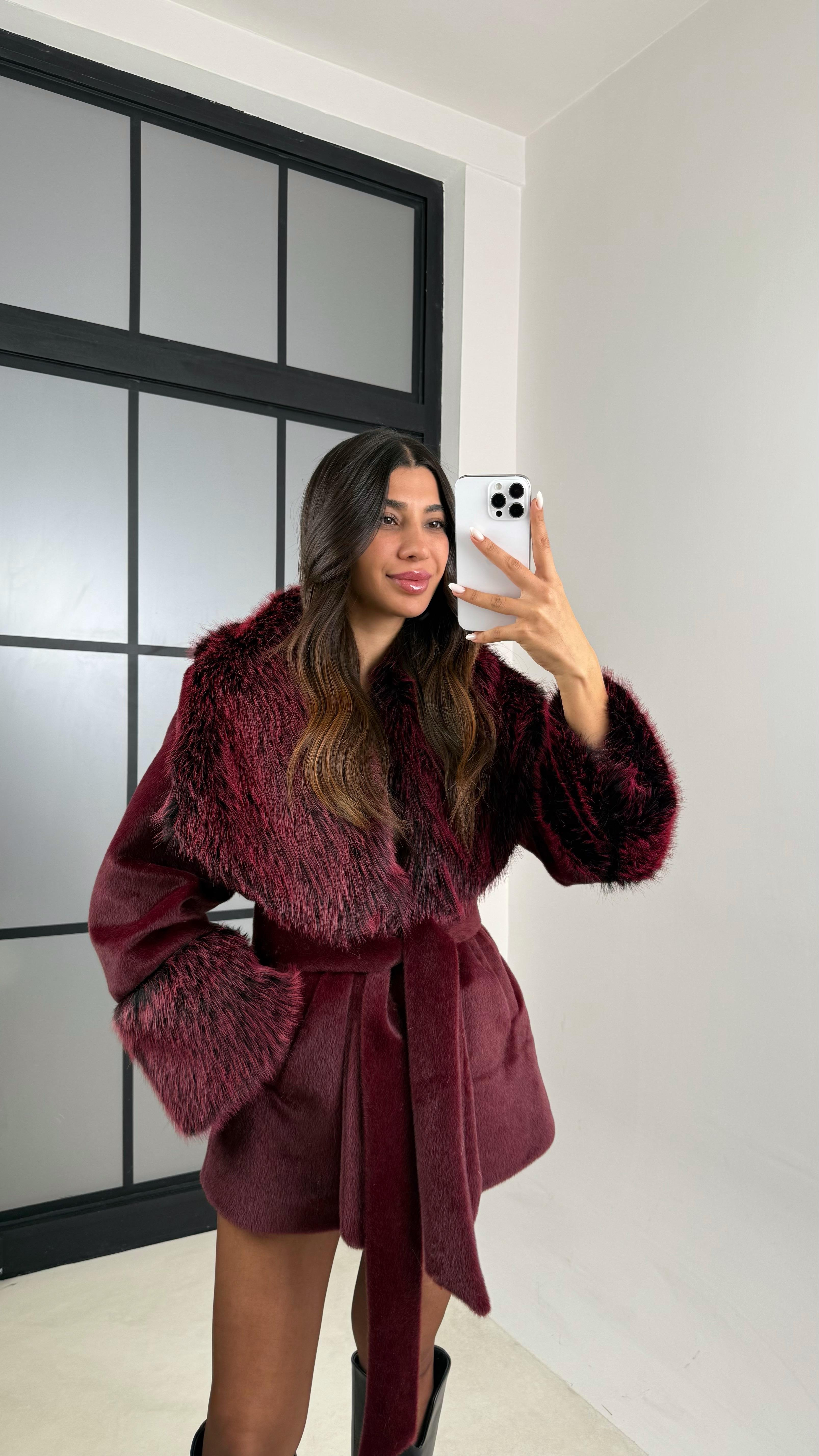 Bordo Kürk Detaylı Astarlı Kaşe Mont GAUS-00559