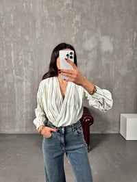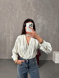 Fanya Mavi Çizgili Ekru Saten Vatkalı Bodysuit
