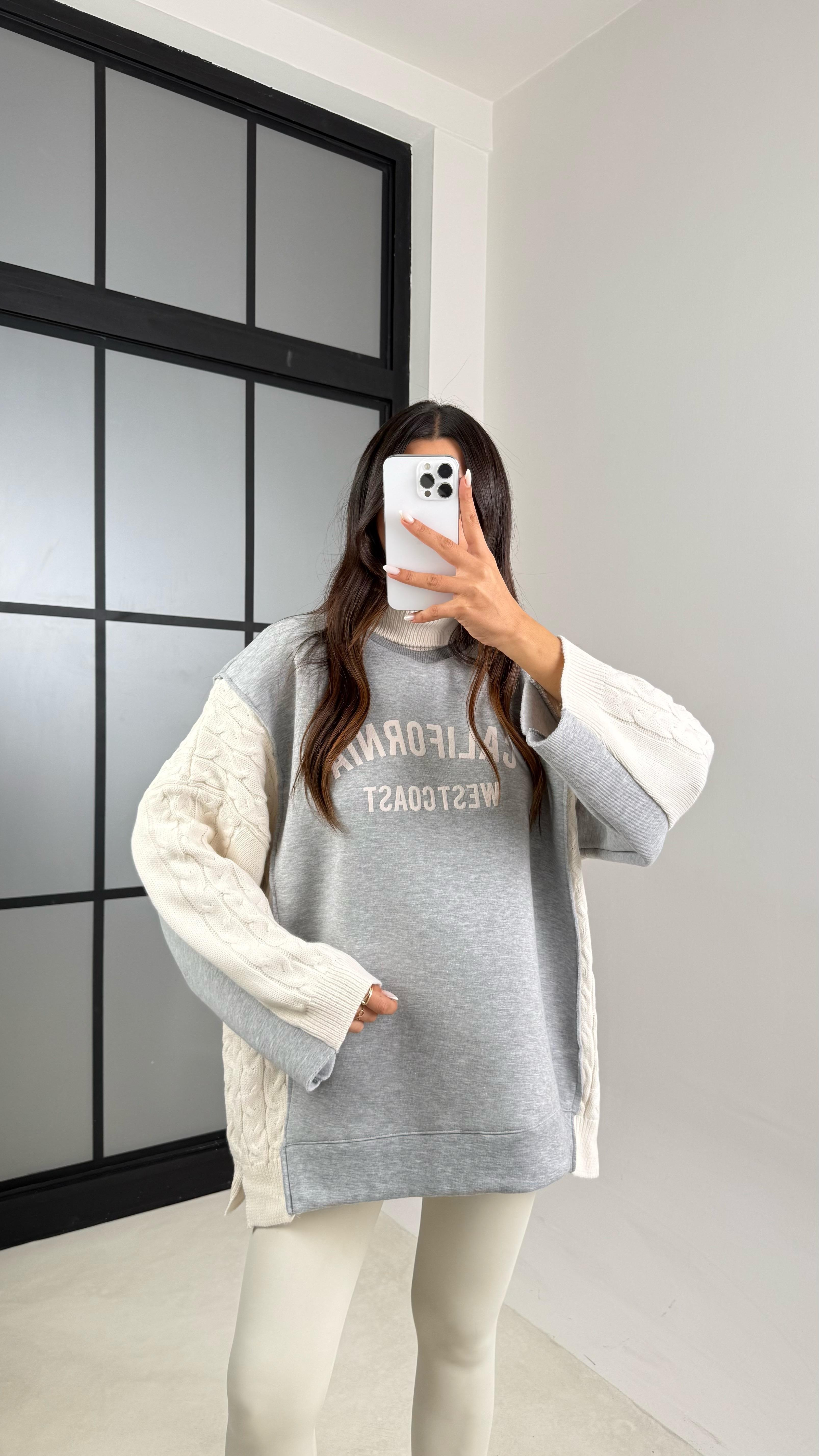 Gri California Yazılı Örgü Detaylı Kazak GAUS-00560