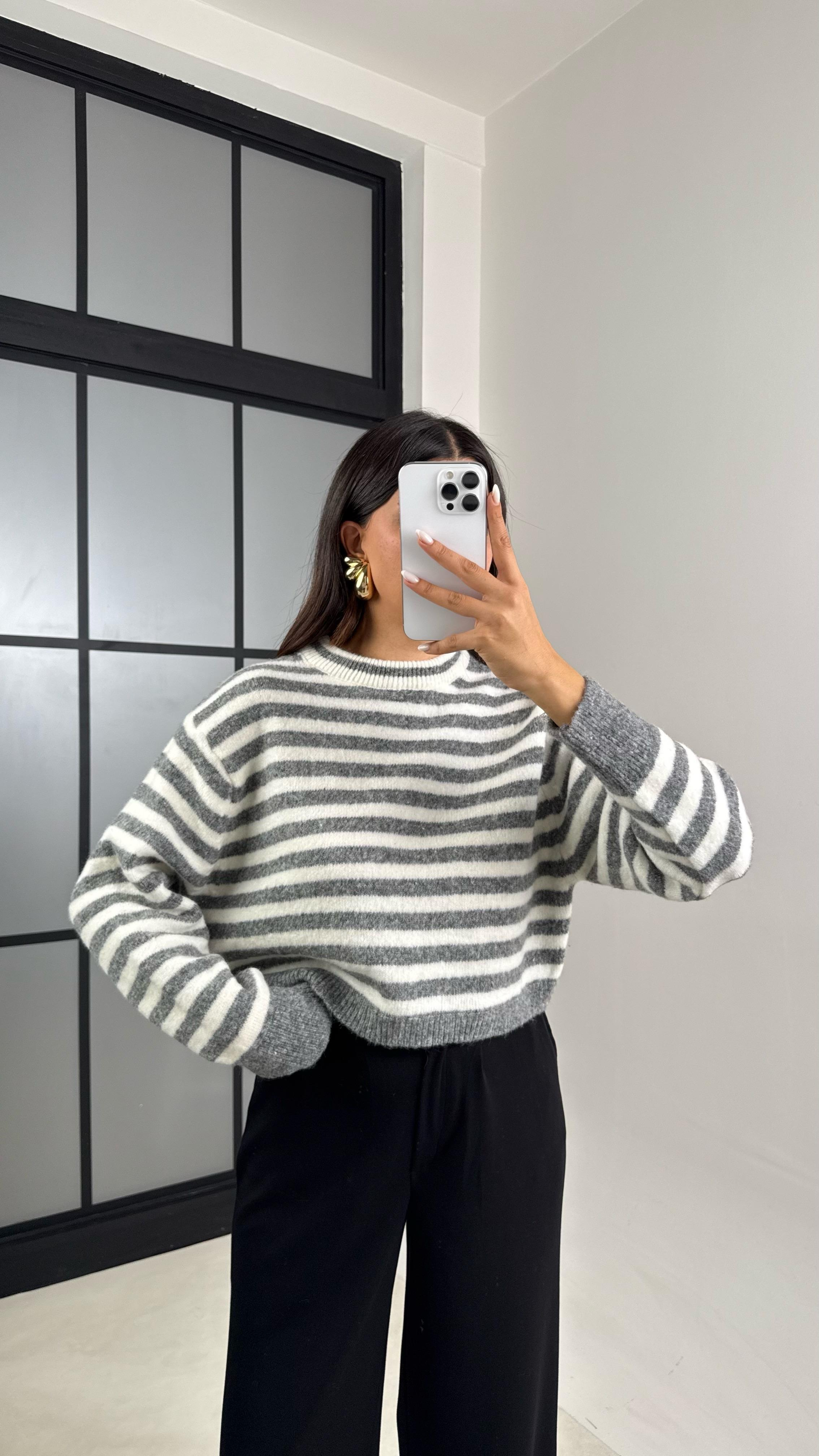 Gri Çizgili Yumuşak Triko Kazak GAUS-00540