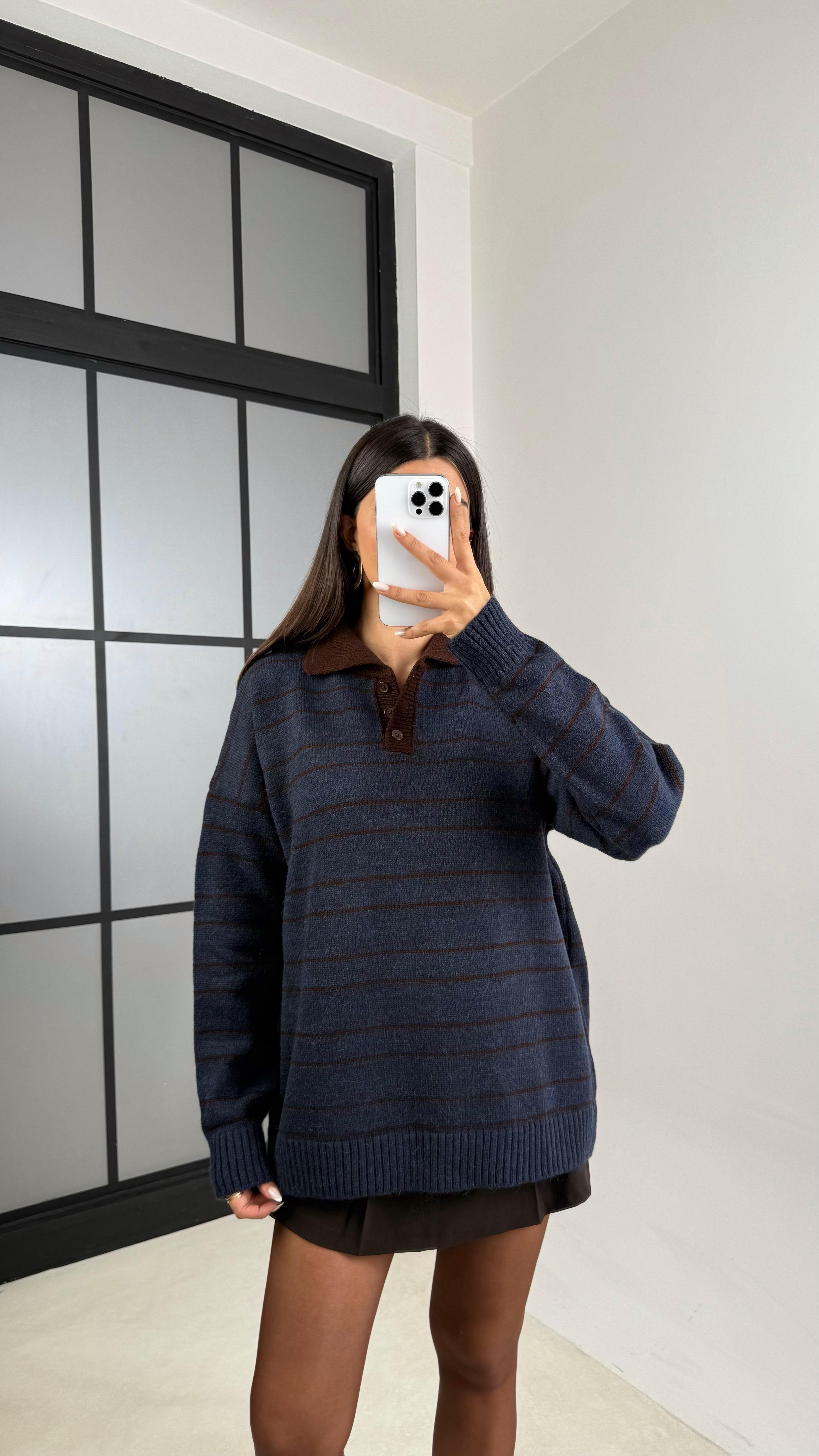 Lacivert Polo Yaka Çizgili Triko Kazak GAUS-00601