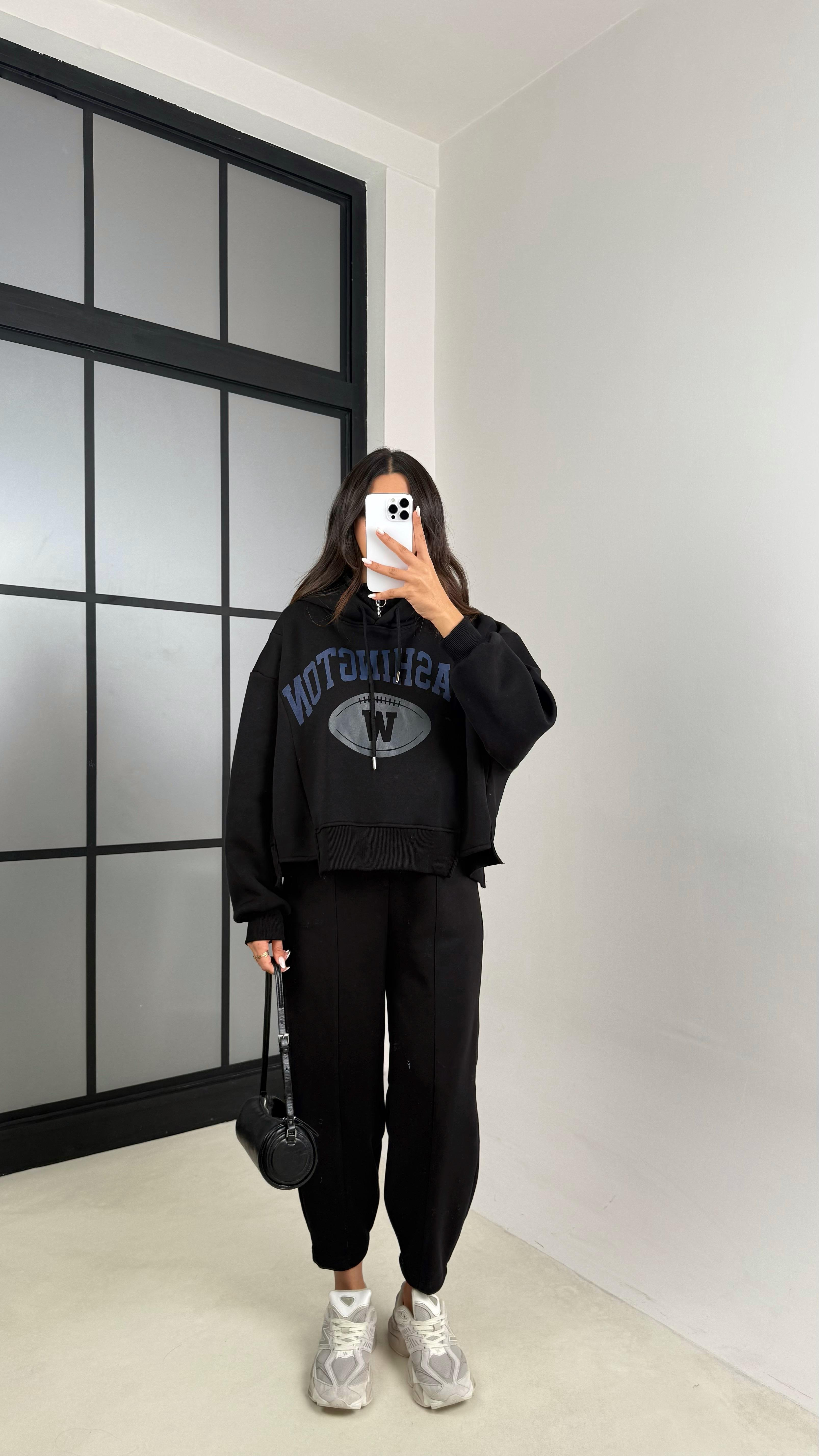 Siyah Kapüşonlu Sweatshirt Beli Lastikli Pantolon 3 İplik Şardonlu Takım GAUS-00530