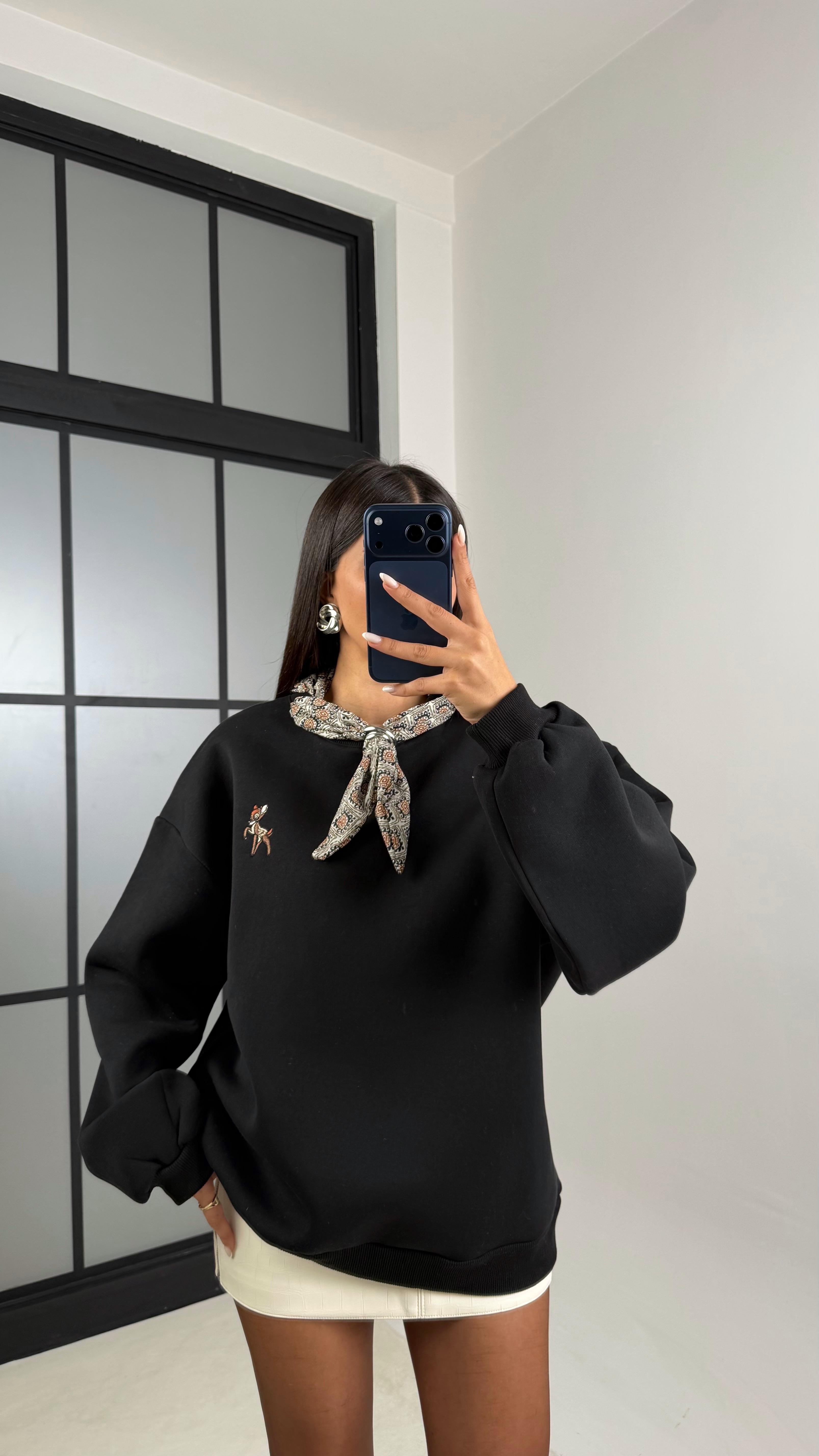 Siyah Yaka Fular Detaylı Şardonlu Sweatshirt GAUS-00646