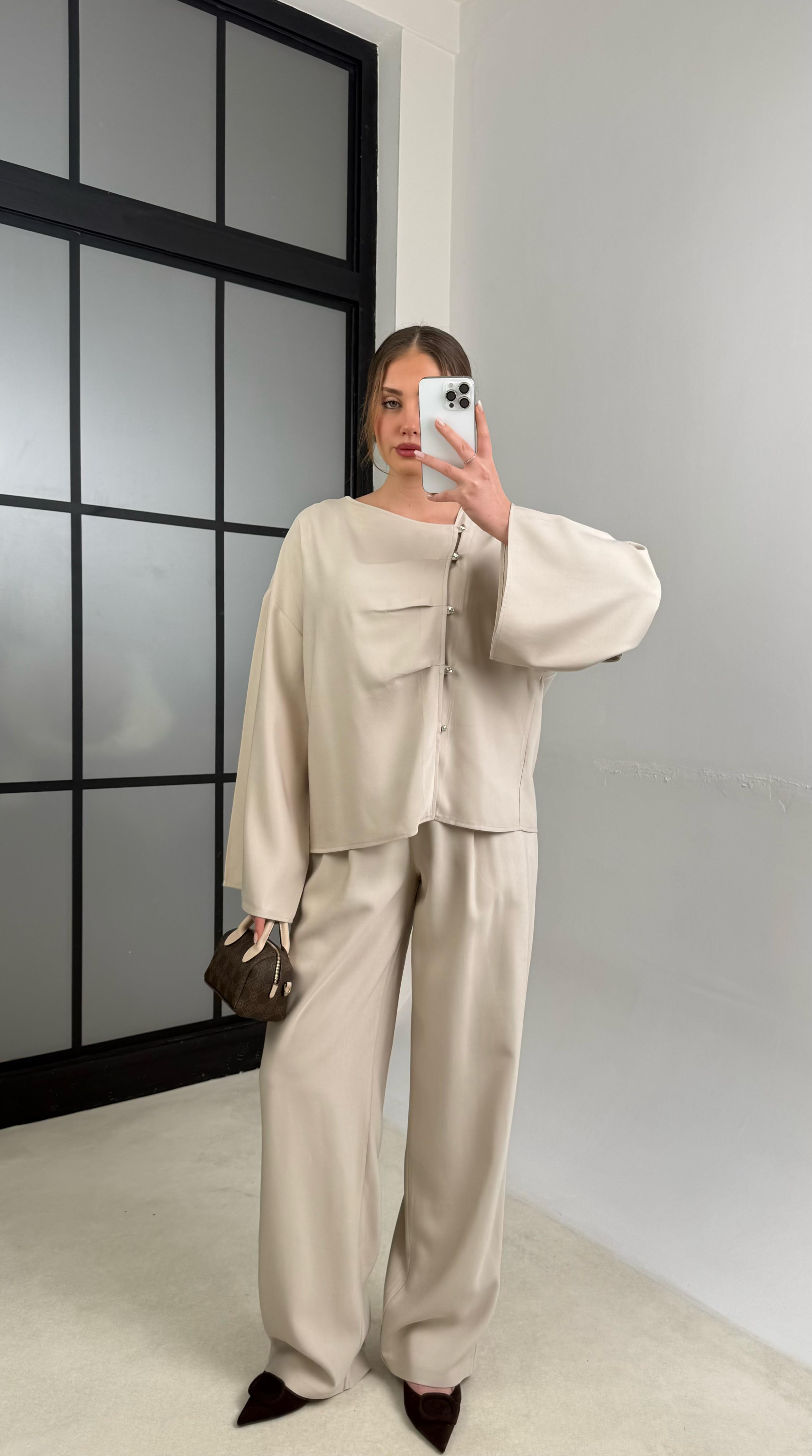 Taş Asimetrik Yaka Yan Düğme Detaylı Gömlek Beli Lastikli Pantolon Tensel Takım GAUS-01163GAUSSuitsGAUS-01163