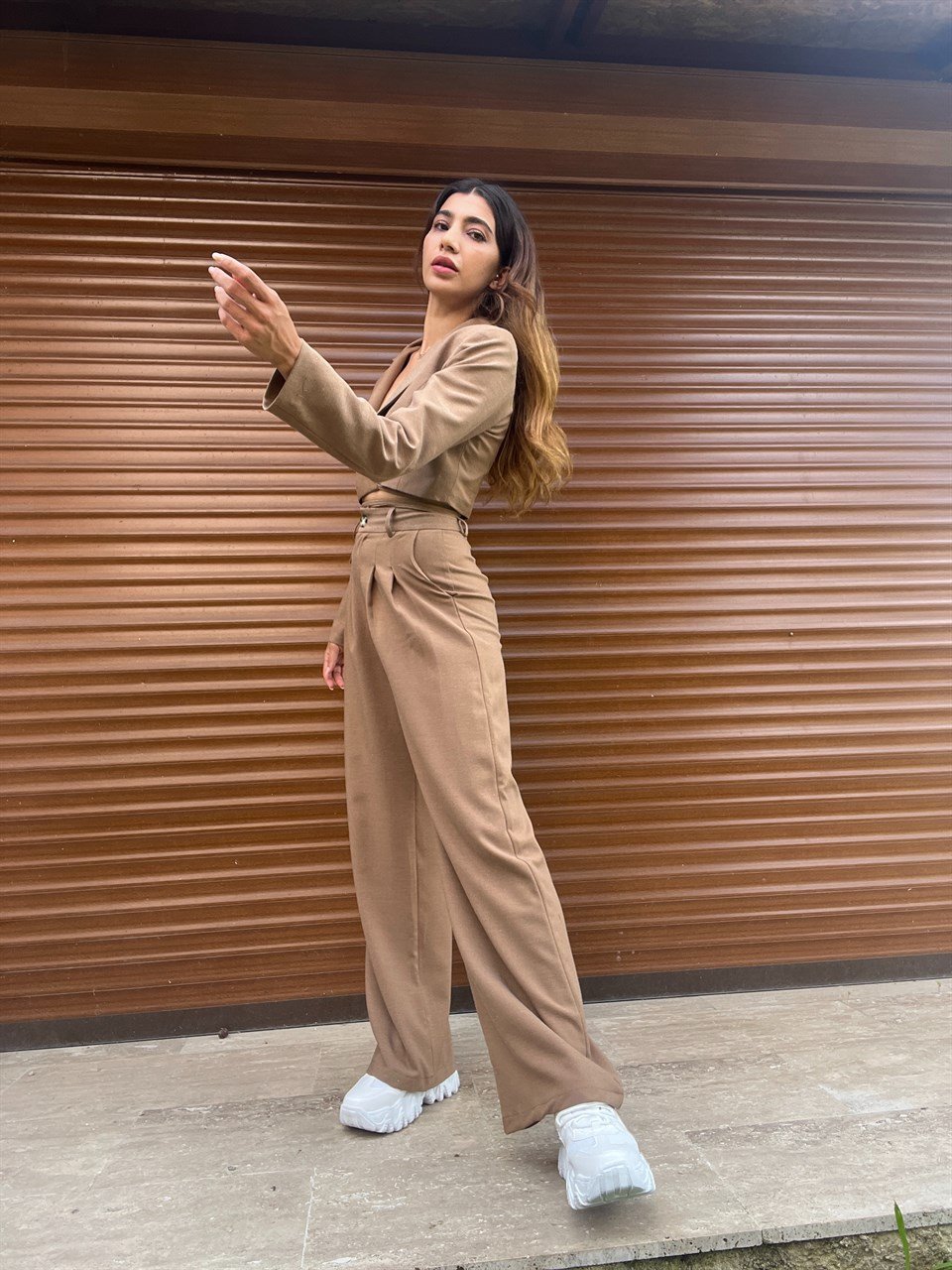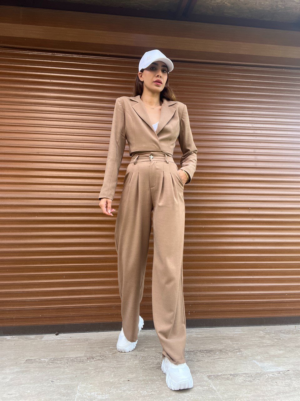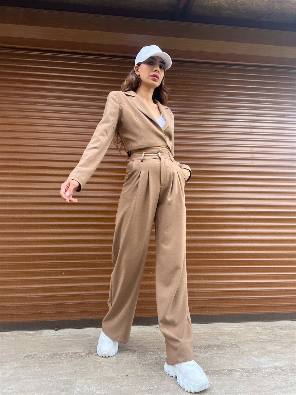 Vizon Keten Crop Blazer Pantolon İkili Takım