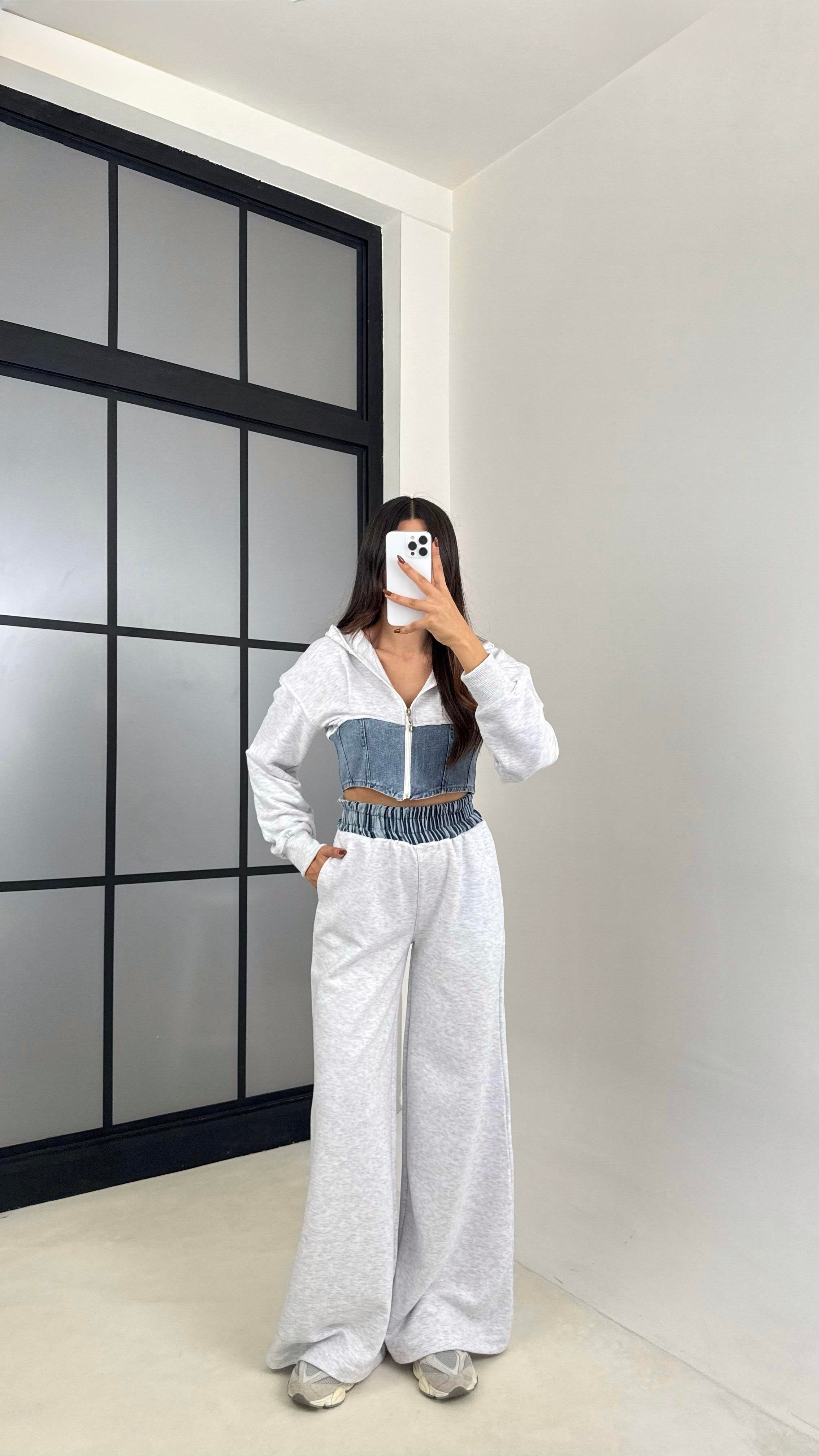 Gri Denim Detaylı Kapüşonlu Hırka Beli Lastikli Pantolon Tasarım Takım GAUS-00444