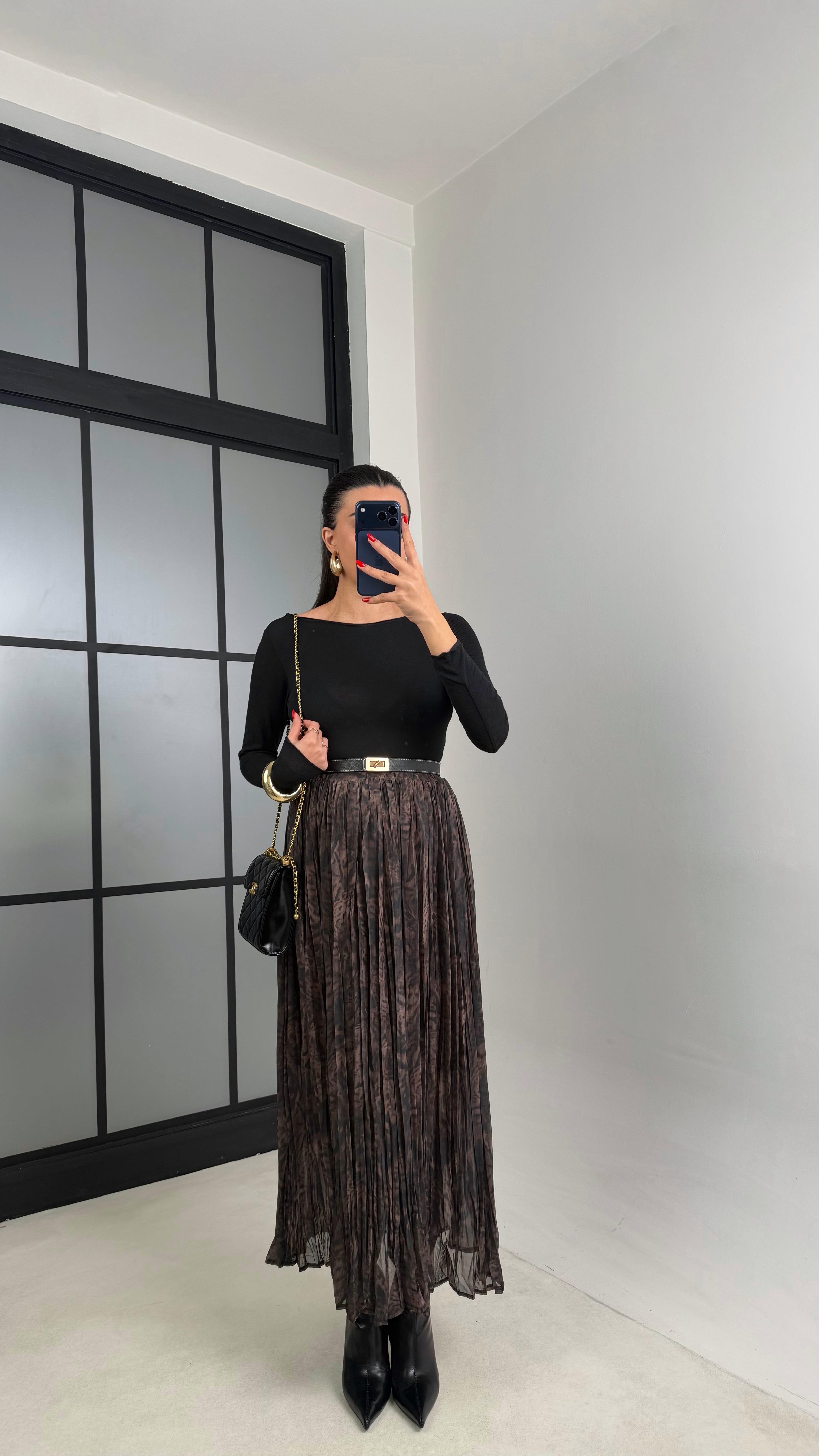 Kahve Desenli Beli Lastikli Yarım Astarlı Şifon Etek GAUS-00923