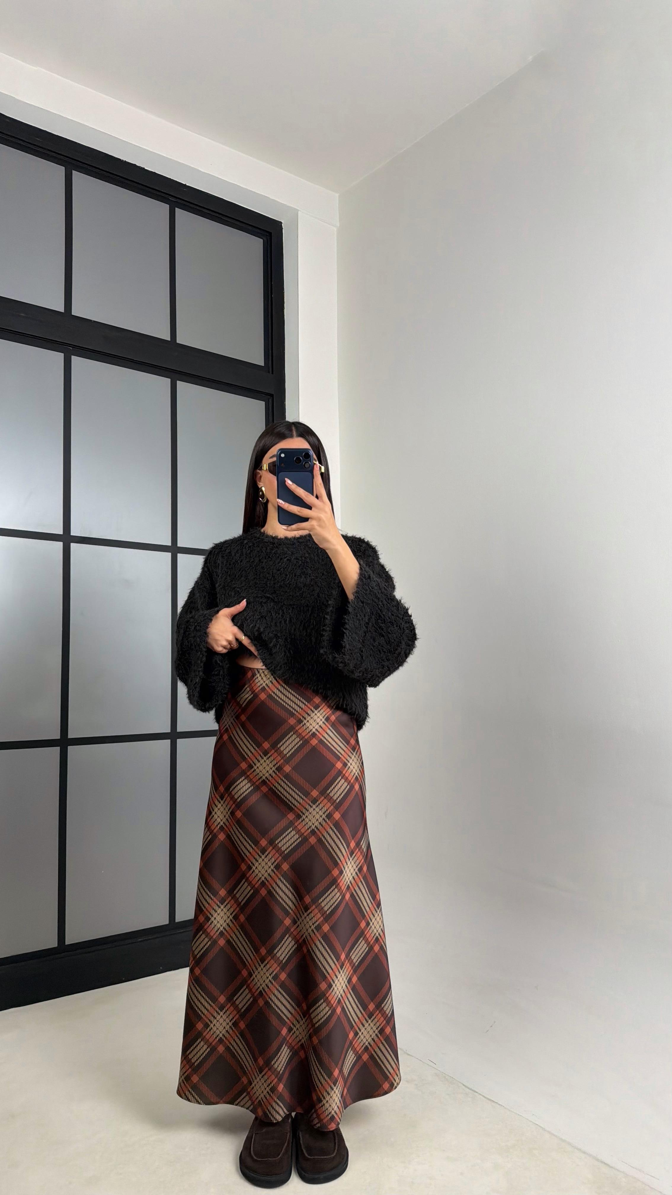 Kahve Ekose Desenli Beli Lastikli Saten Etek GAUS-00820 GAUS-00819GAUSETEKGAUS-00820