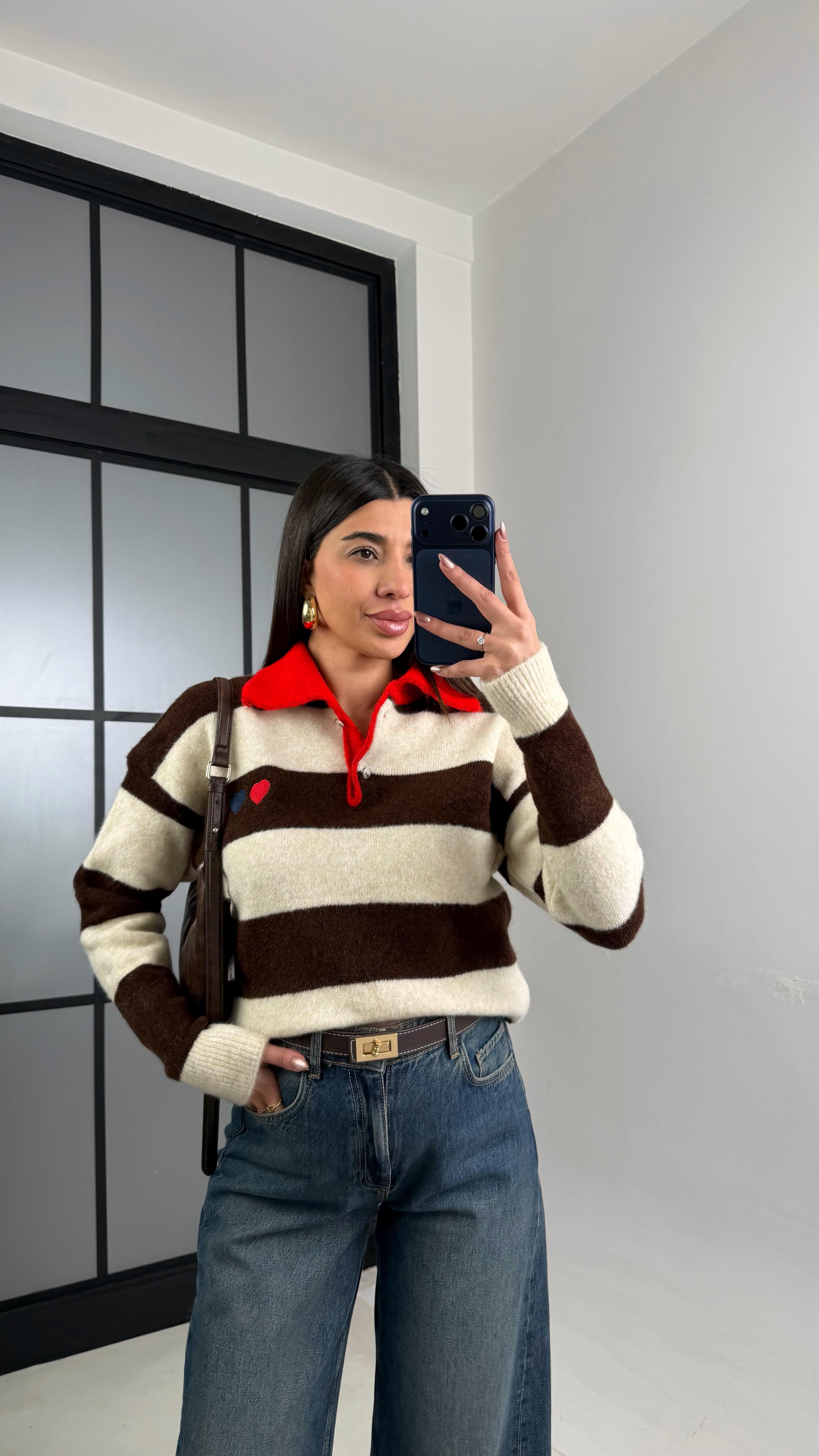Kahve Polo Yaka Çizgili Yumuşak Dokulu Kazak GAUS-01099