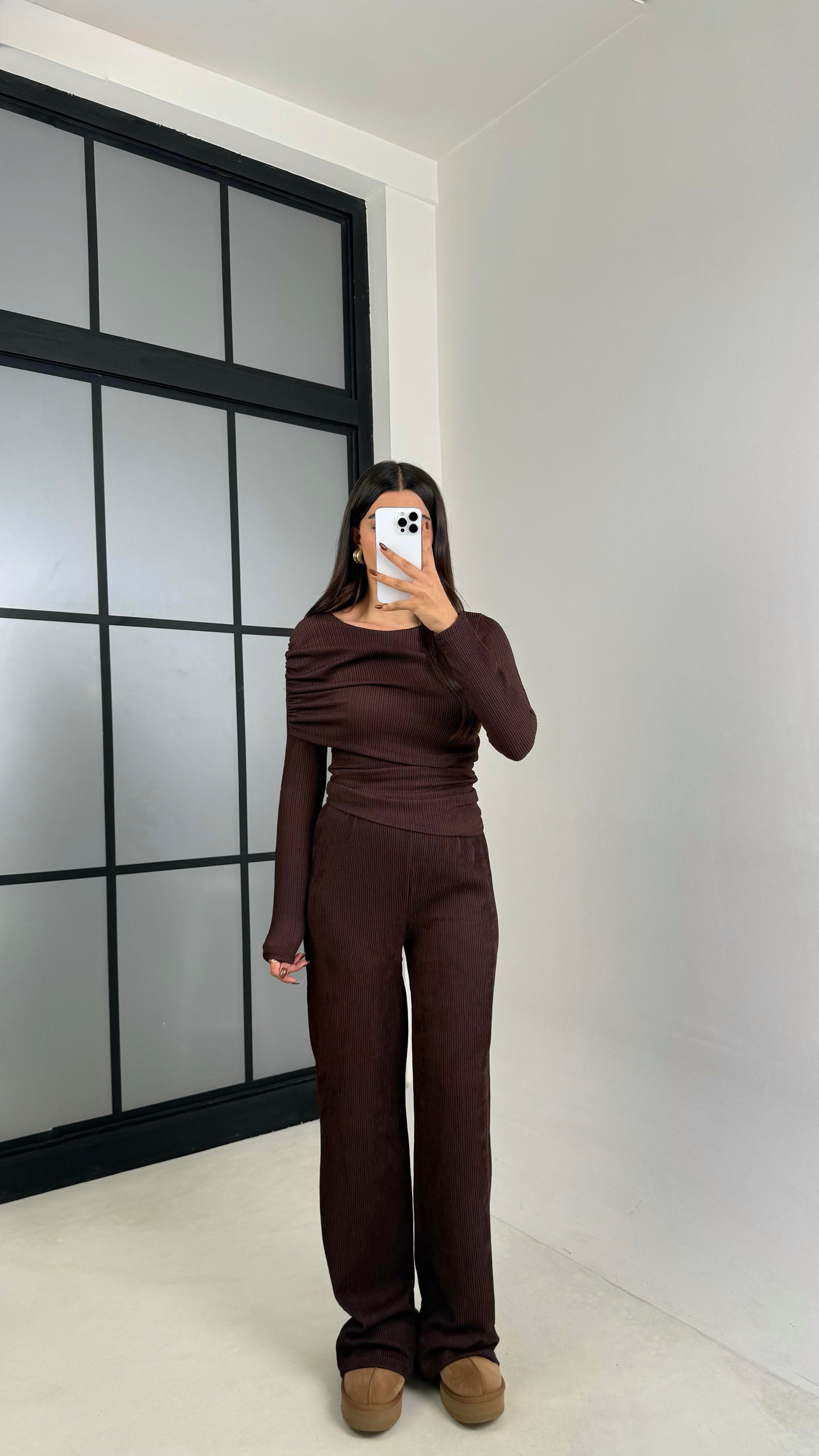 Kahve Yaka Detaylı Bluz Beli Lastikli Pantolon Gofre Kumaş Takım GAUS-00229