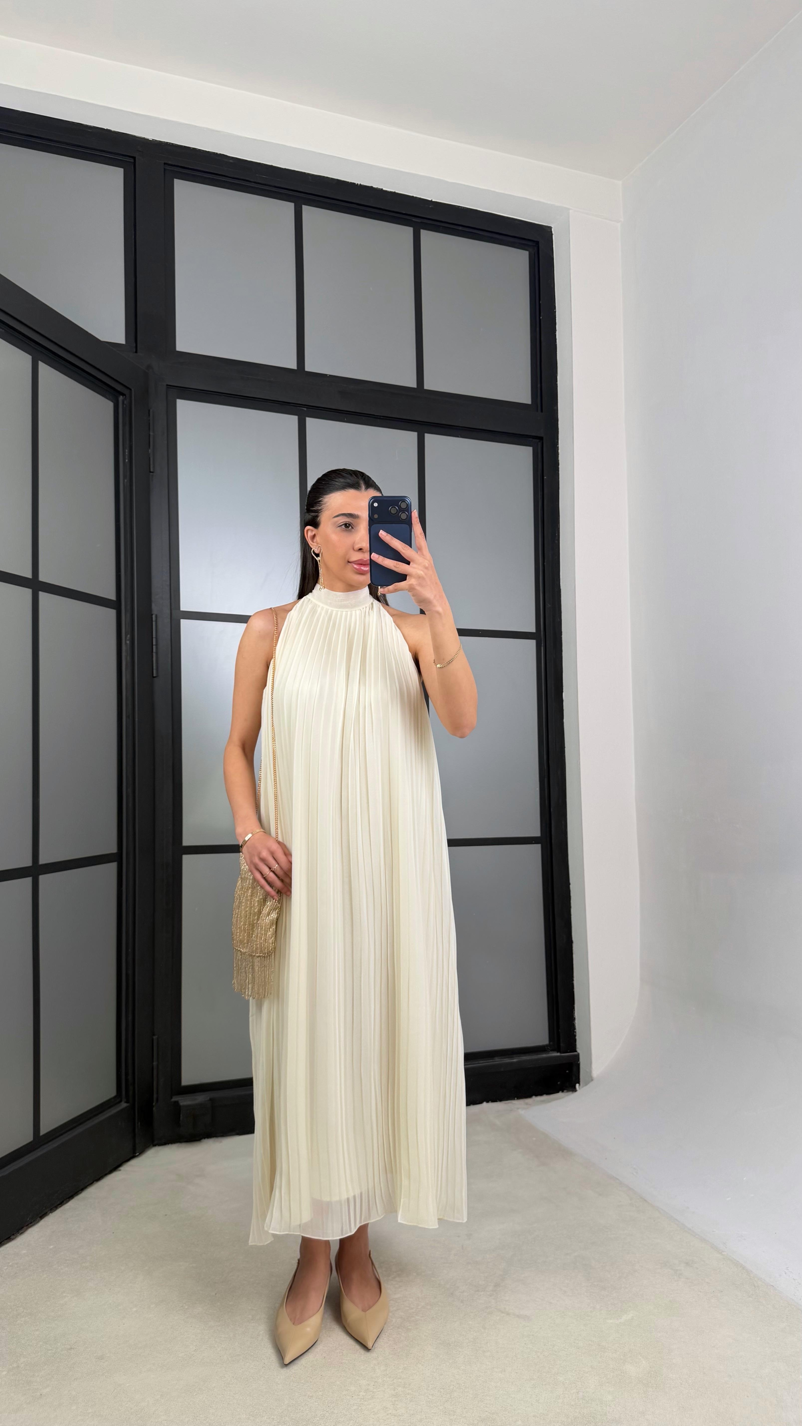 Krem Boyundan Bağlamalı Astarlı Pileli Tasarım Elbise GAUS-01363GAUSELBİSEGAUS-01363