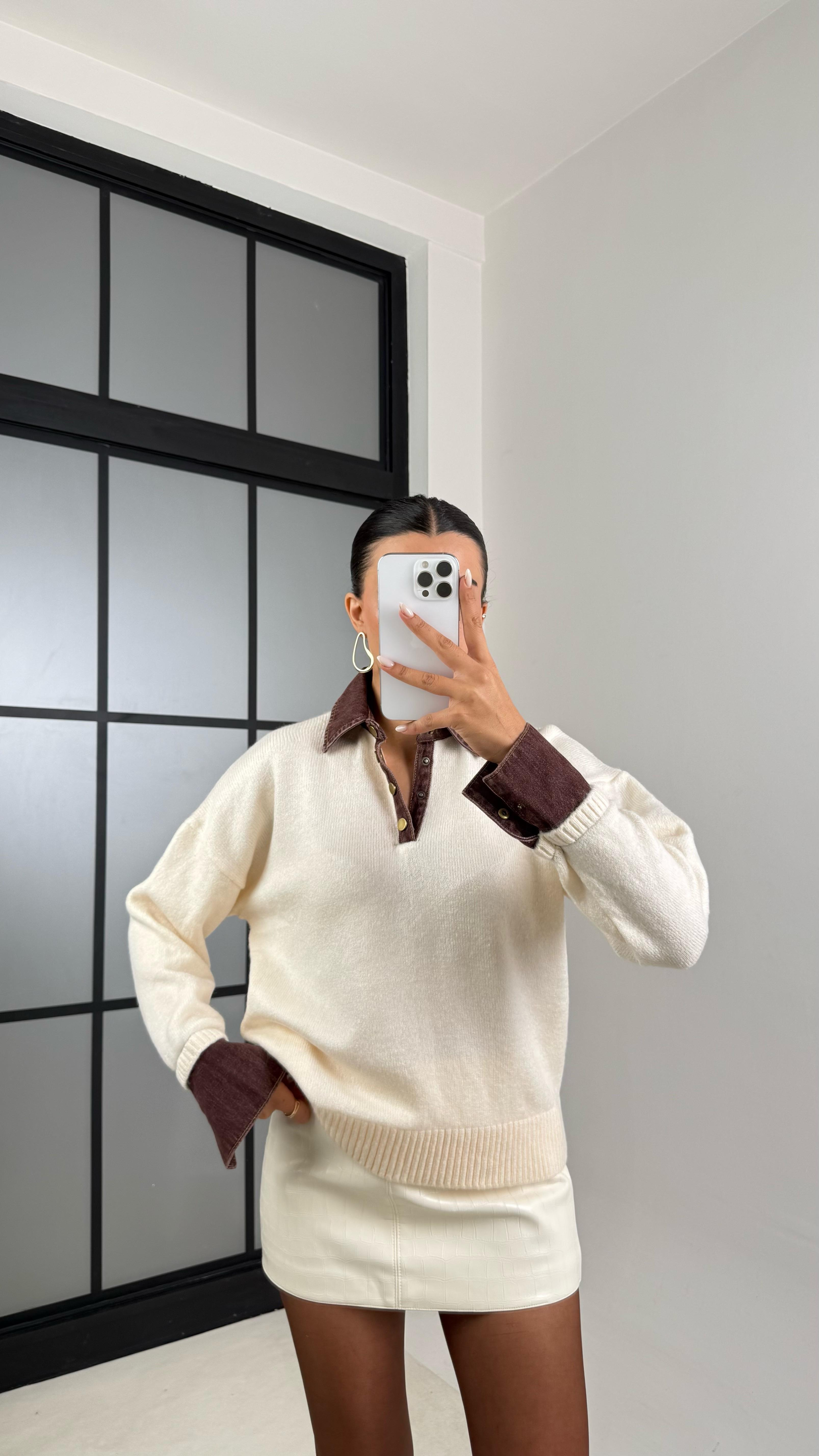 Krem Denim Yaka Detaylı Kazak GAUS-00507