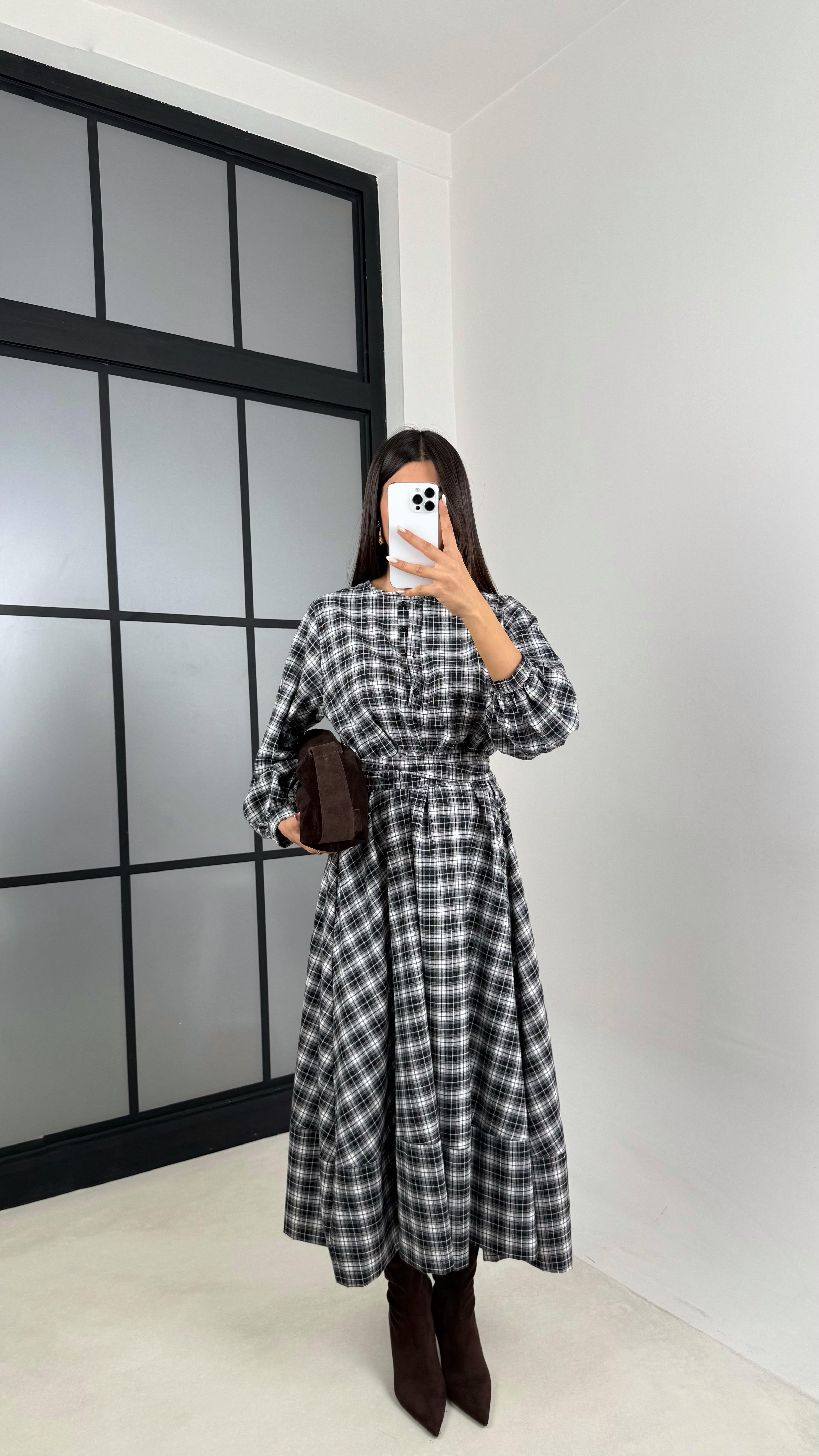 Siyah Balon Kol Ekoseli Kuşaklı Cepli Elbise GAUS-00570GAUSELBİSEGAUS-00570