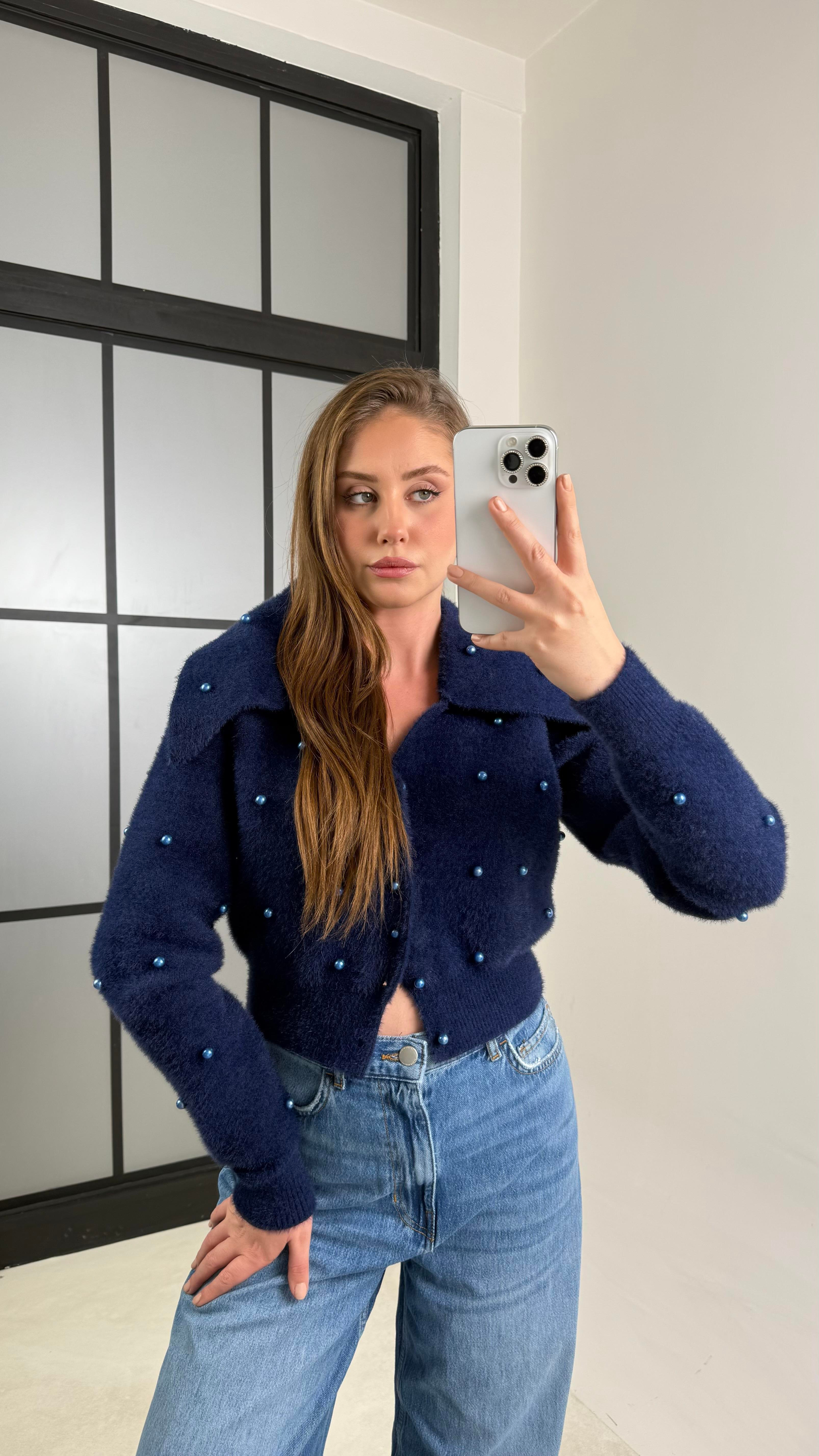 Lacivert Boncuk İşlemeli Yakalı Hırka GAUS-00765