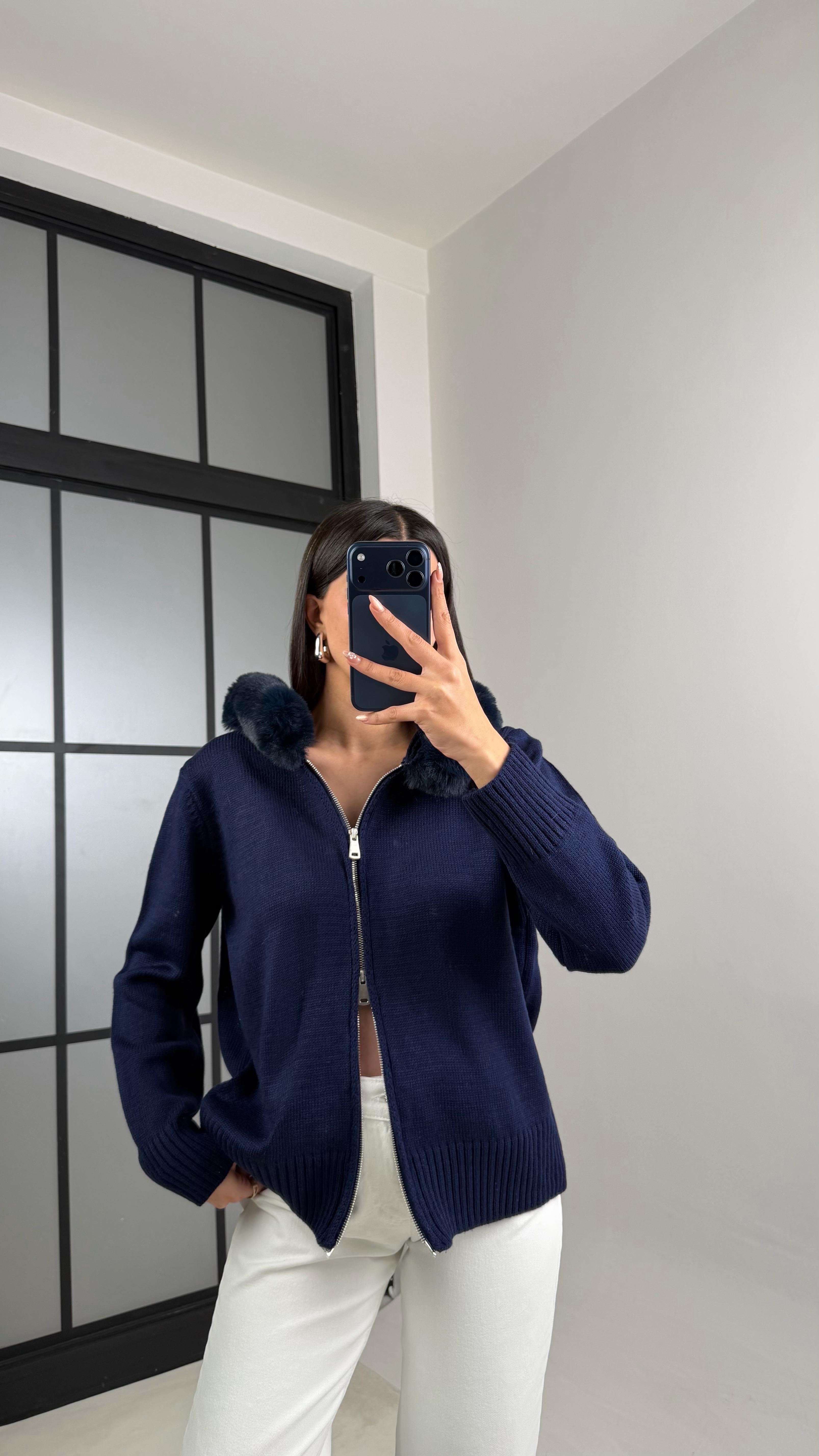 Lacivert Kürk Detaylı Kapüşonlu Triko Hırka GAUS-00883