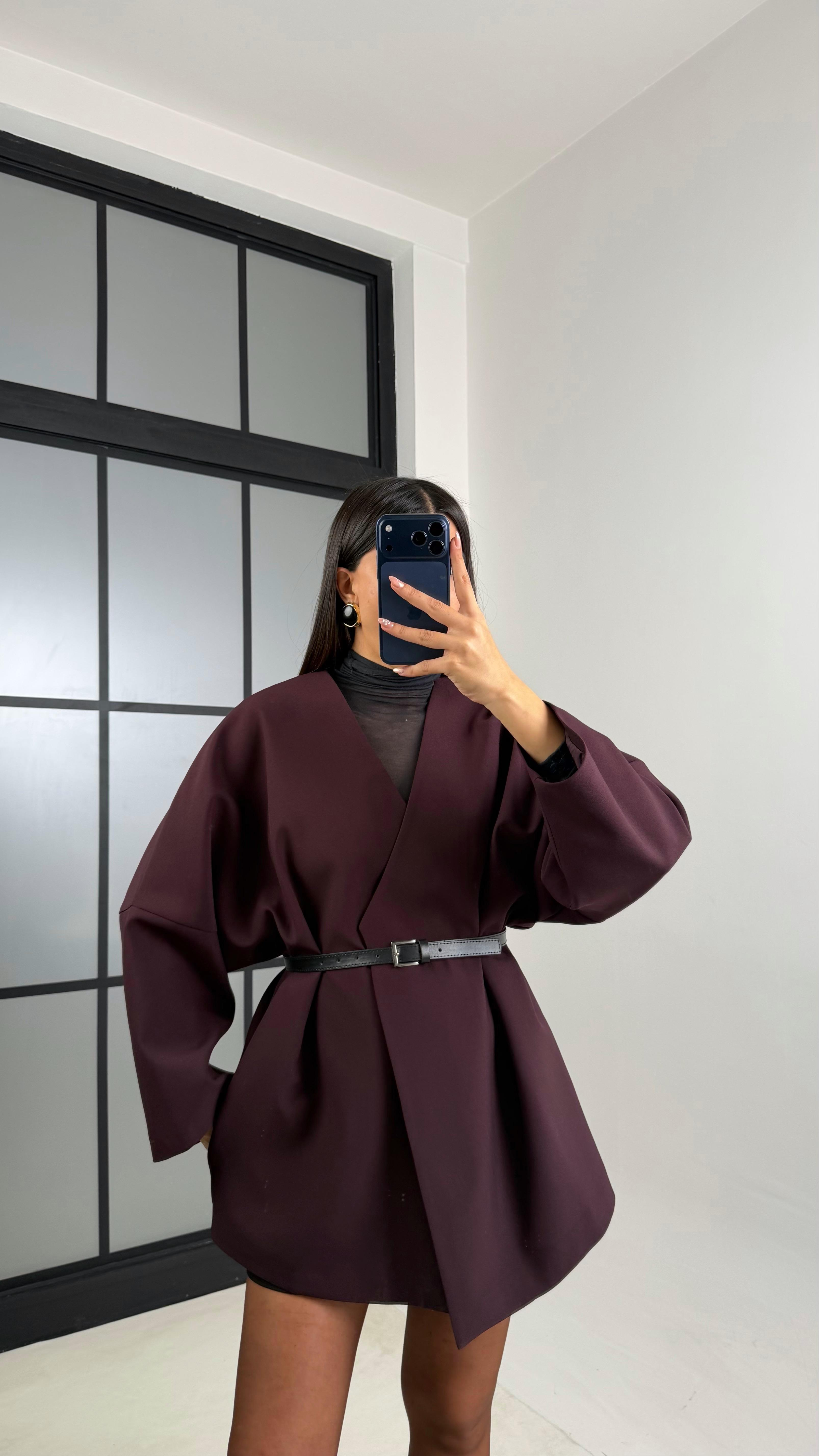 Mürdüm Kemerli Astarlı Cepli Premium Ceket GAUS-00818