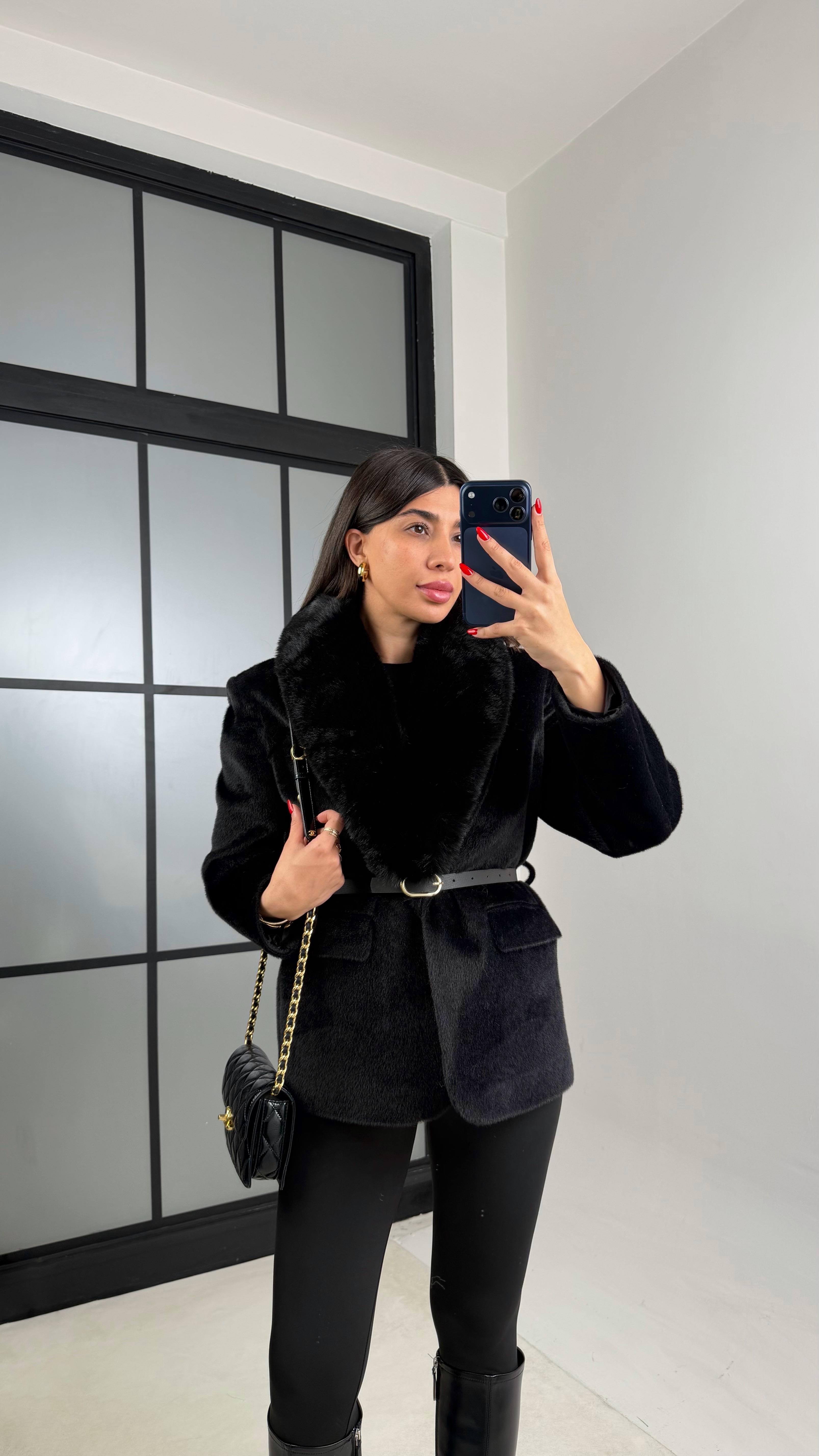 Siyah Astarlı Kemerli Premium Kürk Ceket GAUS-00936