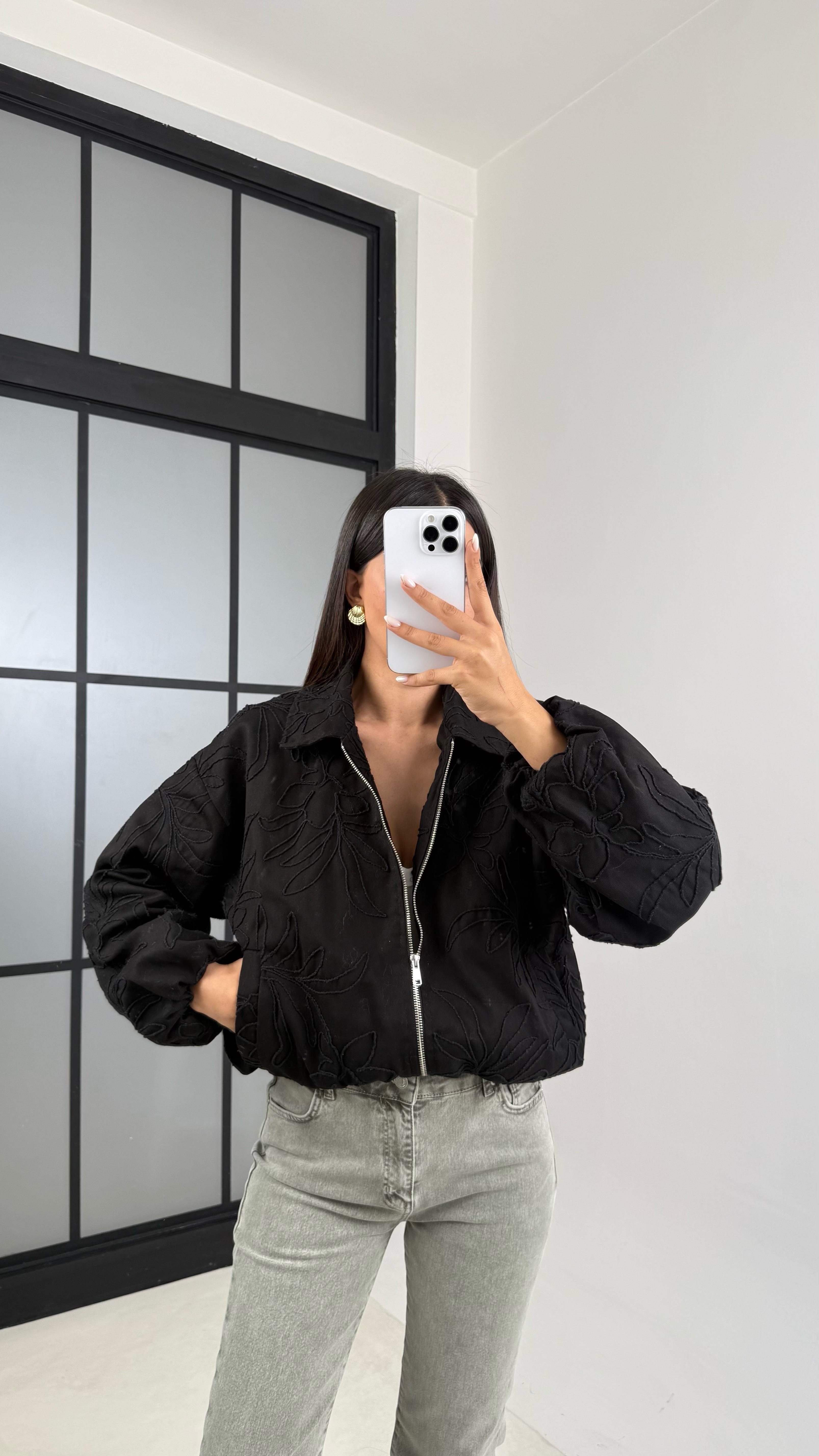 Siyah Çiçek Nakışlı Astarlı Cepli Tasarım Ceket GAUS-00451