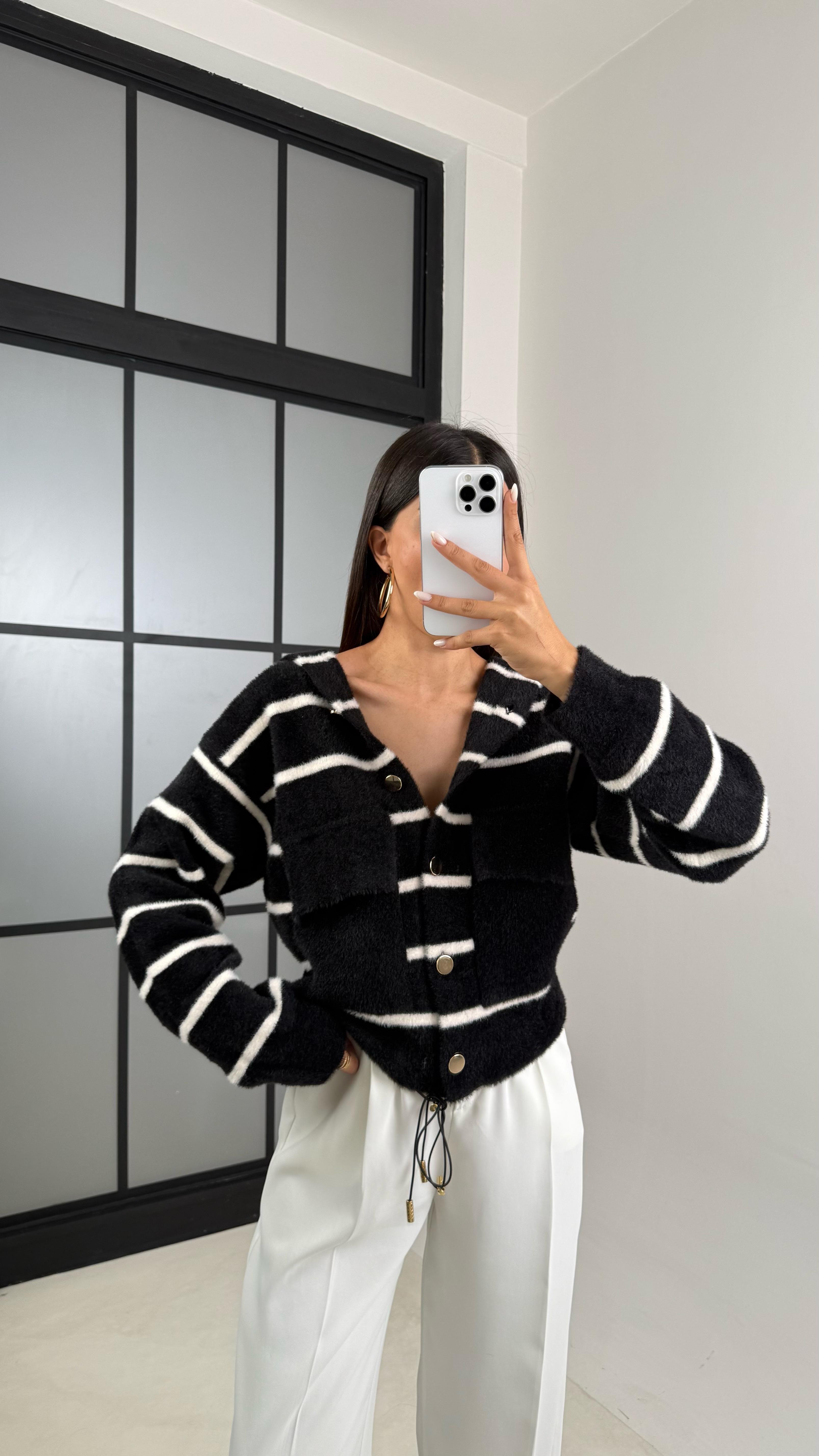 Siyah Çizgili Kapüşonlu Düğme Detaylı Hırka GAUS-00468GAUSHIRKAGAUS-00468