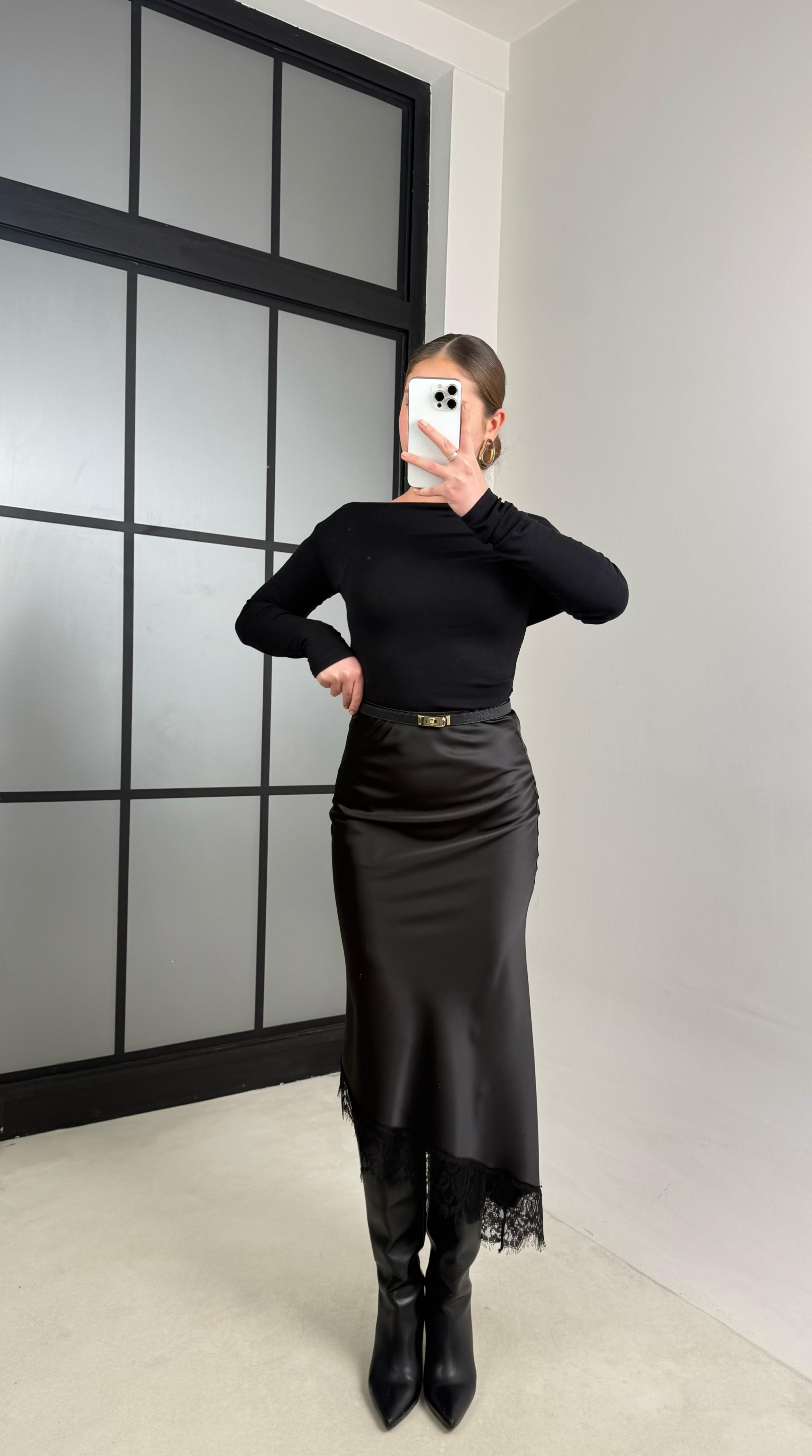 Siyah Dantel Detaylı Asimetrik Kesim Saten Etek GAUS-00860